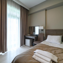 В номере имеются 1 кровать, стул, стол туалетный с зеркалом, набор посуды (графин и две чашки), 1 прикроватная тумбочка, 1 прикроватное бра, телевизор, холодильник, телефон, сейф, шкаф. Санузел оснащен душевой кабиной, умывальником, унитазом, зеркалом с подсветкой, феном, сушилкой для белья.