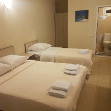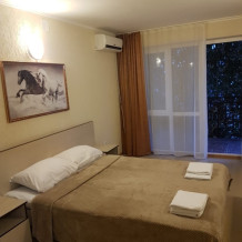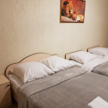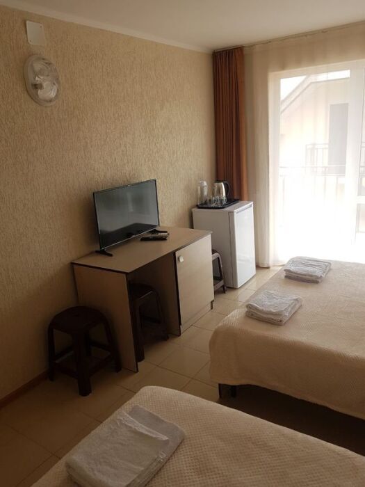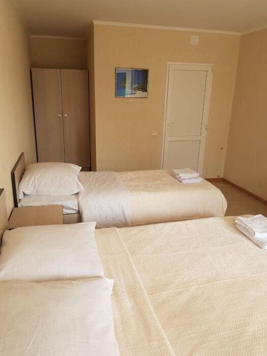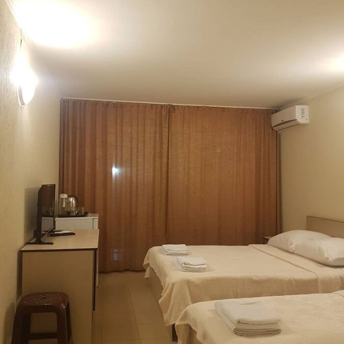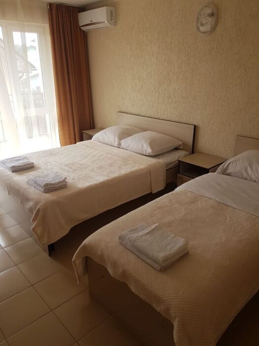 В номере двуспальные кровати (спальное место 160*200), односпальные кровати (спальное место 90×200), шкаф-ниша для одежды, зеркало, прикроватные тумбочки, телевизор, холодильник, кондиционер.