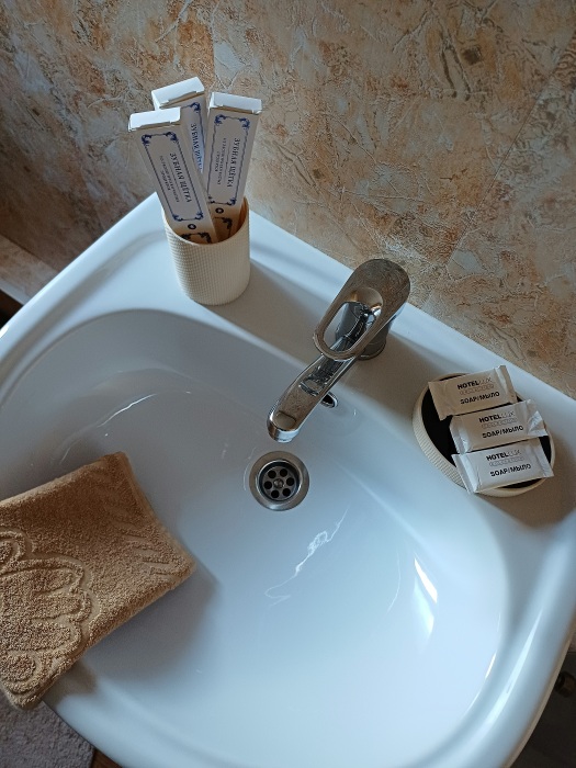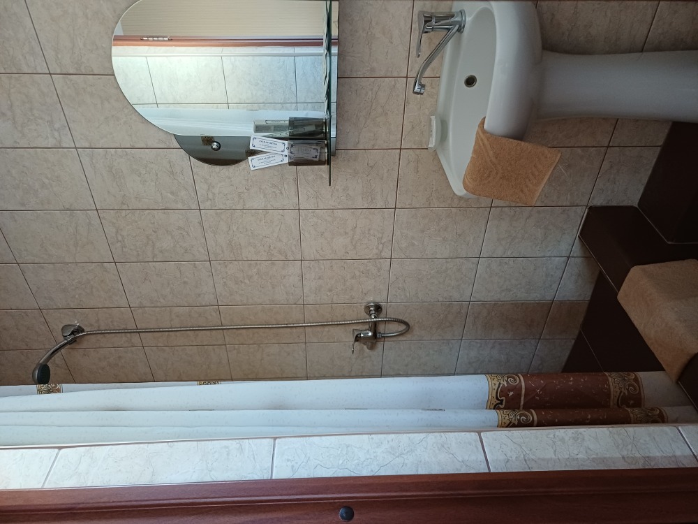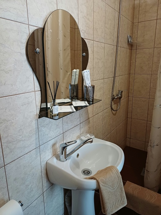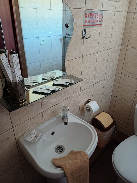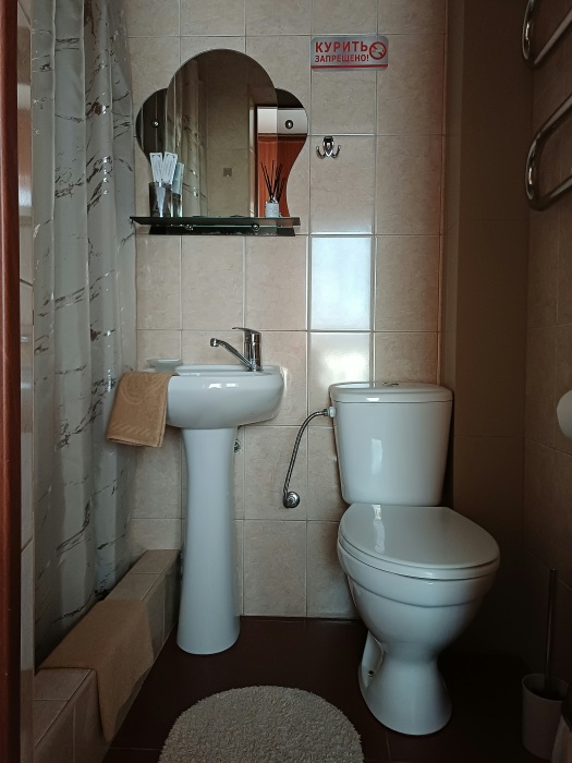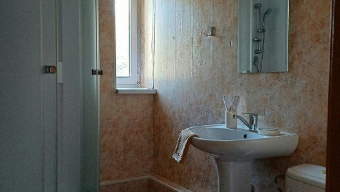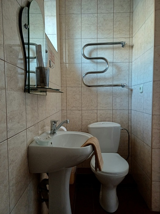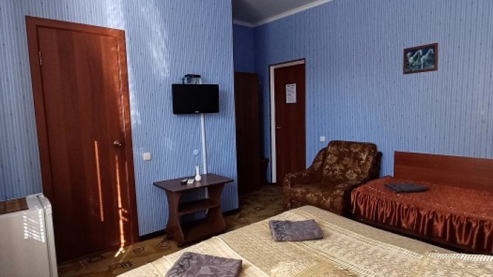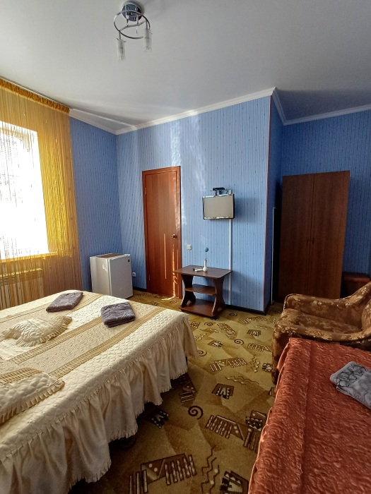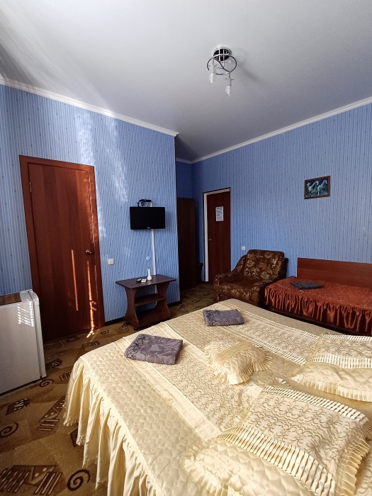 Трёхместный номер улучшенный расположен на 3 этаже. В номере:двуспальная и односпальная кровати, кресло раскладное, прикроватные тумбочки, шкаф, журнальный стол, телевизор, сплит-система.Wi-fi на всей территории. Санузел совмещённый в номере. Кухня общего пользования на 1-ом этаже со всем необходимым для приготовления пищи:посуда, столовые приборы, свч (07:00-22:00). Для гостей с автомобилем (при наличии места) бесплатная парковка под шлагбаумом.