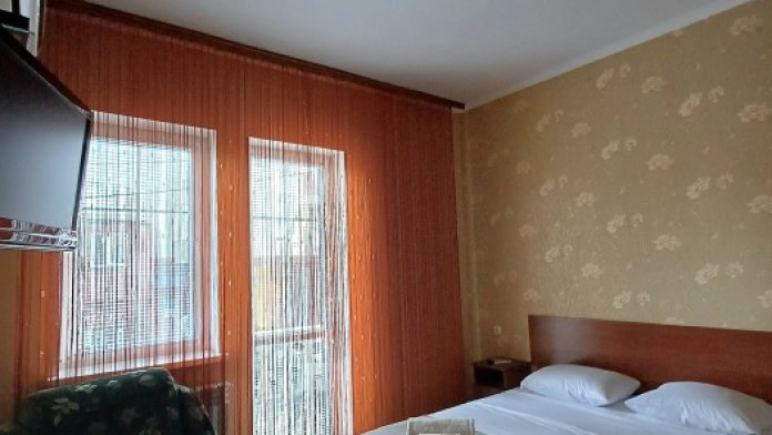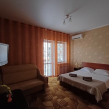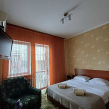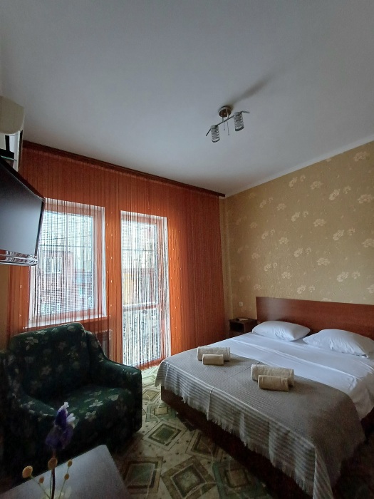 Двухместный номер с балконом расположен на 2 этаже. В номере: двуспальная кровать, сплит-система, телевизор, холодильник, журнальный стол, москитная сетка. Санузел совмещённый в номере. На 1-ом этаже кухня общего пользования со всем необходимым для приготовления пищи:посуда, столовые приборы, свч (08:00-22:00). Для гостей с автомобилем (при наличии места) бесплатная парковка под шлагбаумом.