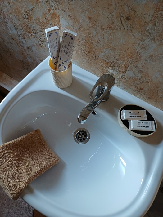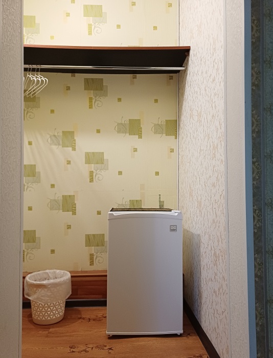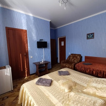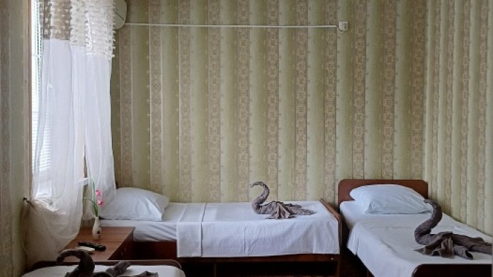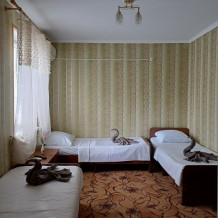 Трёхместный классический номер с тремя односпальными кроватями. Совмещённый санузел в номере, сплит-система, телевизор, холодильник, журнальный стол, пуфик, прикроватные тумбочки. Wi-fi на всей территории. Кухня общего пользования на 1-ом этаже со всем необходимым для приготовления пищи:посуда, столовые приборы, свч (07:00-22:00). Для гостей с автомобилем (при наличии места) бесплатная парковка под шлагбаумом.
