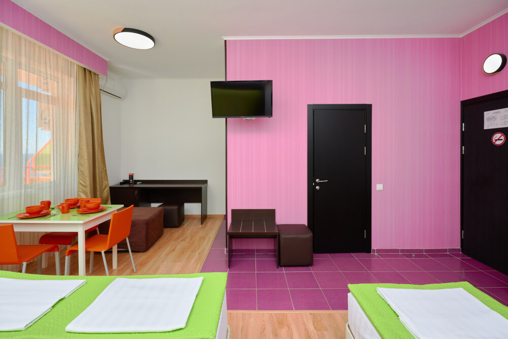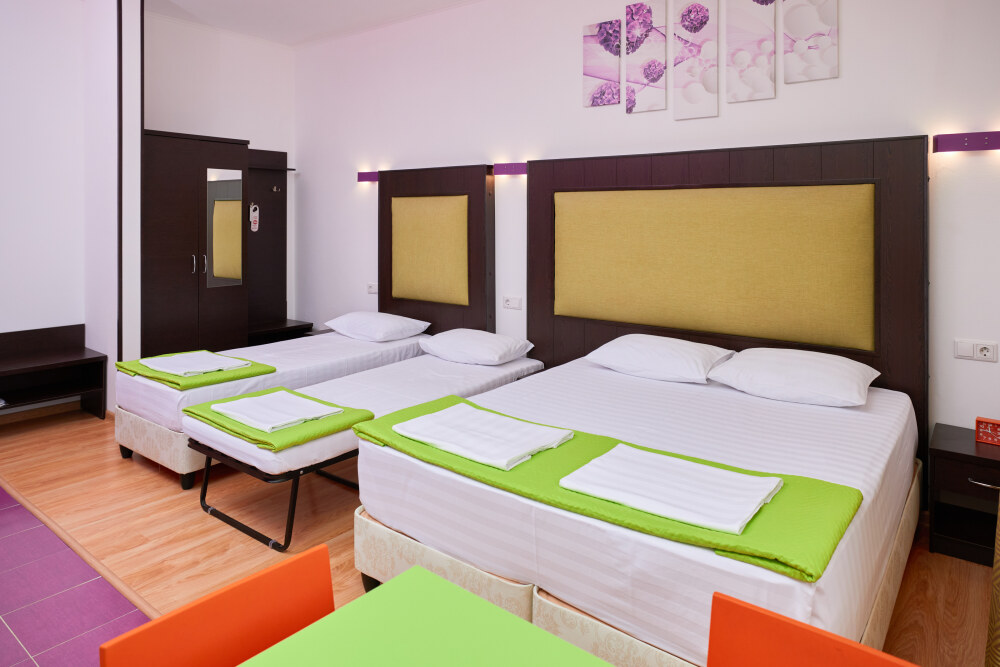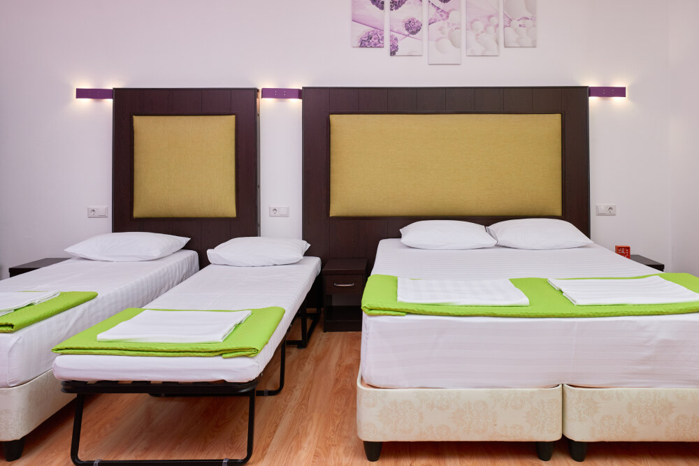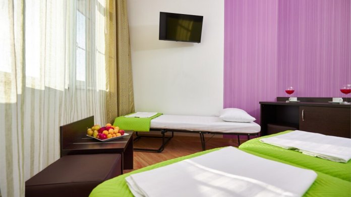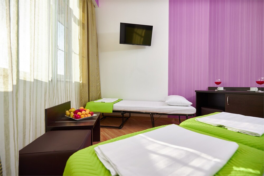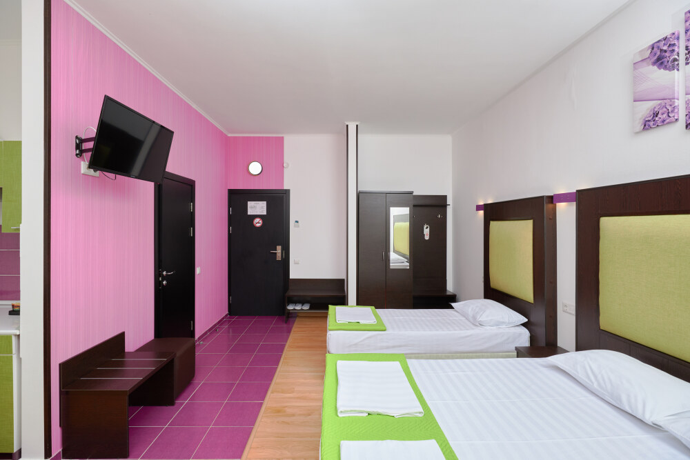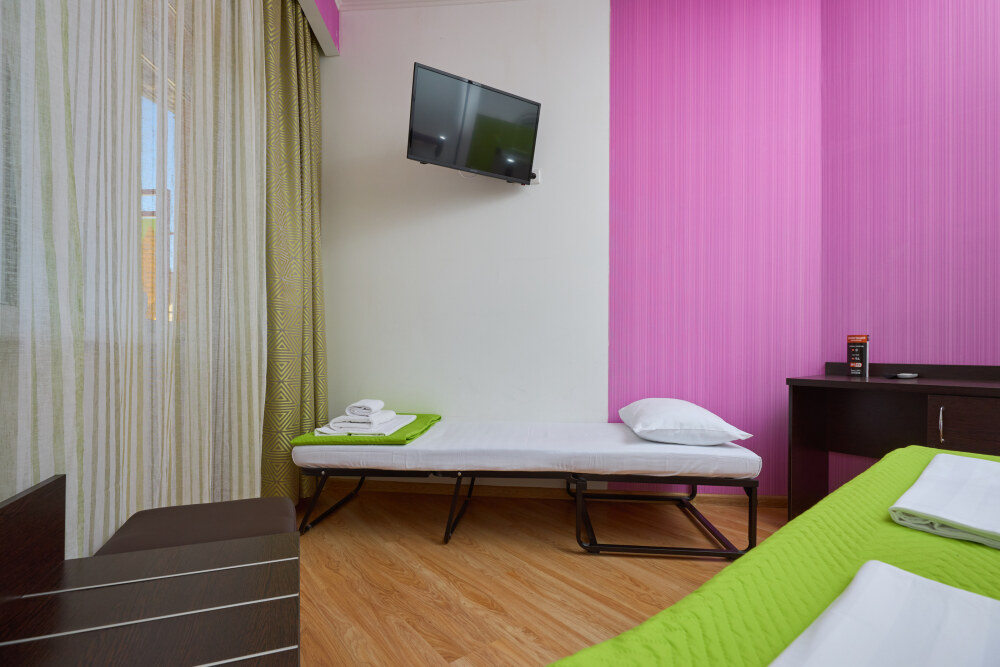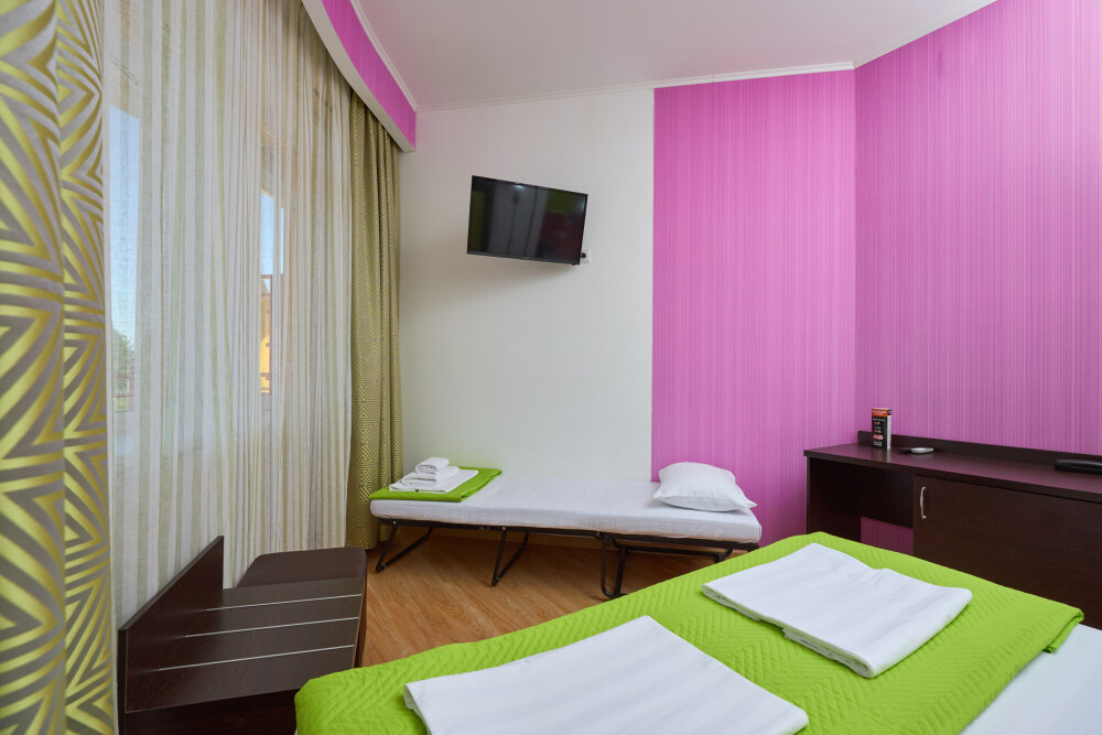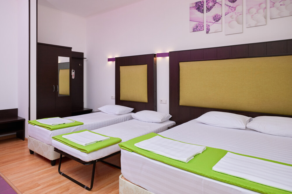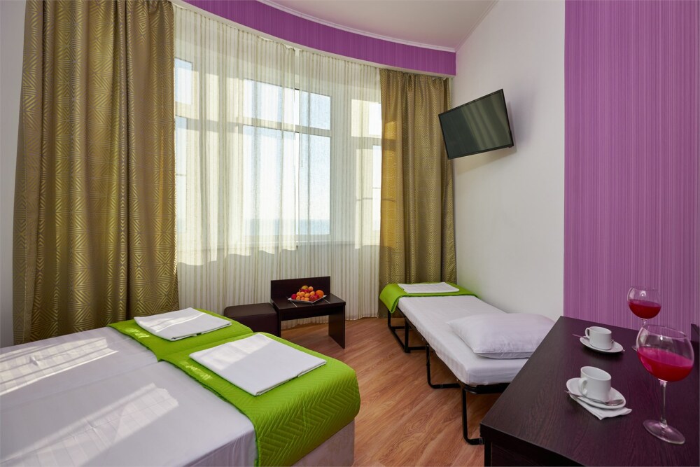 3-х местный номер Эконом без балкона подойдет для бюджетного размещения 3-4 человек оборудован кухонным уголком с обеденным столом, столовой посудой и эл.чайником. Для размещения 4го гостя в номере есть пуф, трансформирующийся в полноценную дополнительную кровать. Возможно размещение ребенка 3-6 лет на кровати с родителями или люля для ребенка 0-3 года.