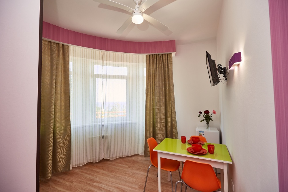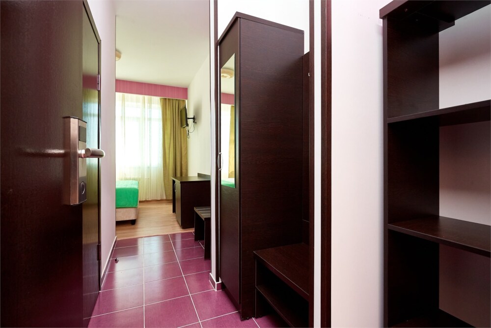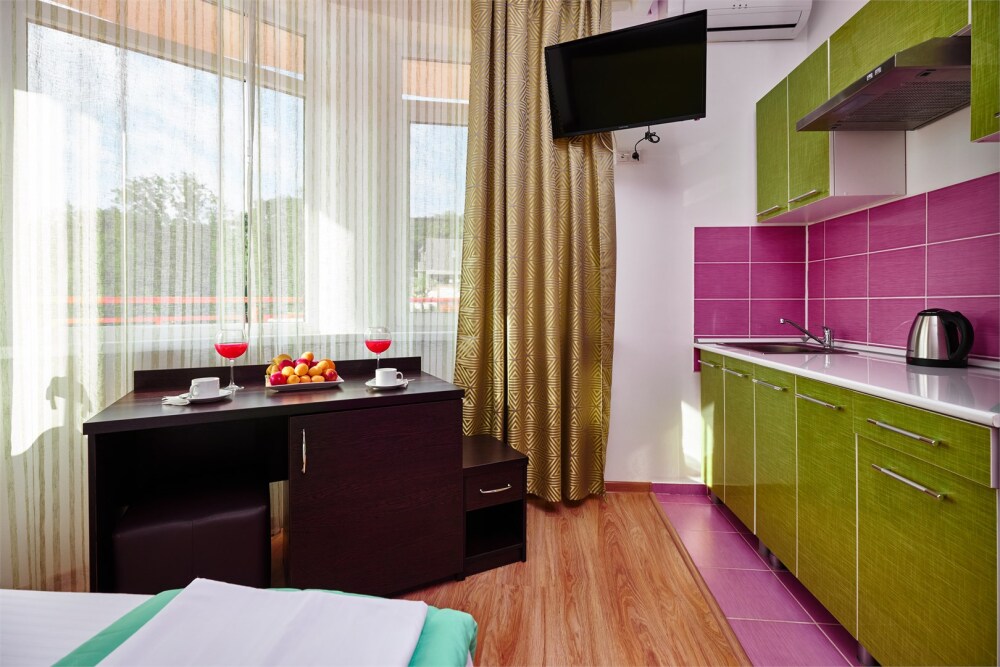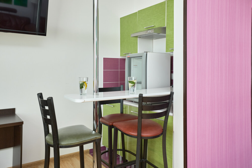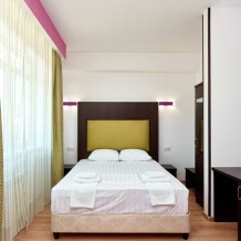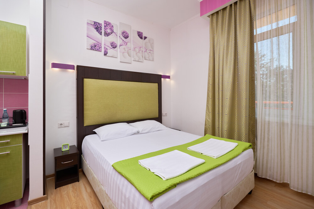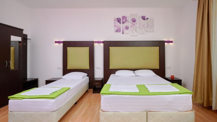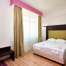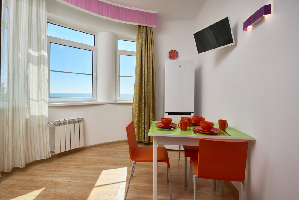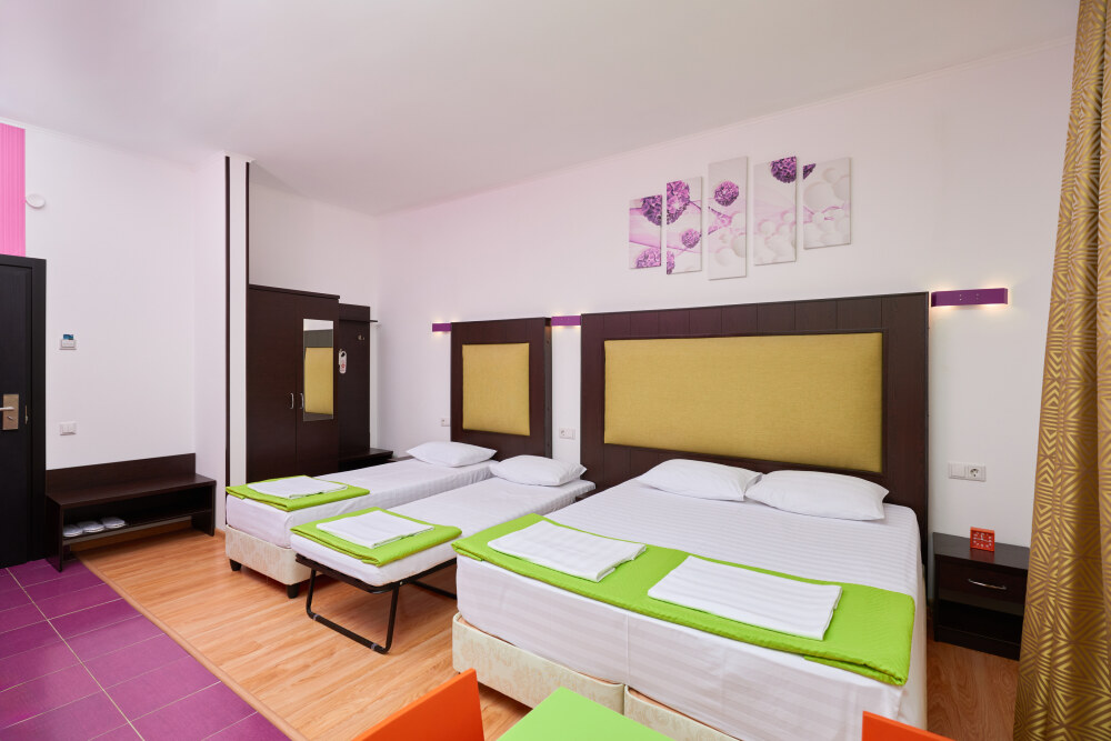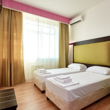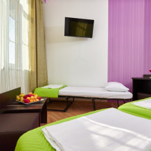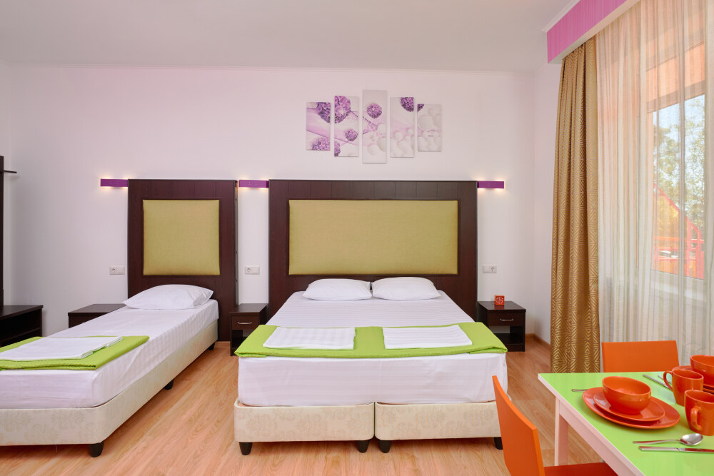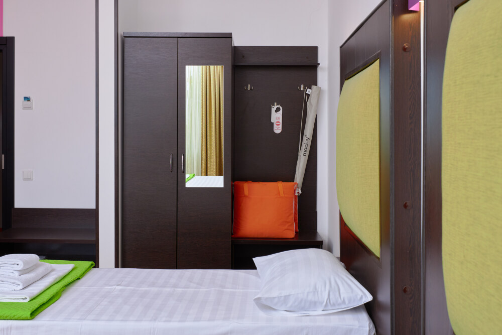 3-х местный номер Эконом без балкона подойдет для бюджетного размещения 3-4 человек оборудован кухонным уголком с обеденным столом, столовой посудой и эл.чайником. Для размещения 4го гостя в номере есть пуф, трансформирующийся в полноценную дополнительную кровать. Возможно размещение ребенка 3-6 лет на кровати с родителями или люля для ребенка 0-3 года.
