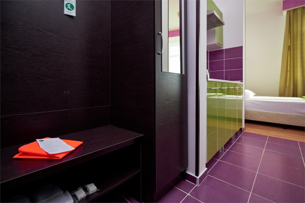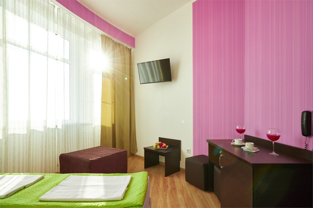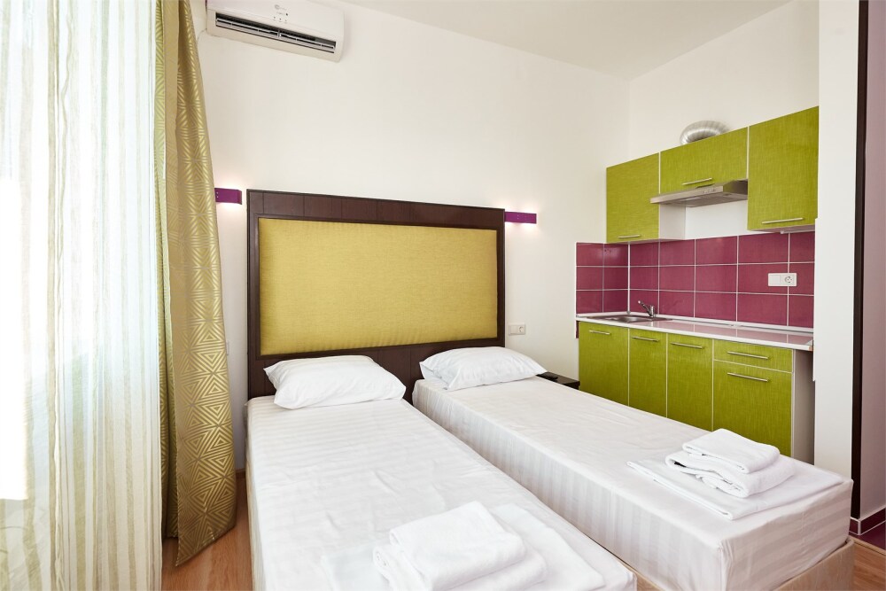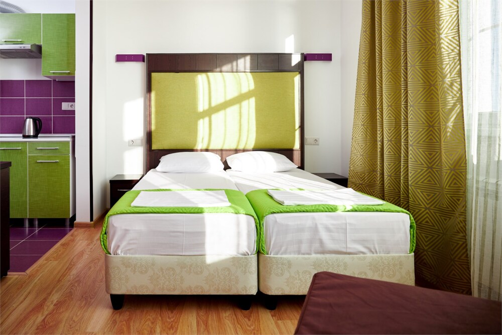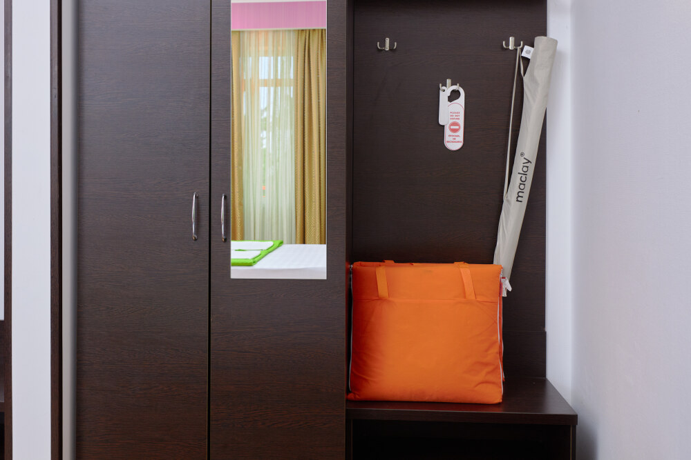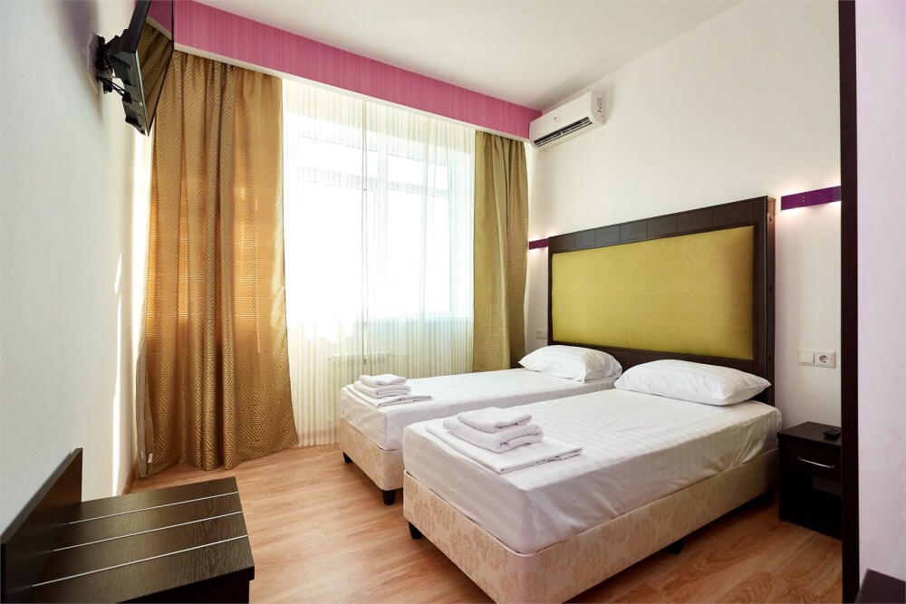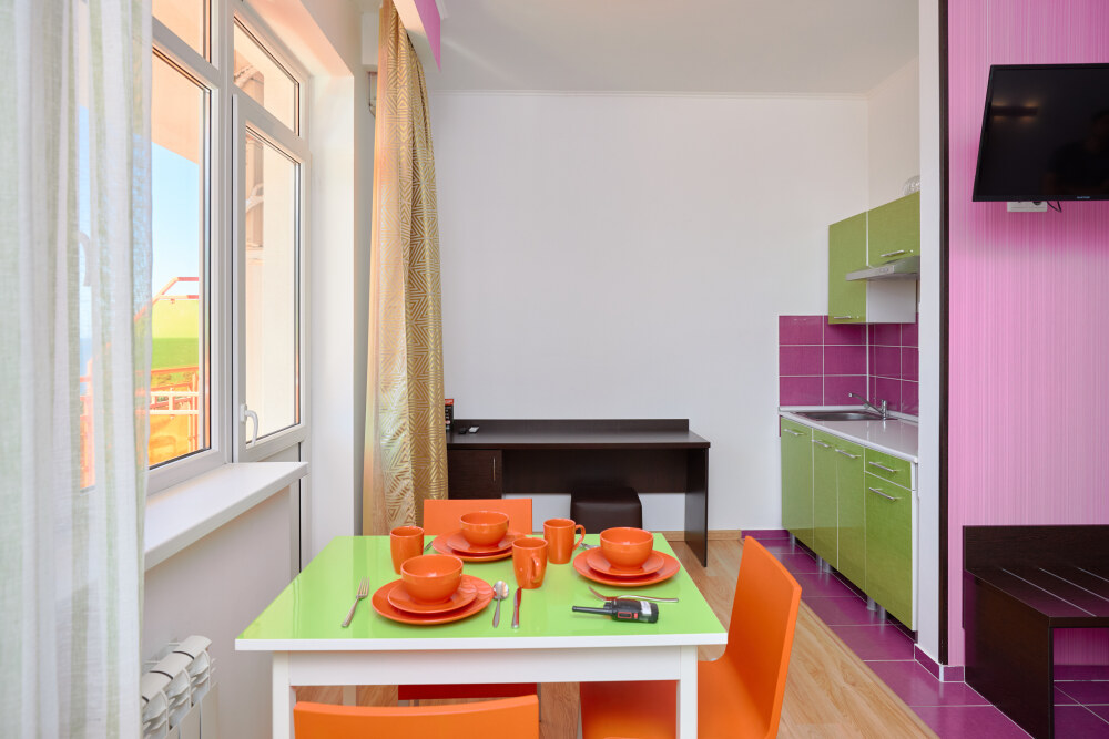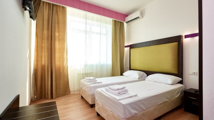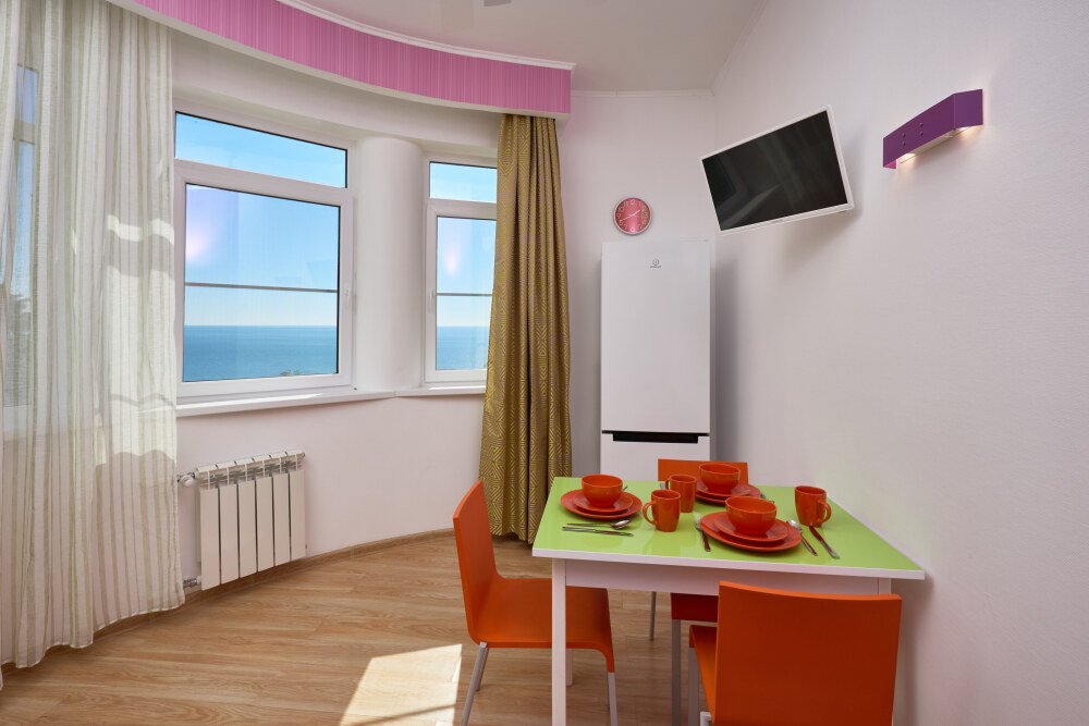 3-х местный номер Эконом без балкона подойдет для бюджетного размещения 3-4 человек оборудован кухонным уголком с обеденным столом, столовой посудой и эл.чайником. Для размещения 4го гостя в номере есть пуф, трансформирующийся в полноценную дополнительную кровать. Возможно размещение ребенка 3-6 лет на кровати с родителями или люля для ребенка 0-3 года.