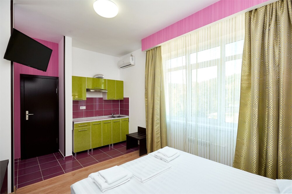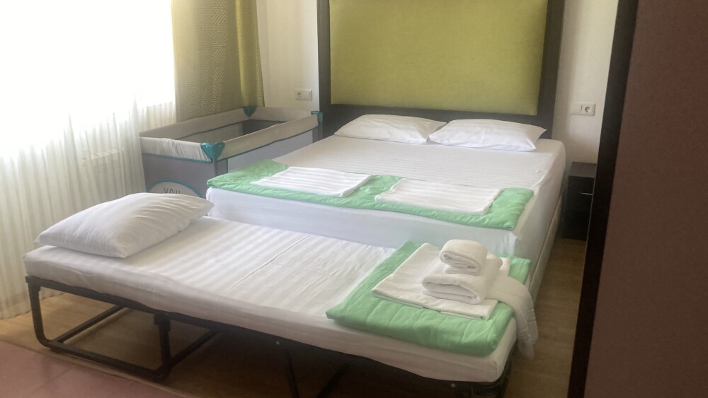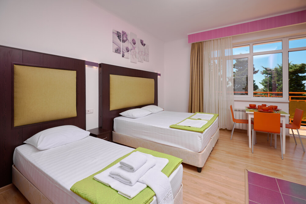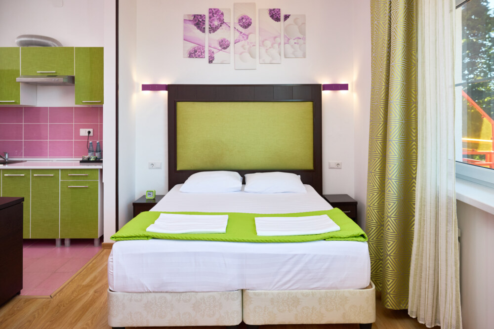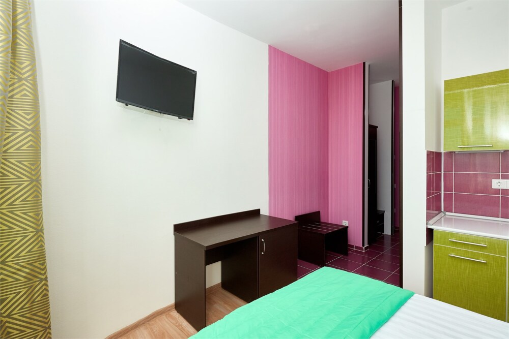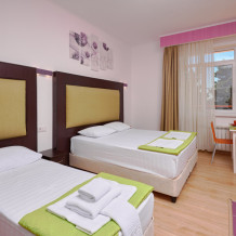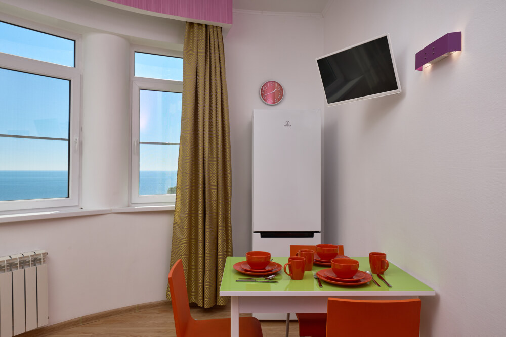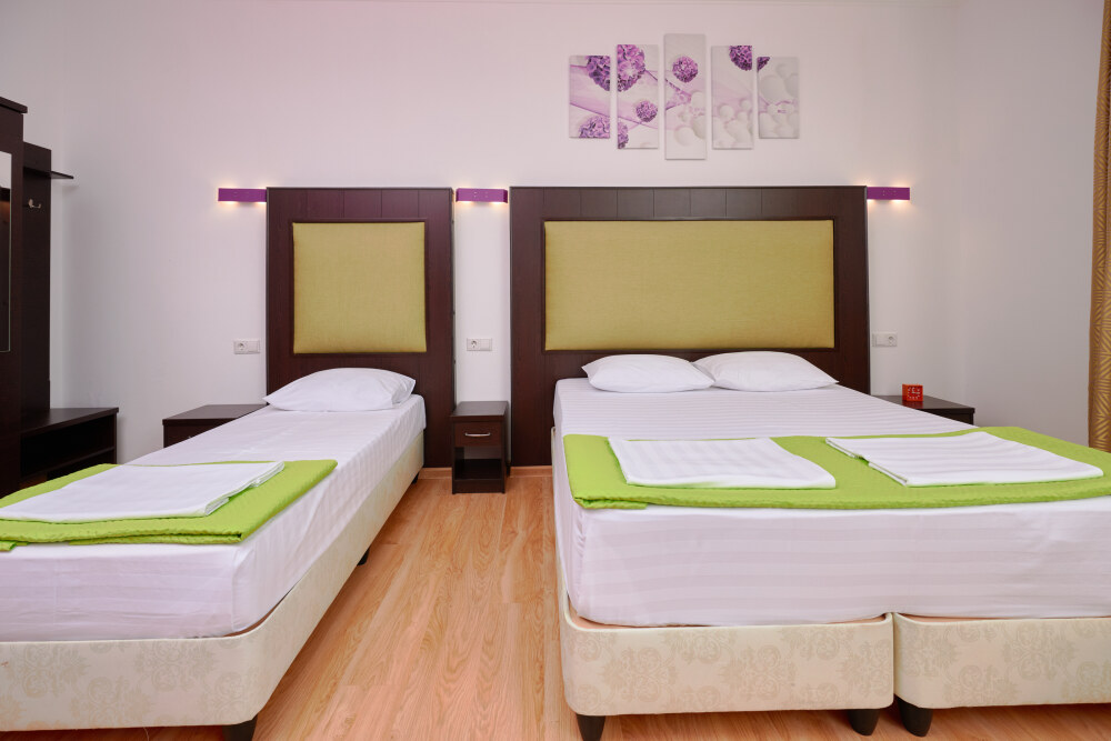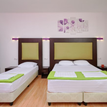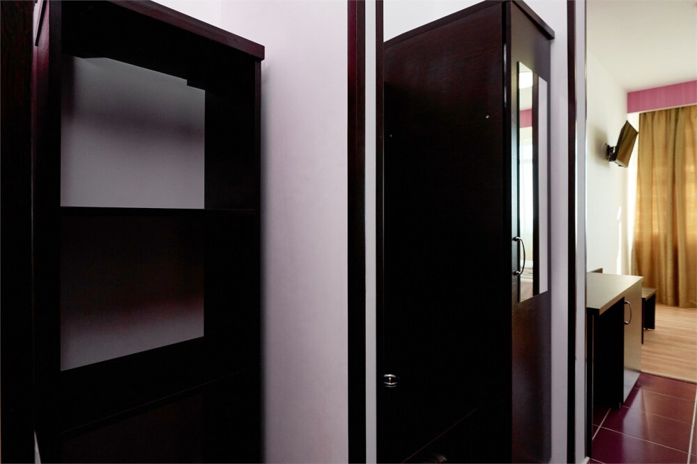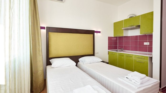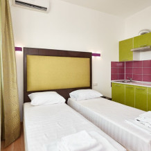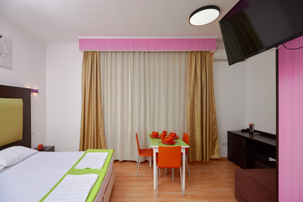 3-х местный номер Эконом без балкона подойдет для бюджетного размещения 3-4 человек оборудован кухонным уголком с обеденным столом, столовой посудой и эл.чайником. Для размещения 4го гостя в номере есть пуф, трансформирующийся в полноценную дополнительную кровать. Возможно размещение ребенка 3-6 лет на кровати с родителями или люля для ребенка 0-3 года.
