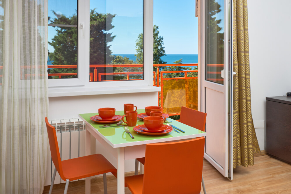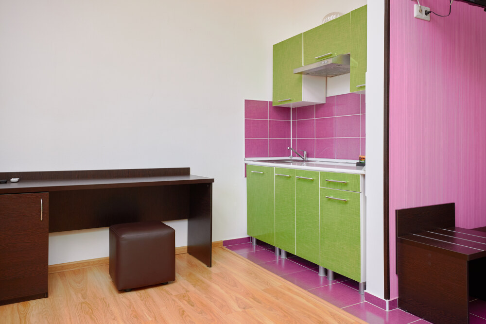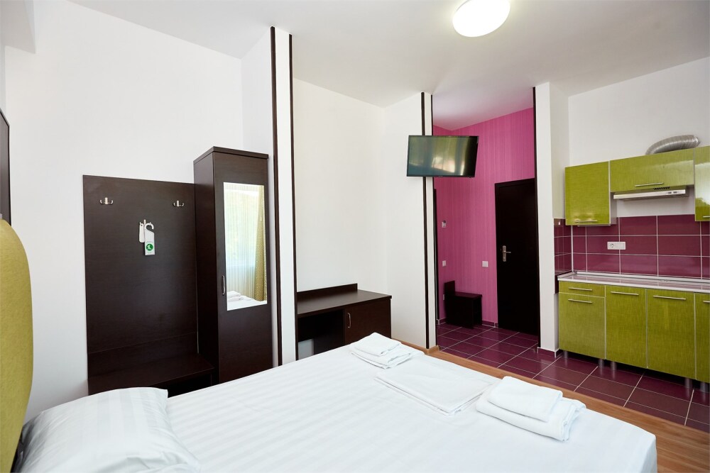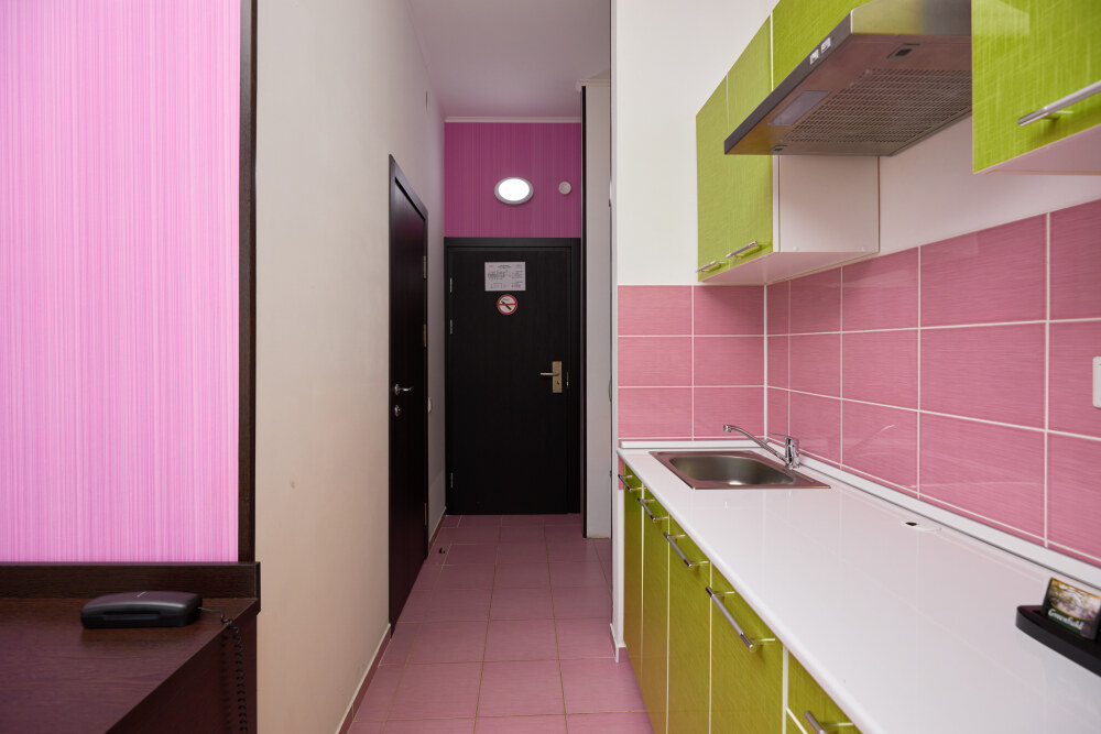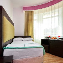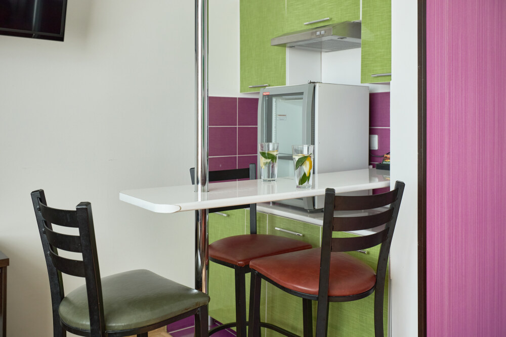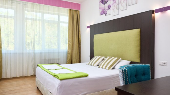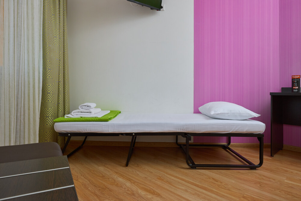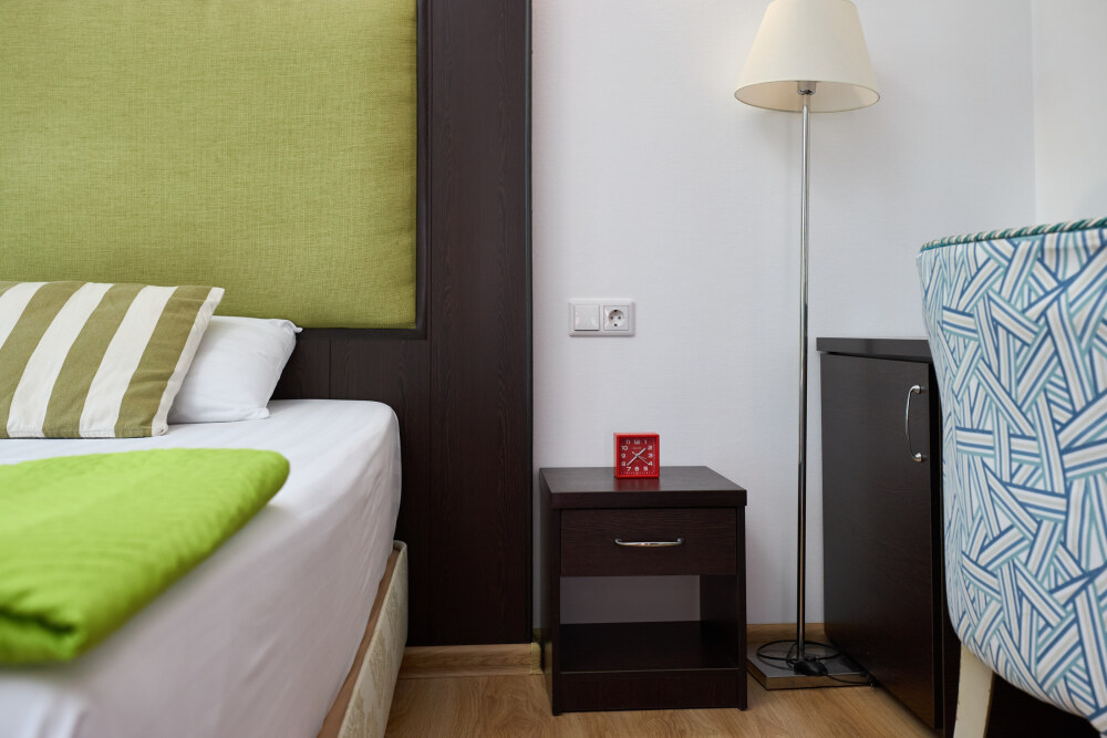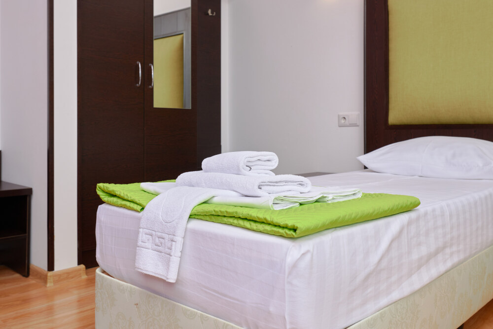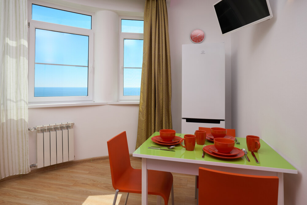 3-х местный номер Эконом без балкона подойдет для бюджетного размещения 3-4 человек оборудован кухонным уголком с обеденным столом, столовой посудой и эл.чайником. Для размещения 4го гостя в номере есть пуф, трансформирующийся в полноценную дополнительную кровать. Возможно размещение ребенка 3-6 лет на кровати с родителями или люля для ребенка 0-3 года.