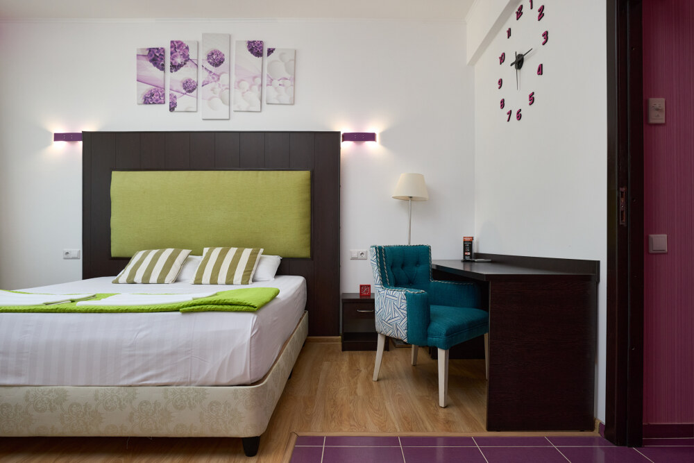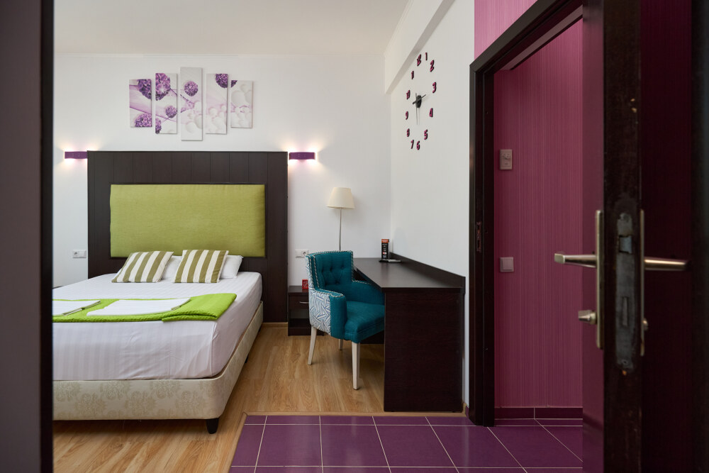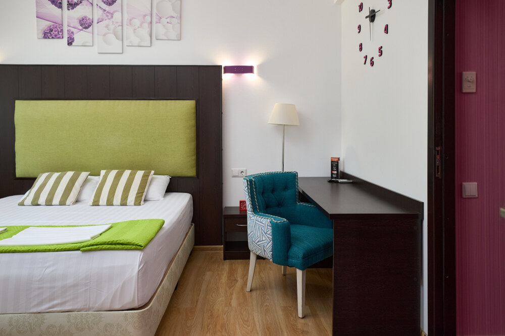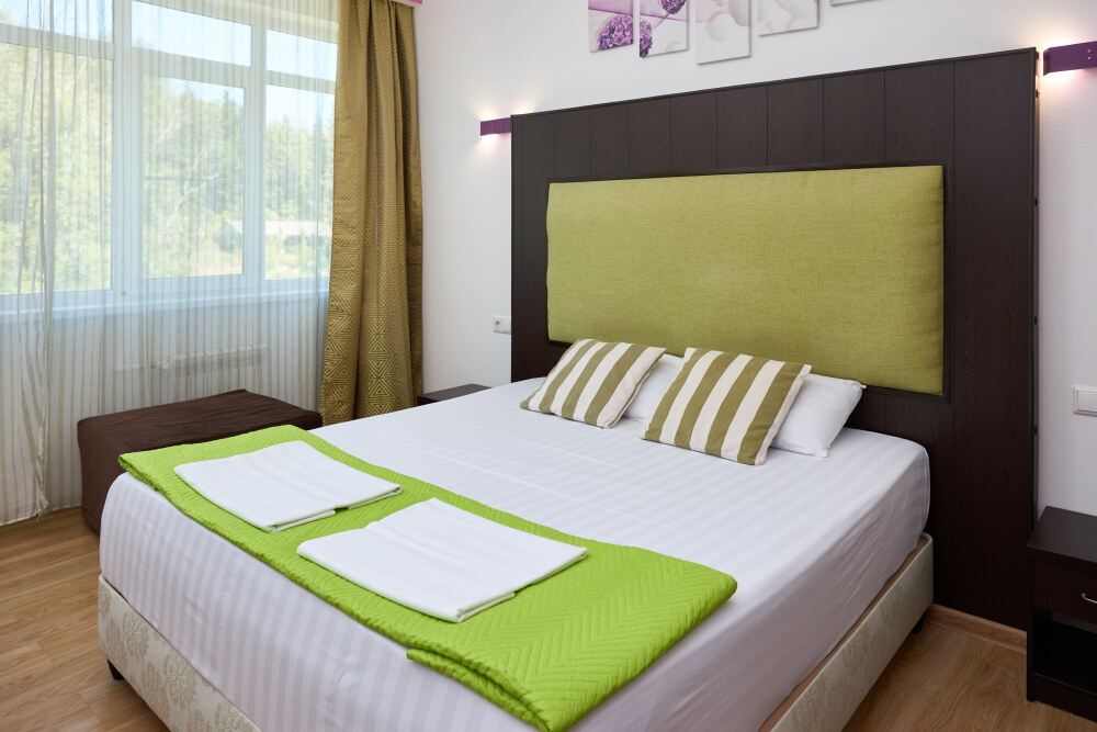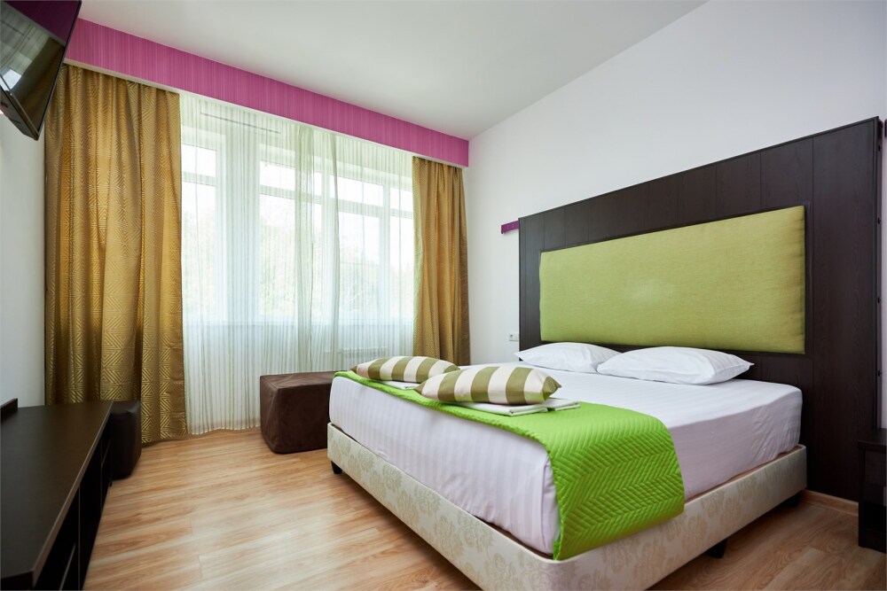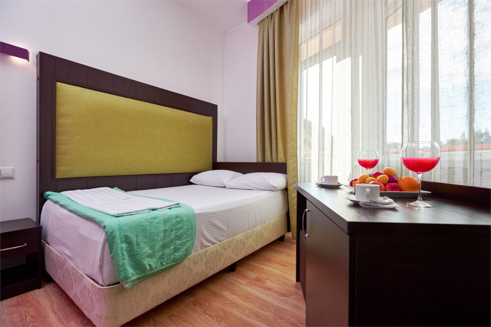 Одноместный номер Делюкс с видом на сад и горы имеет полутора спальную кровать 120см шириной на которой допускается размещение 1 взрослого гостя и ребенка до 6ти лет, детям до 3 лет может быть предоставлена кроватка-люля. За микроклимат в номере отвечает сплит-система, есть мини-холодильник, столовая посуда и столовые принадлежности.