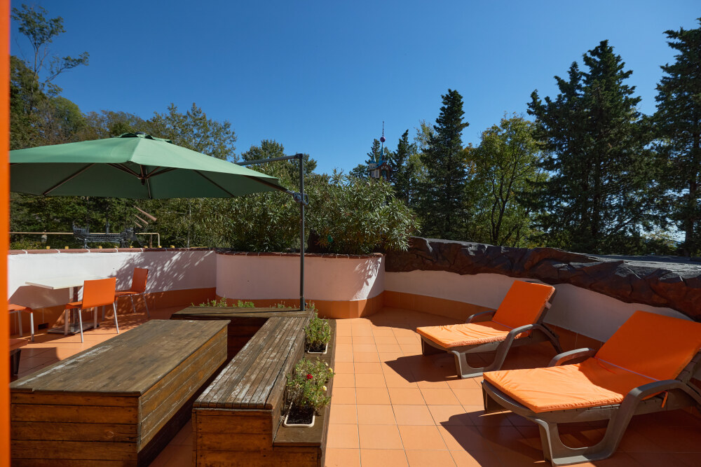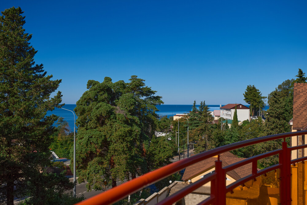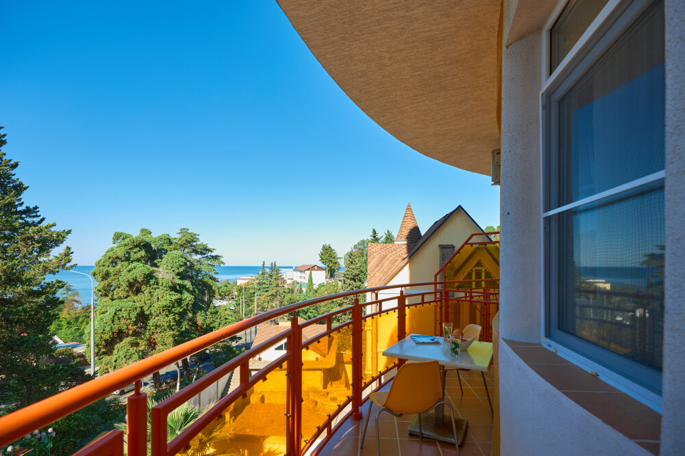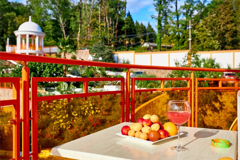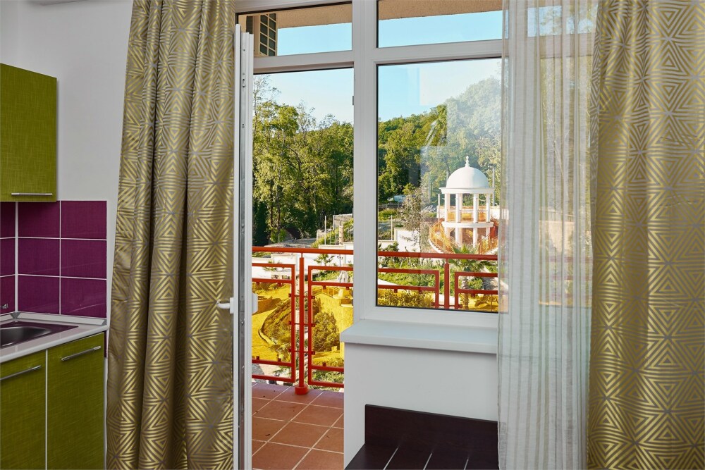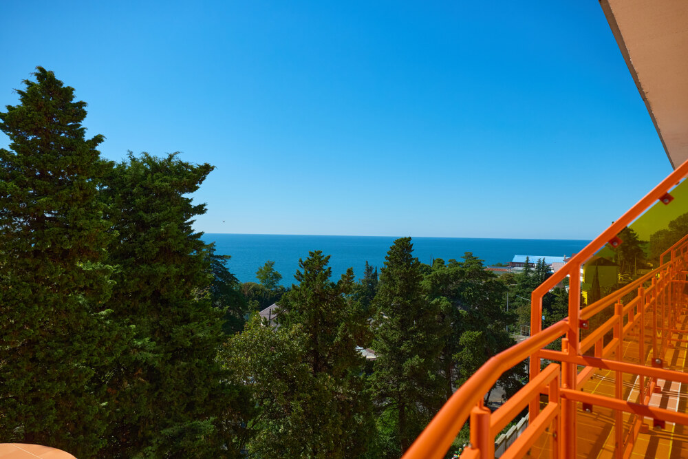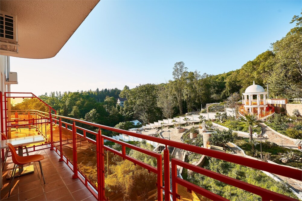 Одноместный номер Делюкс с балконом и видом на сад и горы имеет полутора спальную кровать 120см шириной на которой допускается размещение 1 взрослого гостя и ребенка до 6ти лет, детям до 3 лет может быть предоставлена кроватка-люля. За микроклимат в номере отвечает сплит-система, есть мини-холодильник, столовая посуда и столовые принадлежности. На балконе номера стоит садовая мебель.