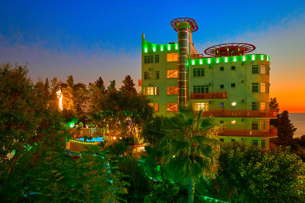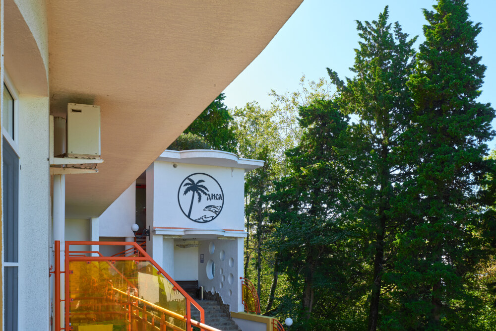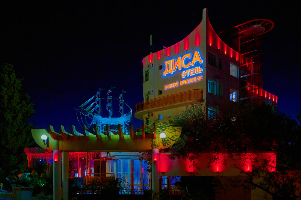 Отель «ДИСА» расположен в 350 метрах от не многолюдного галечного пляжа п. Якорная щель, на территории расположен пышно цветущий сад с тропическими растениями и плодоносящими фруктовыми деревьями среди которых находятся два пруда с водными обитателями и цветущими водными растениями. Имеется детская площадка, а помимо подогреваемого бассейна с гидромассажными приспособлениями есть мелководный детский бассейн с красиво подсвеченным водопадом. В здании отеля есть номера разной категории от шикарного пентхауса с террасой и 6ти местной джакузи на крыше здания, до одноместных, но просторных номеров.