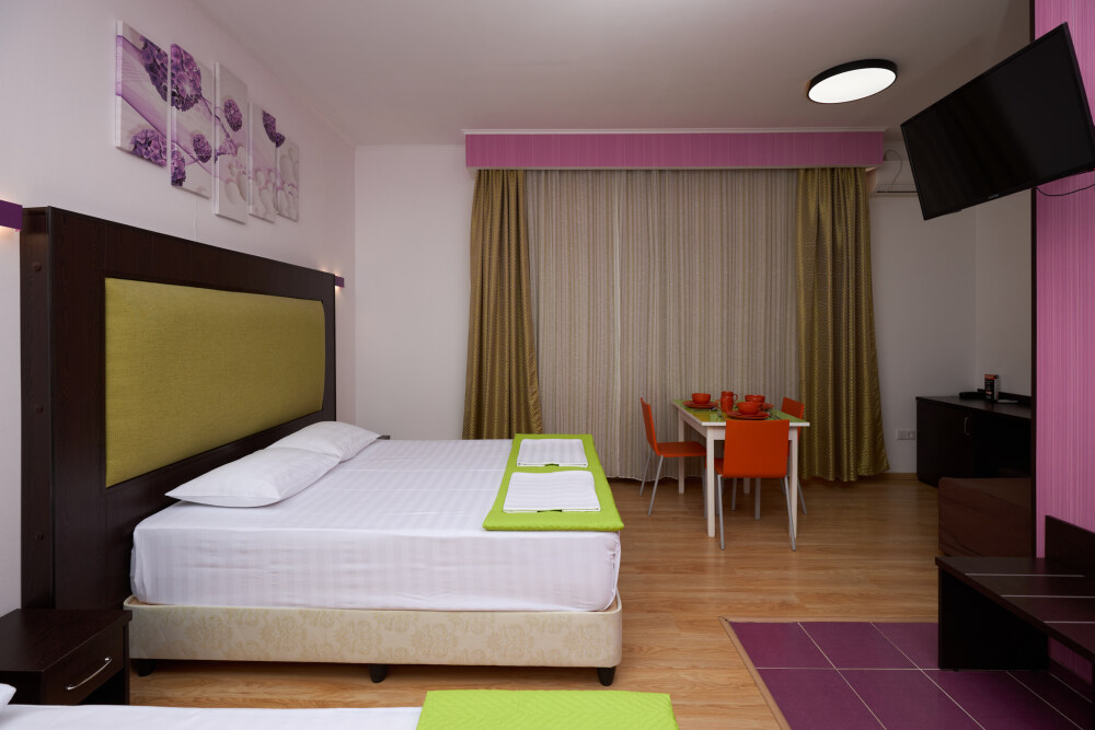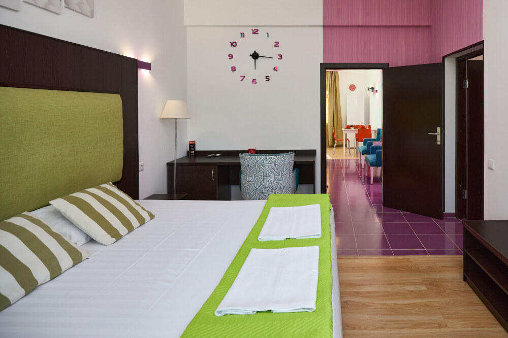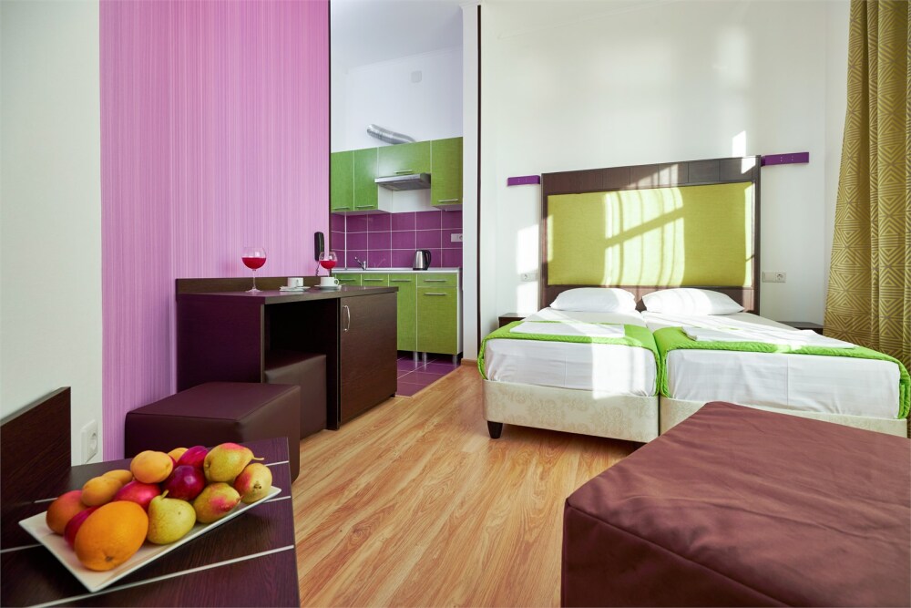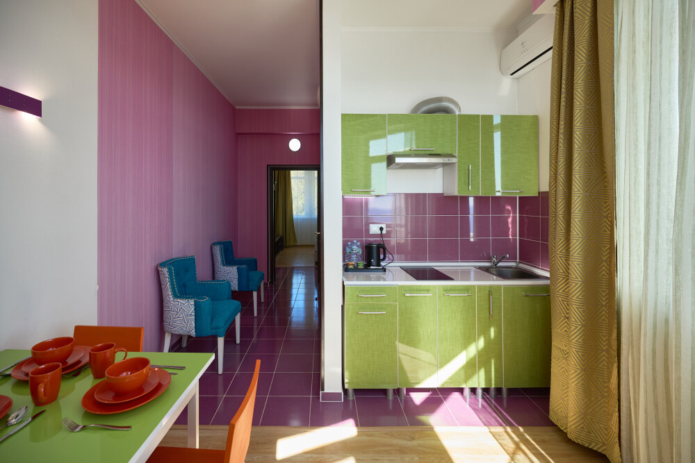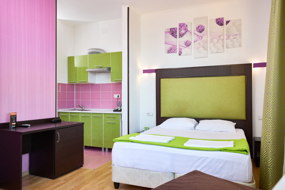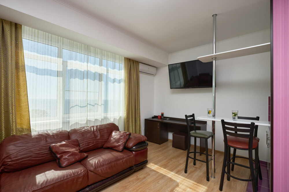 Просторный номер с гостиной зоной, оборудованной кухонной мебелью, посудой, потолочным вентилятором, вытяжкой, холодильником и телевизором с плоским экраном. Балкон с садовой мебелью. Гостям доступна премиум линейка отельной парфюмерии, банные халаты. В спальне гости могут воспользоваться большим Смарт ТВ с плоским экраном и доступом в интернет.