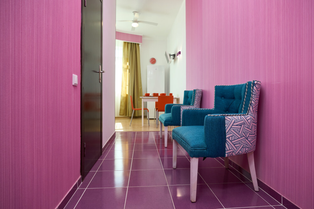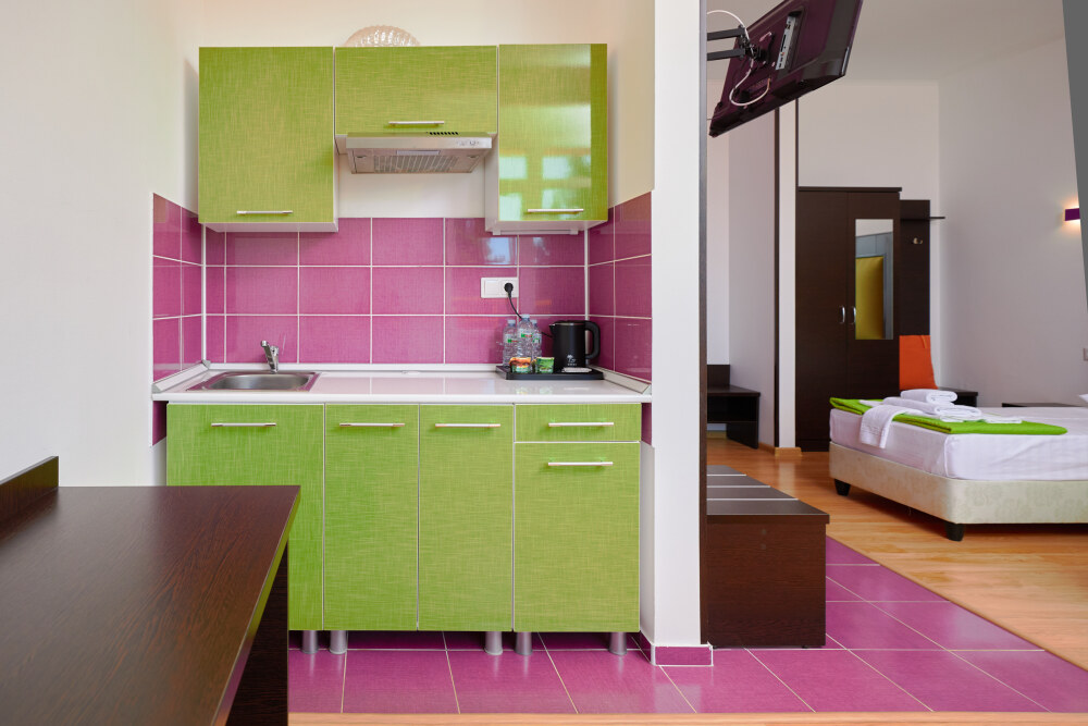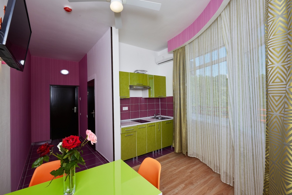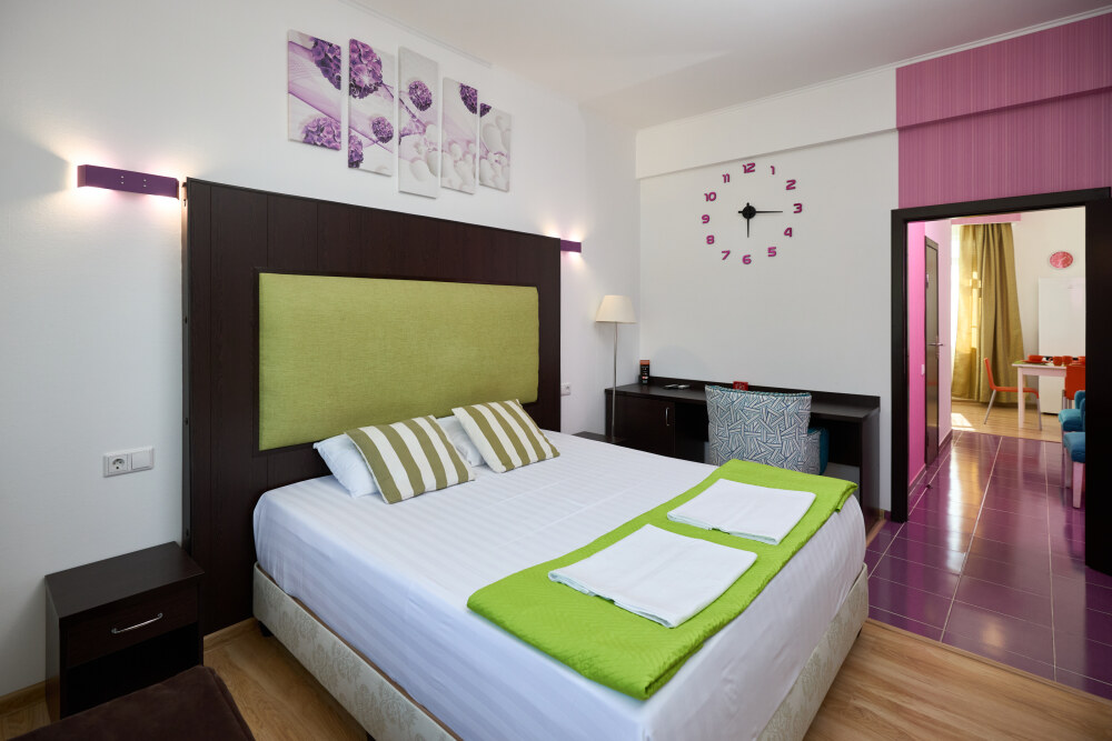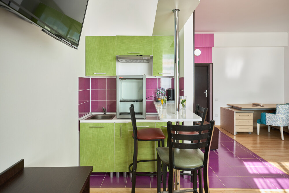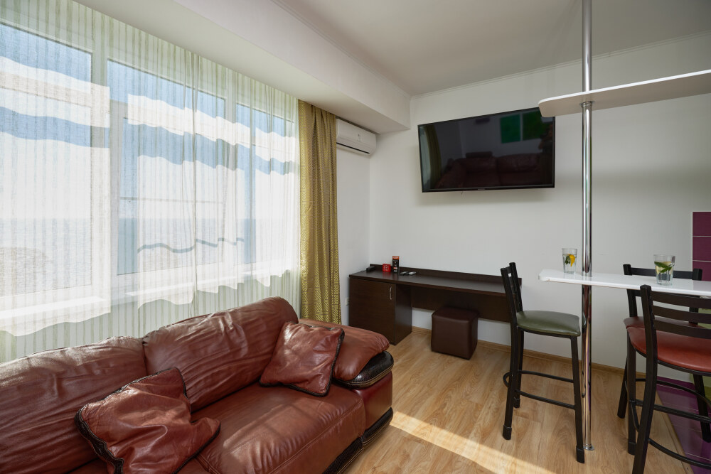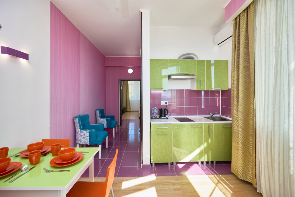 Просторный номер с гостиной зоной, оборудованной кухонной мебелью, посудой, потолочным вентилятором, вытяжкой, холодильником и телевизором с плоским экраном. Балкон с садовой мебелью. Гостям доступна премиум линейка отельной парфюмерии, банные халаты. В спальне гости могут воспользоваться большим Смарт ТВ с плоским экраном и доступом в интернет.