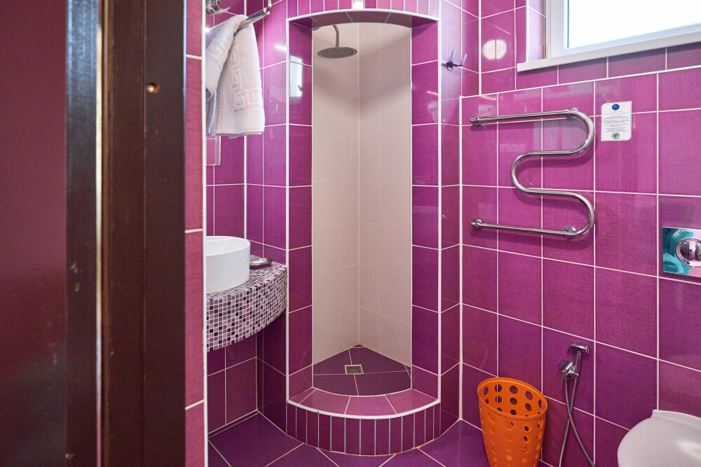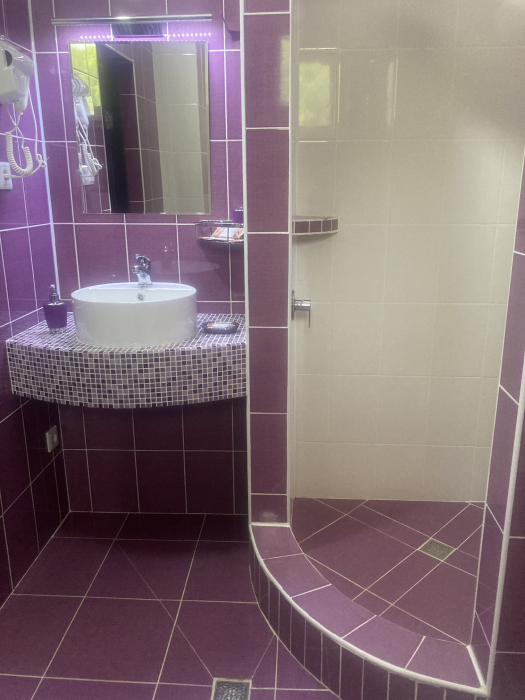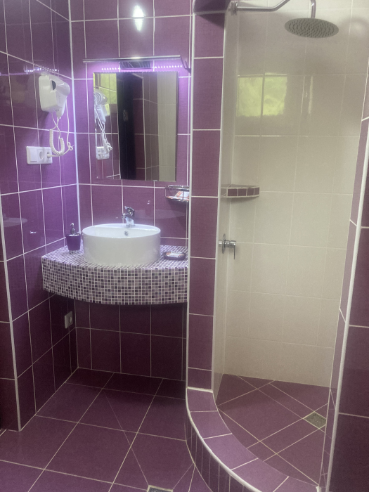 Подойдет для размещения 2-х гостей, предпочитающих тихий отдых, вид на цветущий сад отеля и пруд с водопадом, в котором живут черепахи и яркие карпы Кои. Для размещения 3-го гостя в номере есть пуф, трансформирующийся в полноценную дополнительную кровать. Оборудован мини-кухней со столовой посудой. В ванной комнате номера, кроме душа имеется ванна с поручнями.
