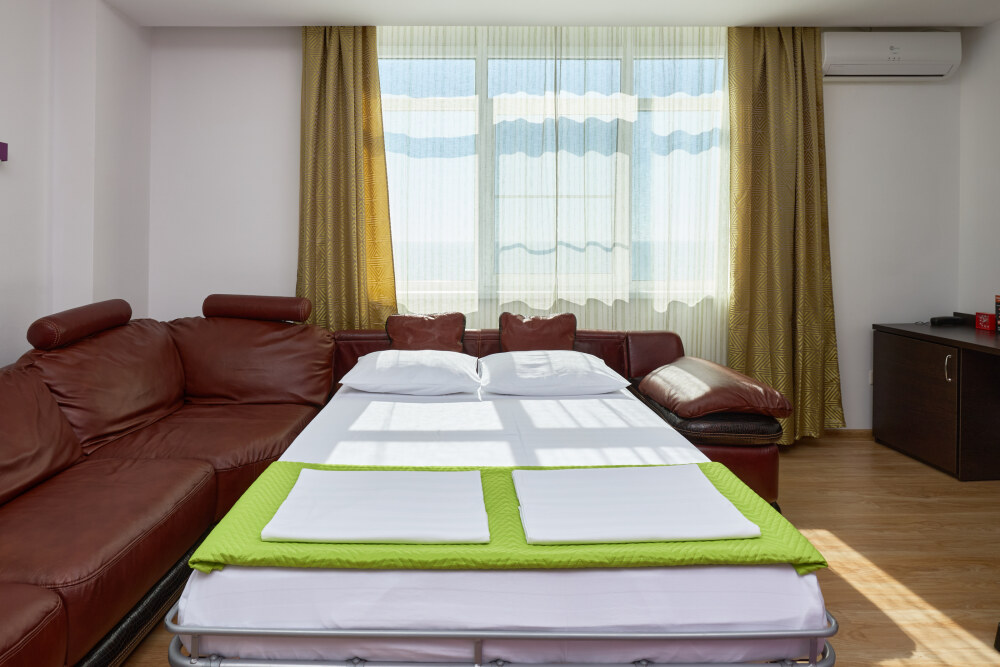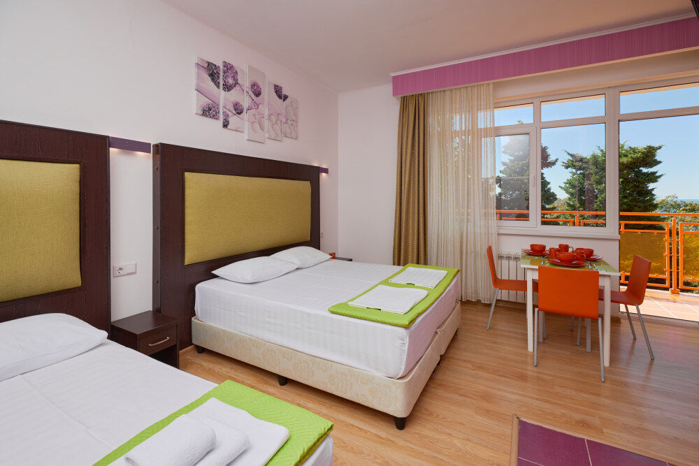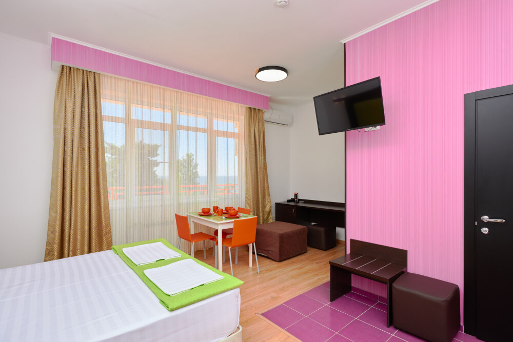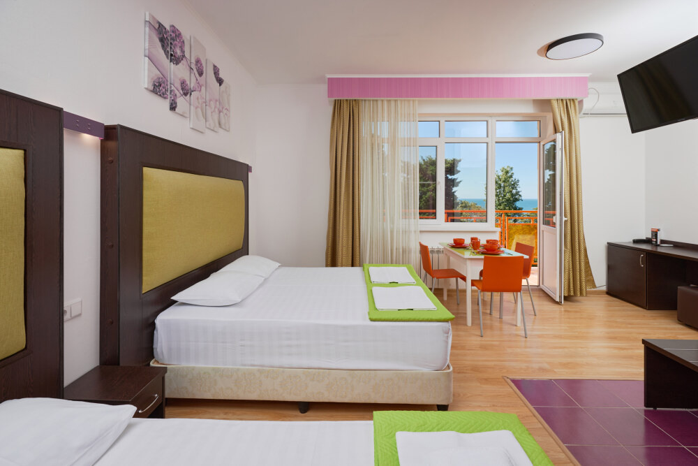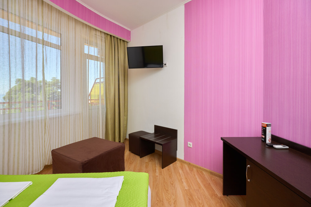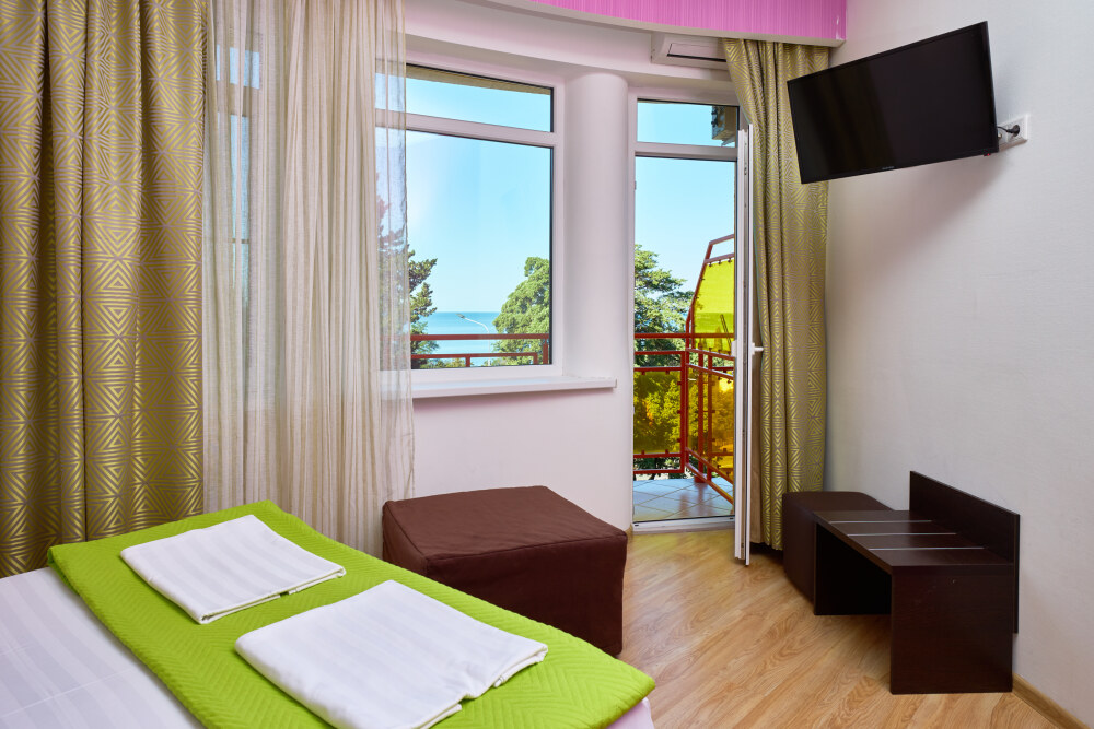 Эконом семейный плюс 2-местный номер с одной двуспальной кроватью или 2-мя раздельными кроватями из окон которого открывается вид на береговую линию моря, а в вечернее время можно любоваться картиной солнечного заката в морской горизонт. Номер подходит для размещения 3-х гостей . Для размещения 3 го гостя в номере есть пуф, трансформирующийся в полноценное спальное место. В номере есть столовая посуда и столовые приборы, прохладу в нем обеспечивает сплит-система, окна оснащены москитными сетками. Курение в номере не допускается.