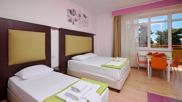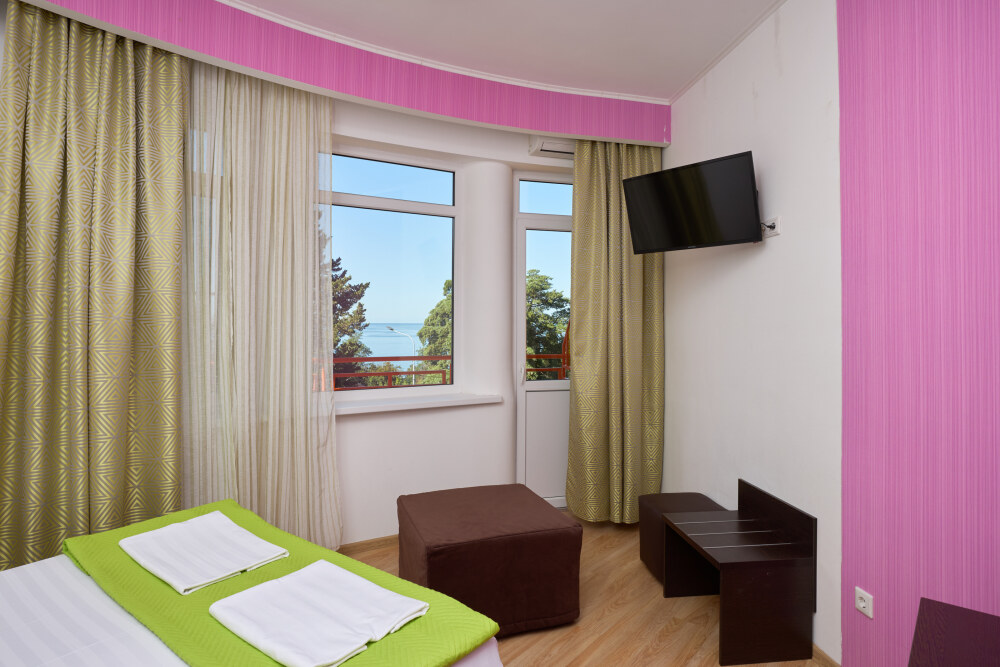 Стандартный 2-местный номер с одной двуспальной кроватью или 2-мя раздельными кроватями из окон которого открывается вид на береговую линию моря, а в вечернее время можно любоваться картиной солнечного заката в морской горизонт сидя на балконе номера. Номер подходит для размещения 2 гостей. В номере есть столовая посуда и столовые приборы, прохладу в нем обеспечивает сплит-система, окна оснащены москитными сетками.