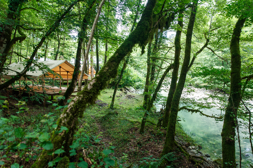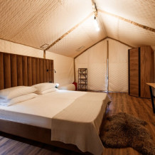 Тент-хаус премиум класса с собственной ванной комнатой и просторной террасой, с мебелью, на берегу реки и видом на лес. Сочетает в себе все необходимое для комфортного отдыха.