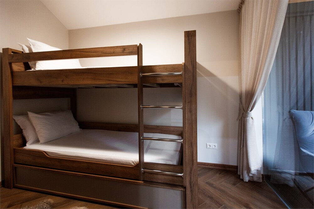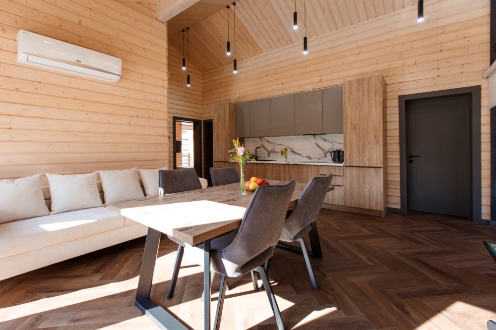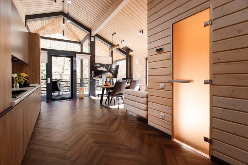 В барнхаусе большая гостиная, кухонная зона, две просторные спальни с кроватью King size, сауна, ванная комната и детская комната с двухярусной кроватью.