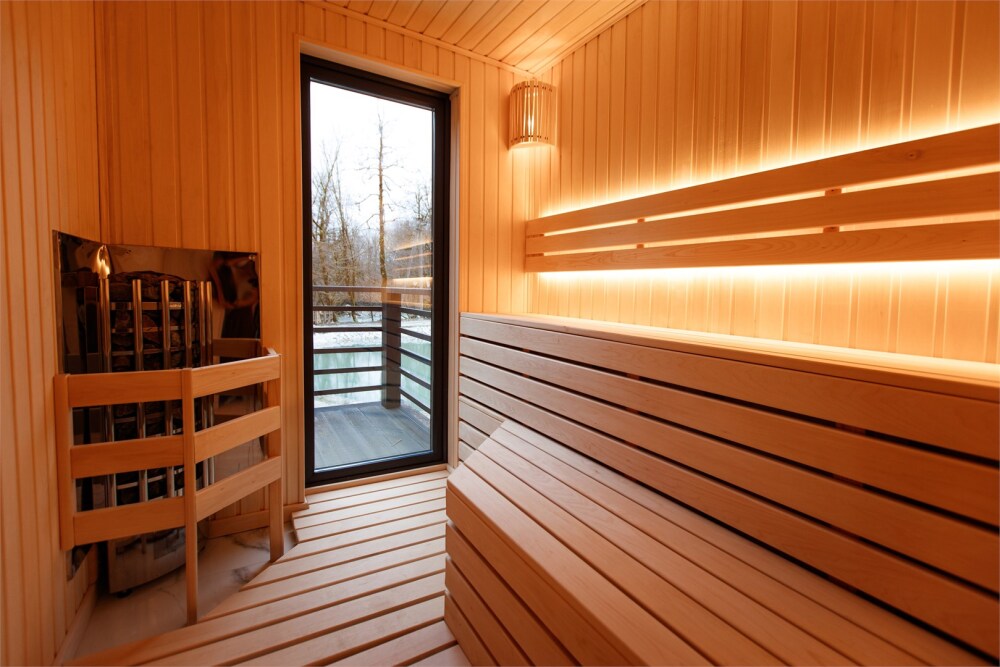 Барнхаус у реки сочетает в себе всё необходимое для комфортного отдыха: собственную гостиную, кухонную зону, две просторные спальни с кроватями King size, собственную сауну, джакузи под открытым небом, комнату отдыха и большую террасу с мебелью и видом на реку и лес.