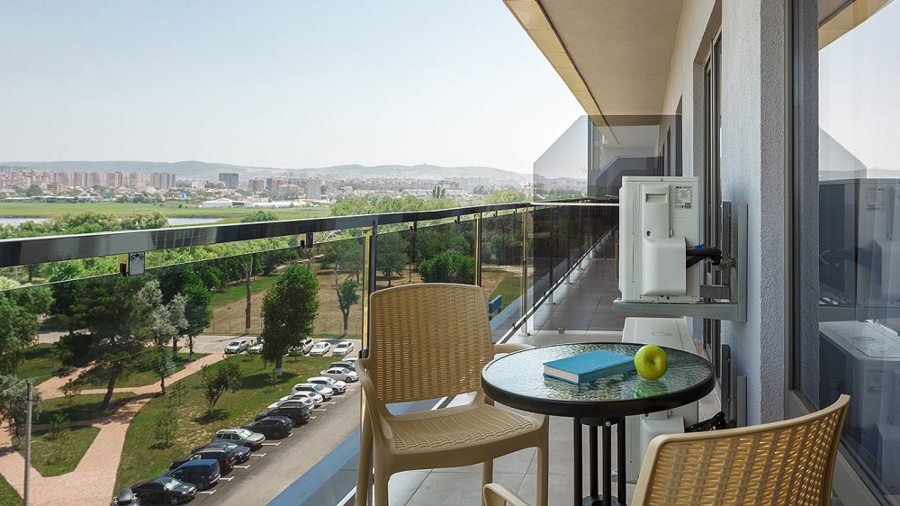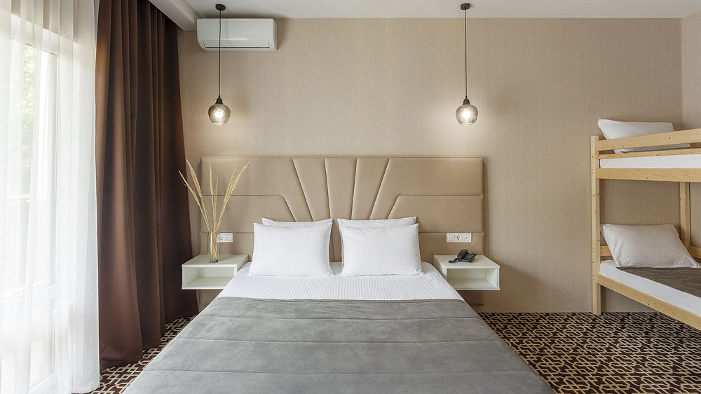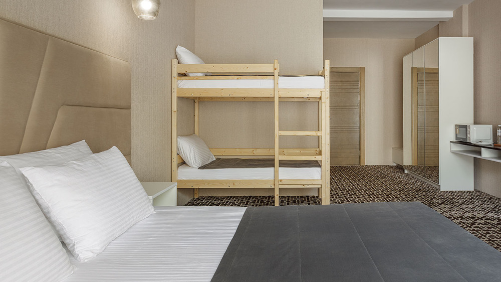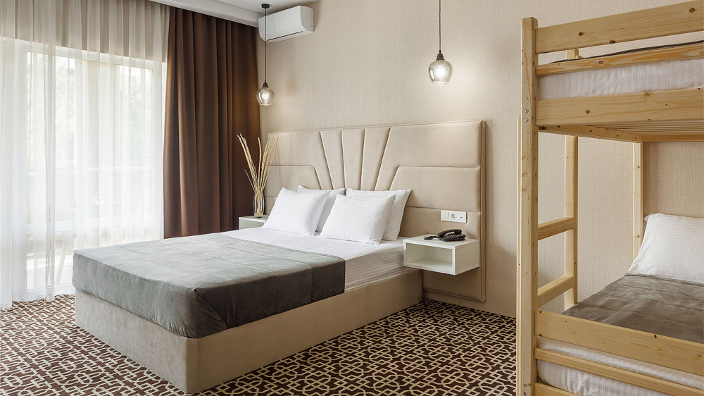 В номере: две 2-спальных кровати, ТВ, холодильник, чайная станция, сплит-система, телефон, сейф, балкон с летней мебелью и сушилкой для белья.