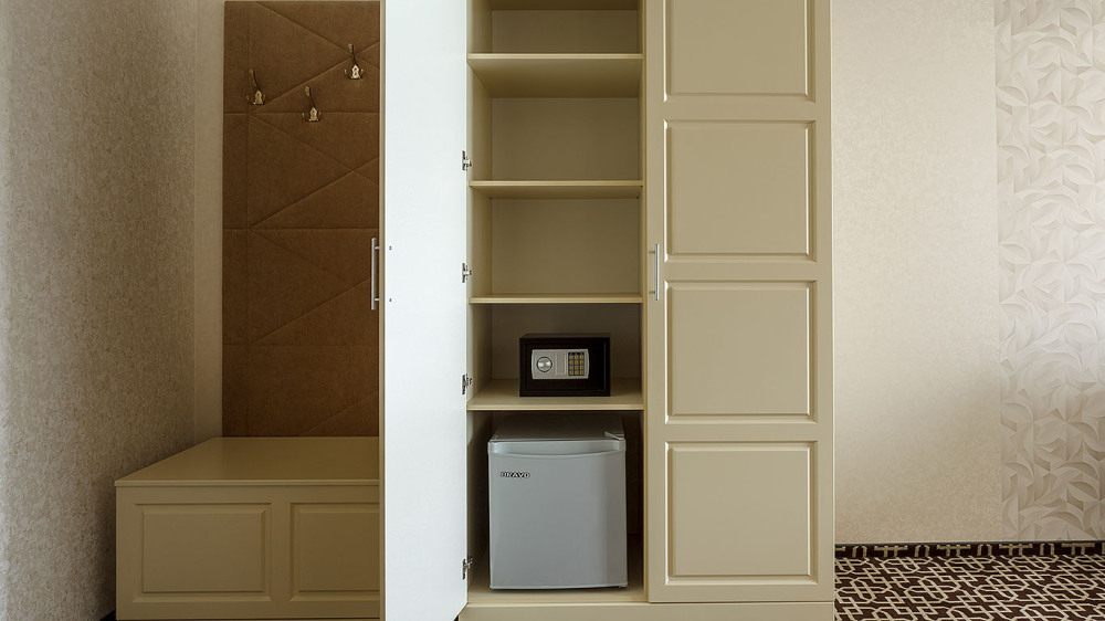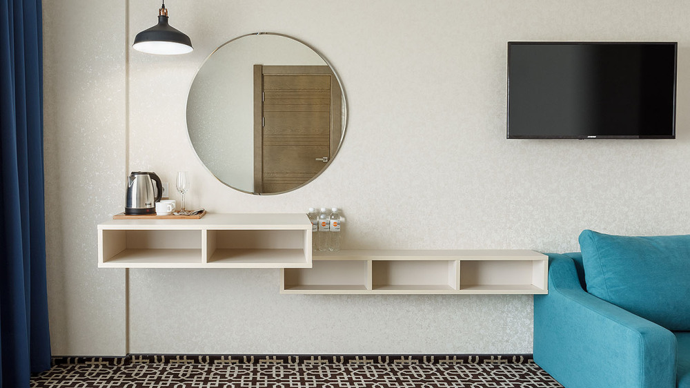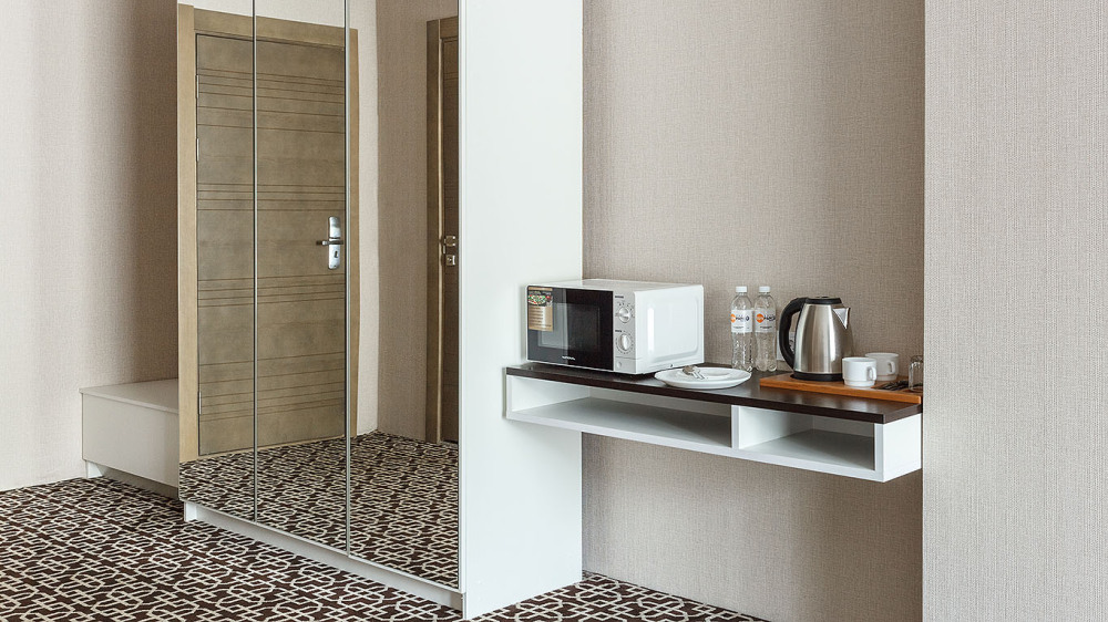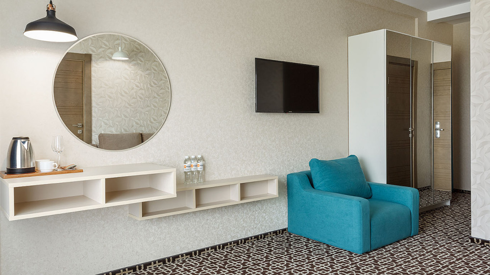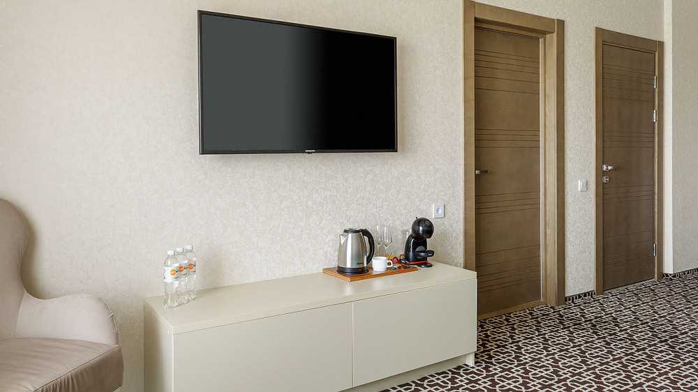 В номере: одна двуспальная кровать (king size), диван, ТВ, холодильник, чайная станция, кофемашина, гладильная доска и утюг, сплит-система, телефон, сейф, балкон с летней мебелью и сушилкой для белья.
