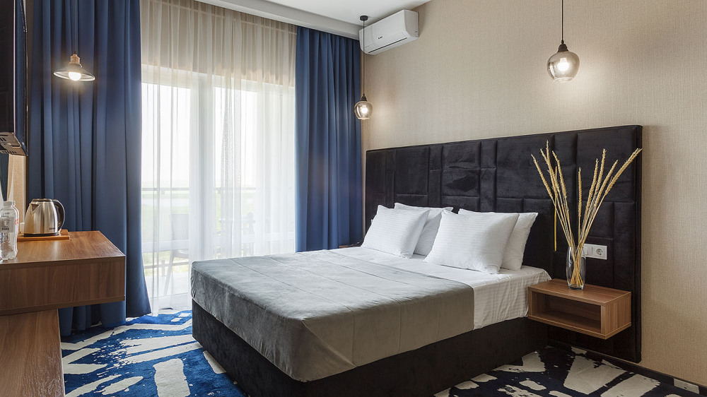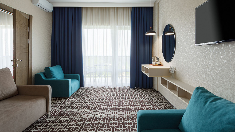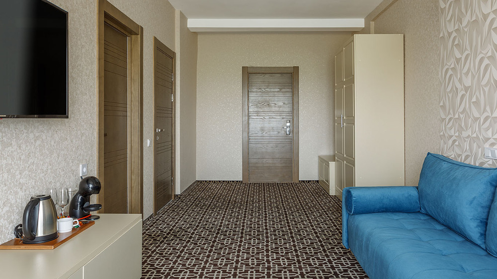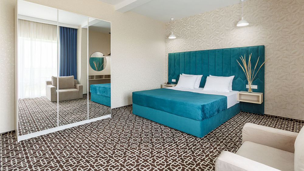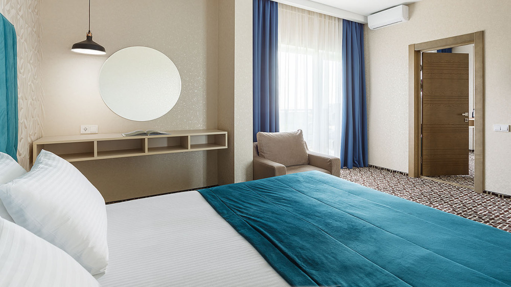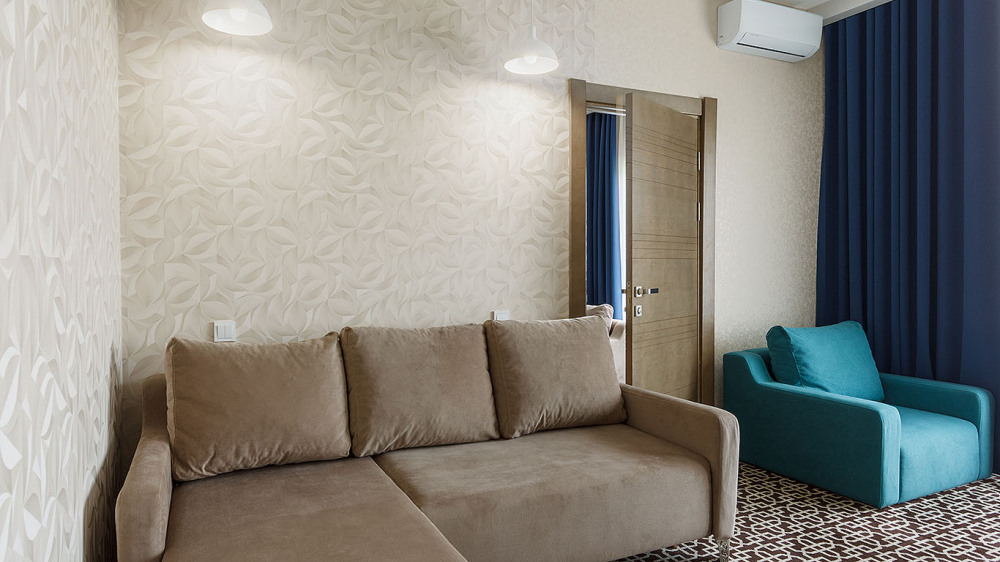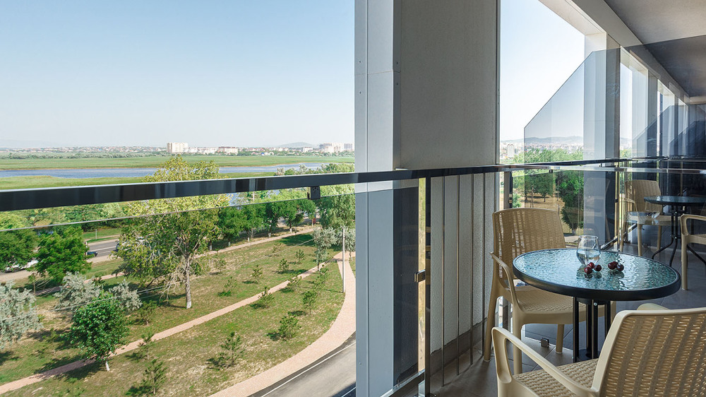 Просторный двухкомнатный номер с гостиной и спальней. Номера расположены на 7 этаже в корпусе с панорамным видом на море и плавни реки Анапки.