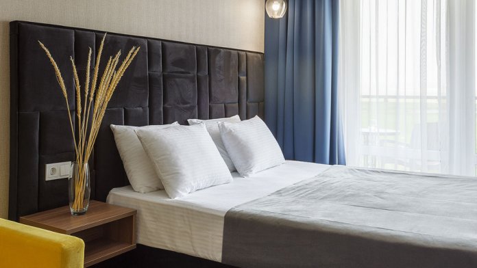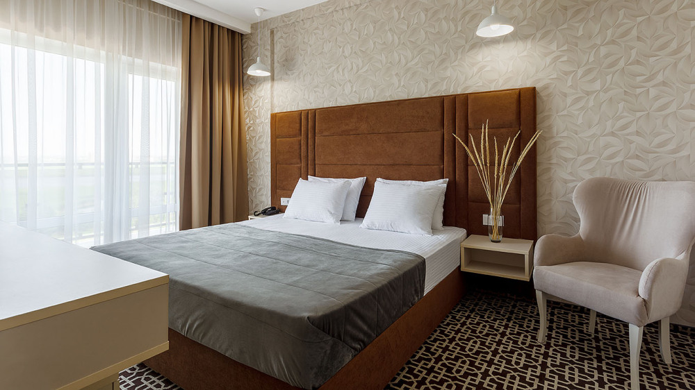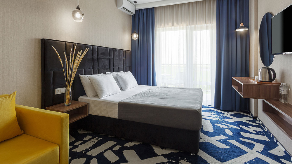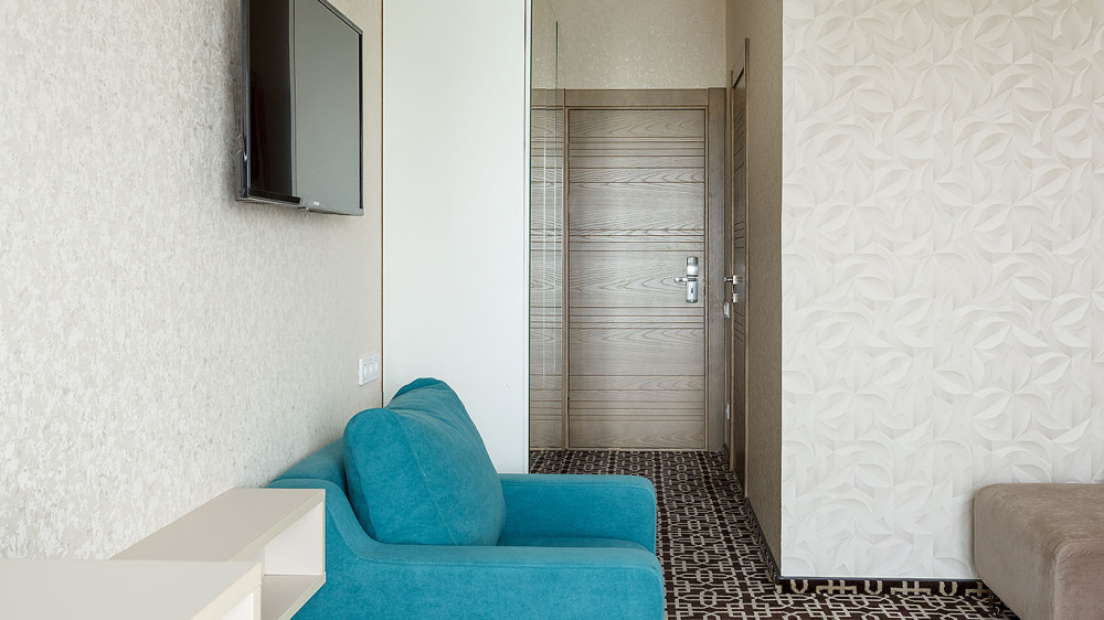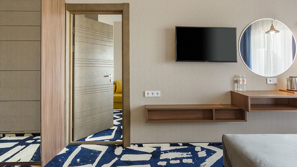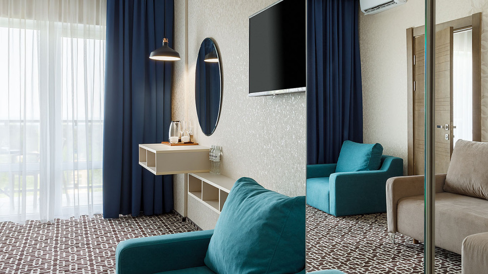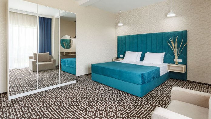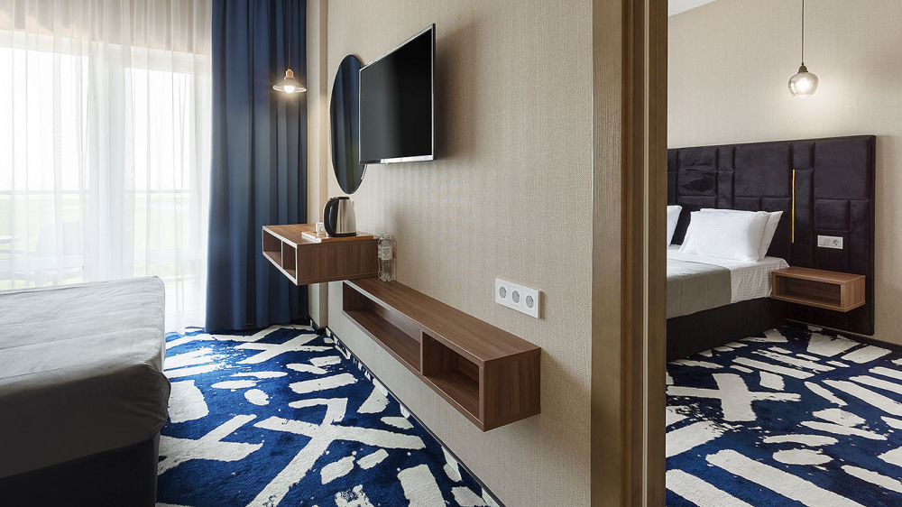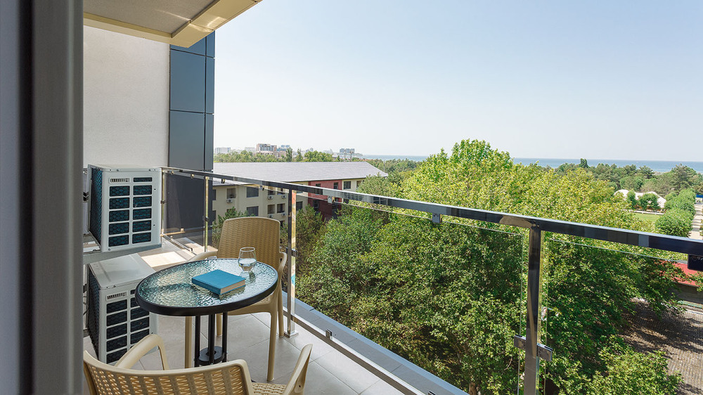 Просторный двухкомнатный номер с гостиной и спальней. Номера расположены на 7 этаже в корпусе с панорамным видом на море и плавни реки Анапки.