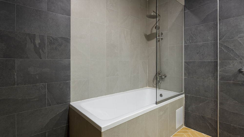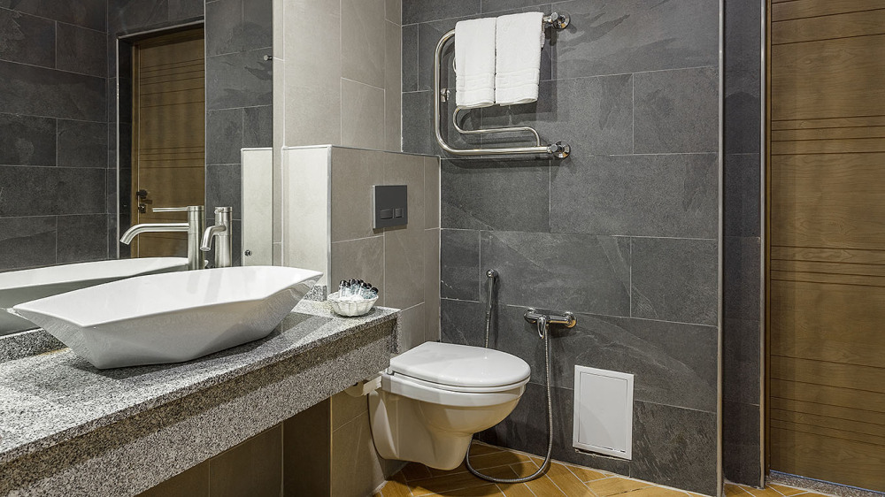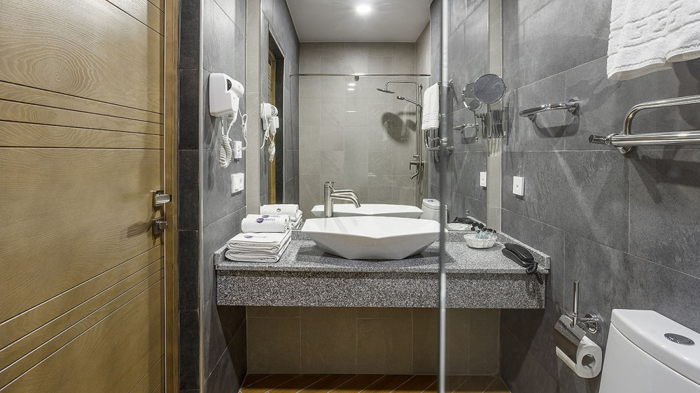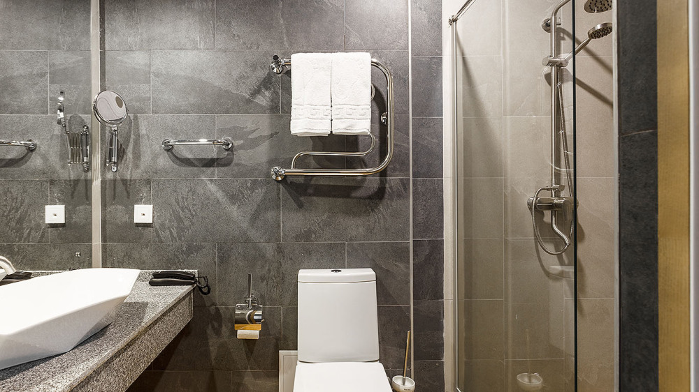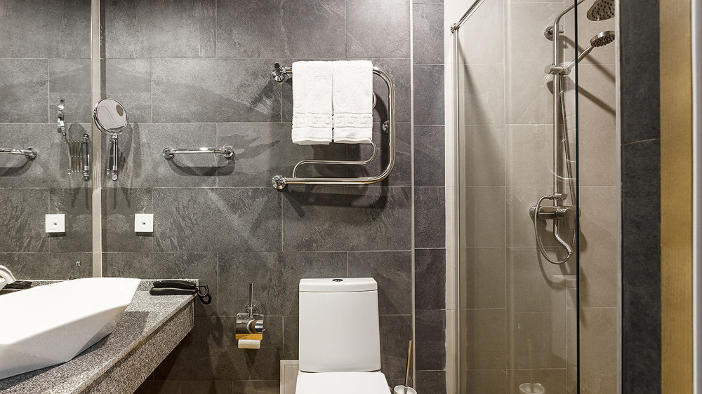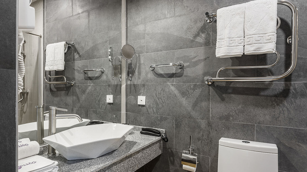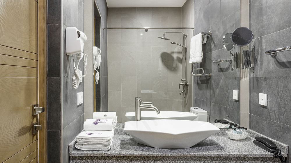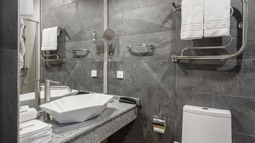 В ванной комнате: душ, раковина, унитаз, зеркало, фен, банные принадлежности и гостиничная парфюмерия.