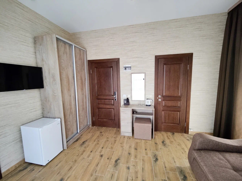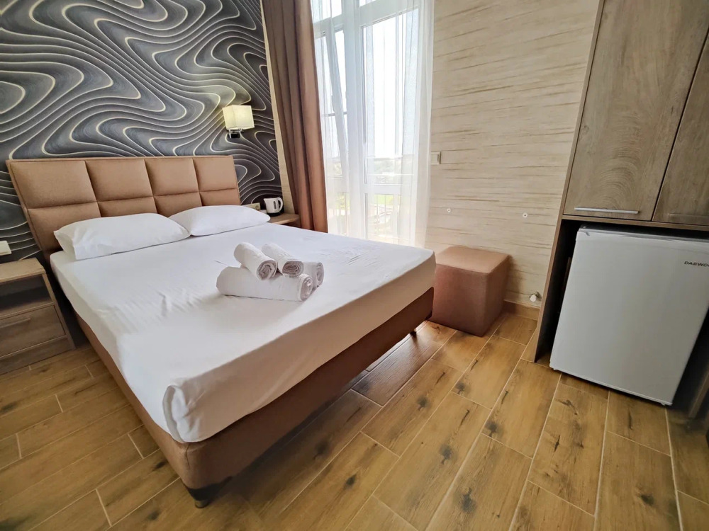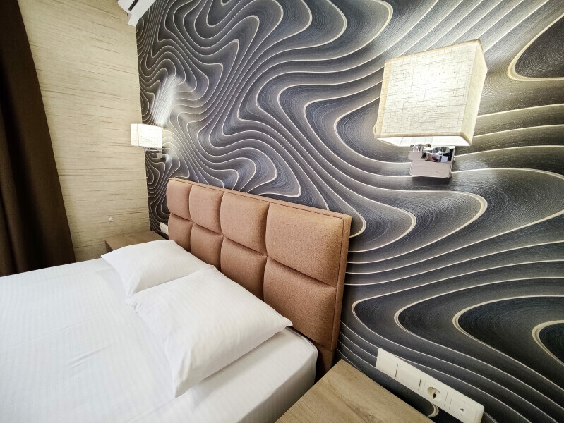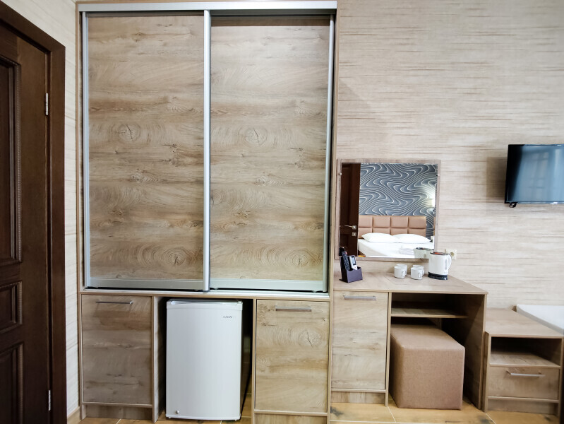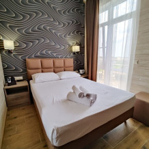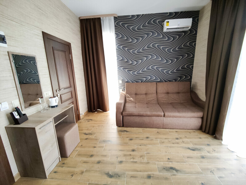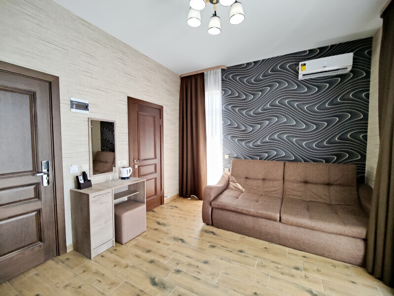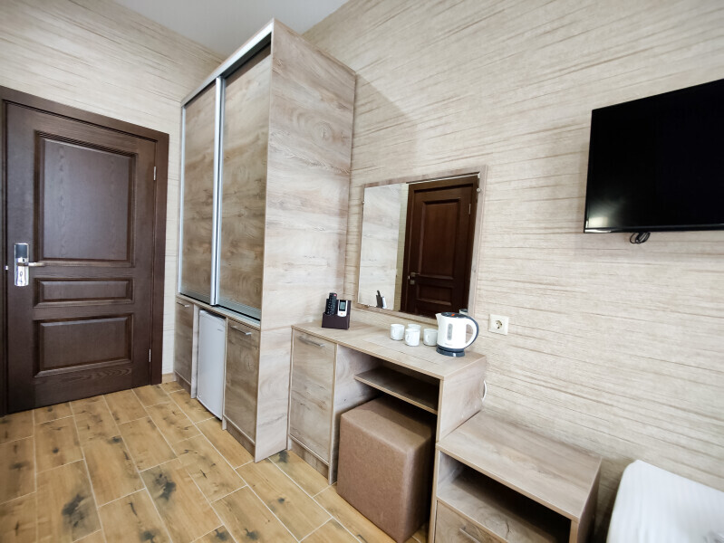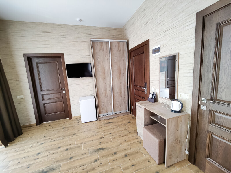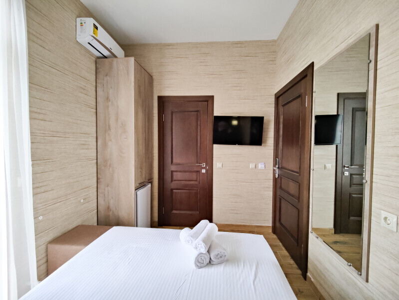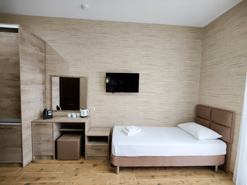 Трехэтажное здание оснащено бесшумным лифтом, архитектура и дизайн территории выполнены в гармоничном стиле. Отель предлагает 34 номера различных категорий: 2-местные полулюксы с двуспальной кроватью, 3-местные полулюксы с двуспальной и односпальной кроватями, 2-комнатные люксы для компаний из 5-7 человек. Каждый номер имеет балкон и оборудован кондиционером, телевизором, холодильником, вместительными шкафами. Предоставляется бесплатный Wi-Fi, на дверях установлены электронные замки. Уборка с заменой постельного белья производится каждые 3 дня. По Вашему желанию в 3-местный полулюкс есть возможность добавить дополнительное место. Стоимость дополнительного места - 500 рублей в сутки. Также есть возможность предоставления детской кроватки бесплатно.