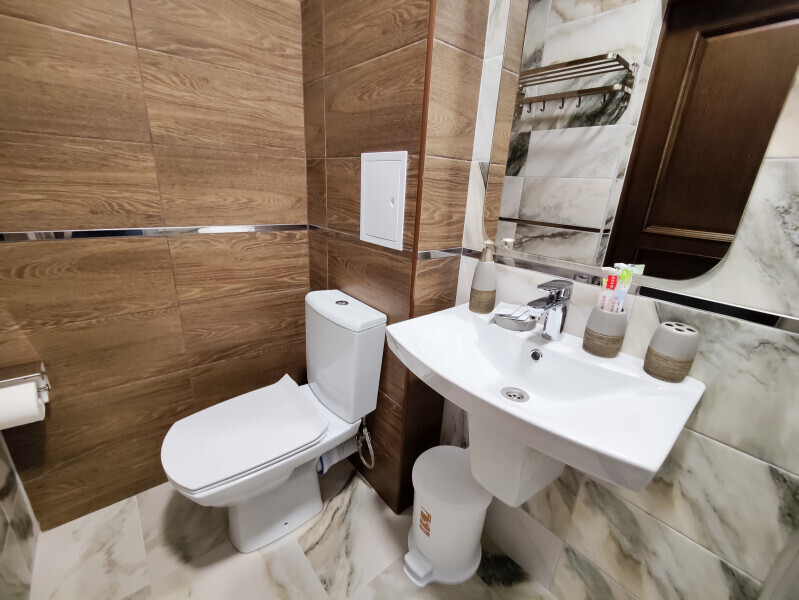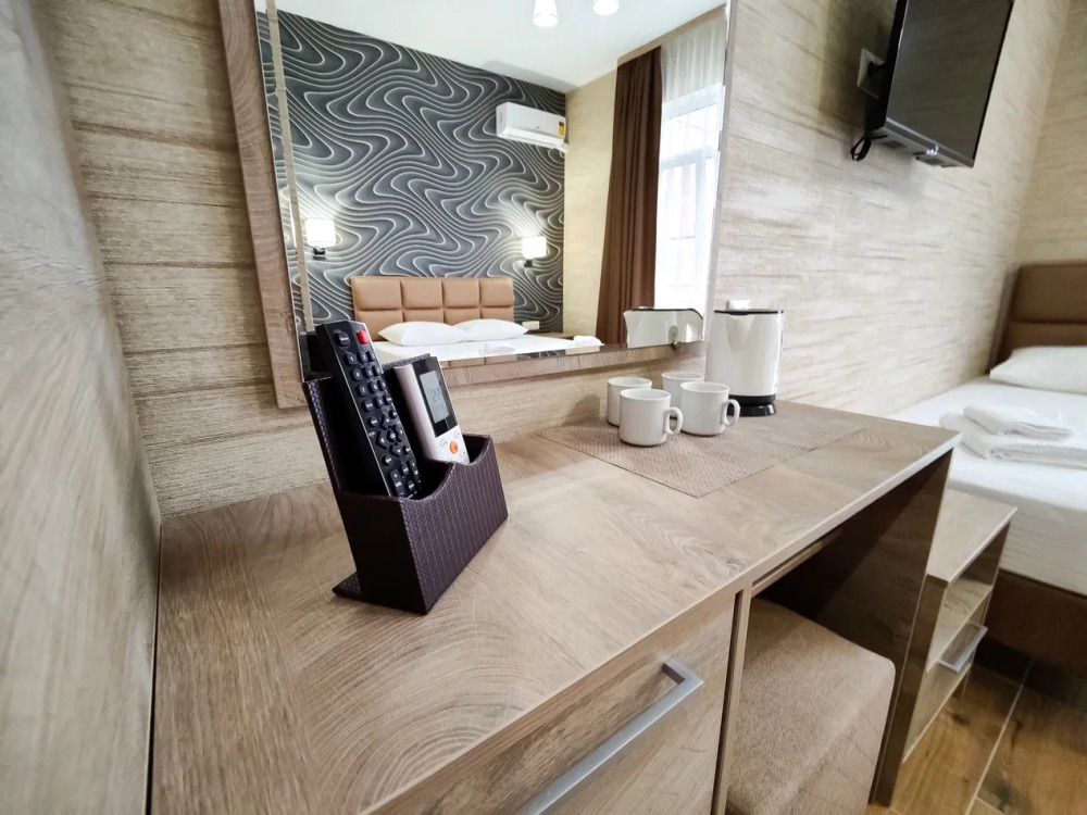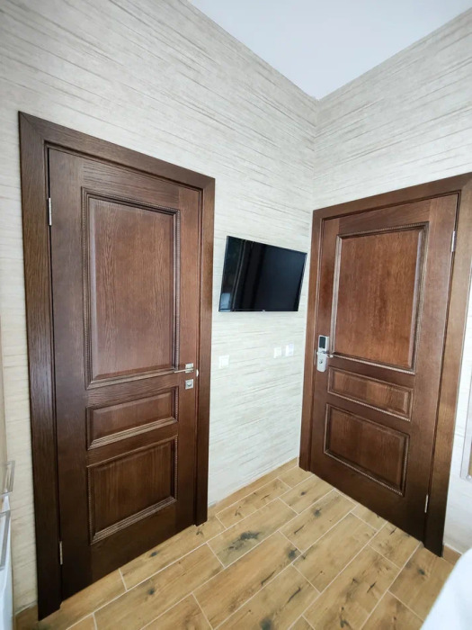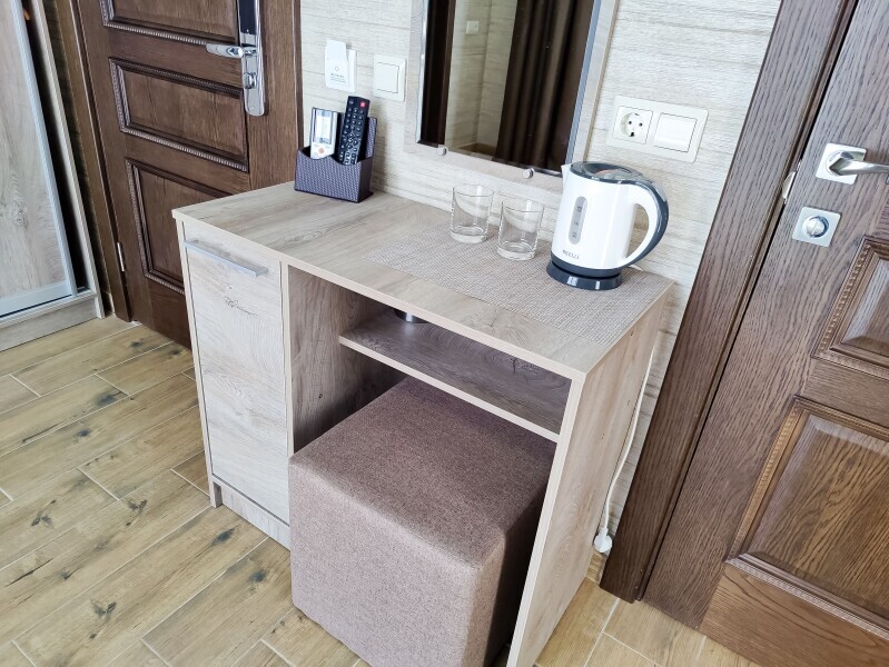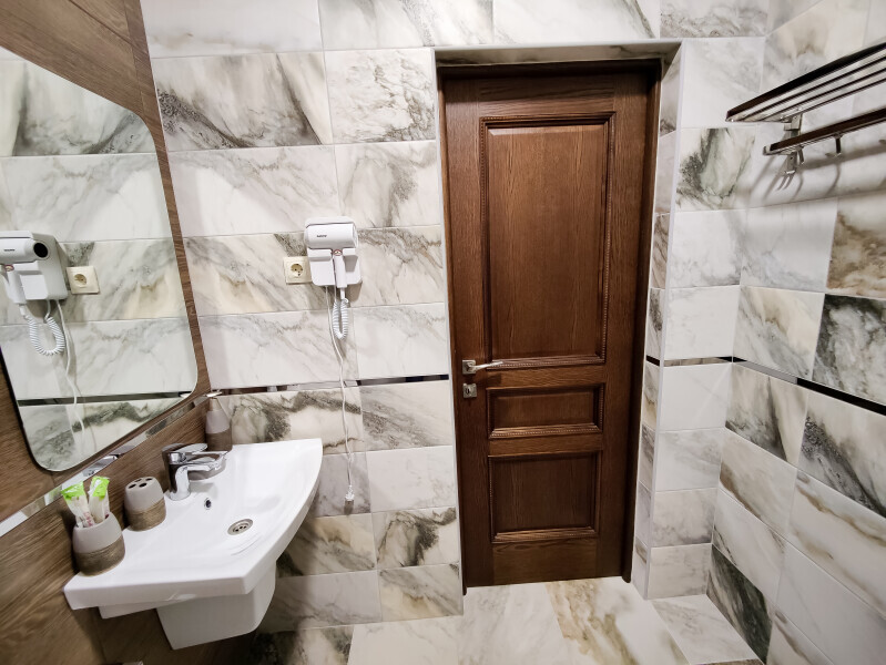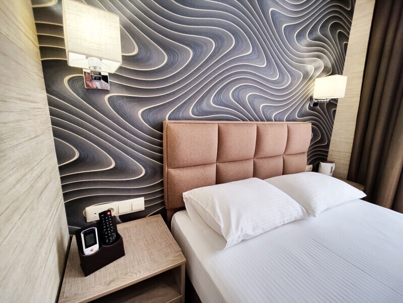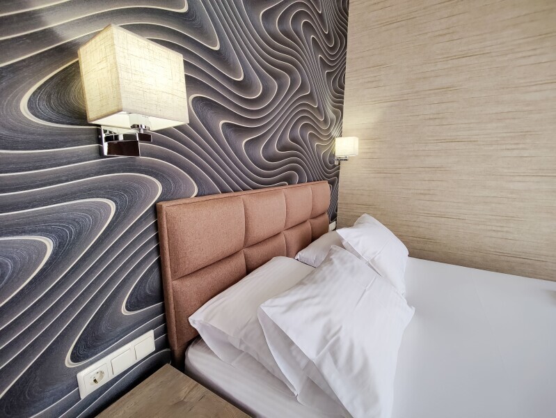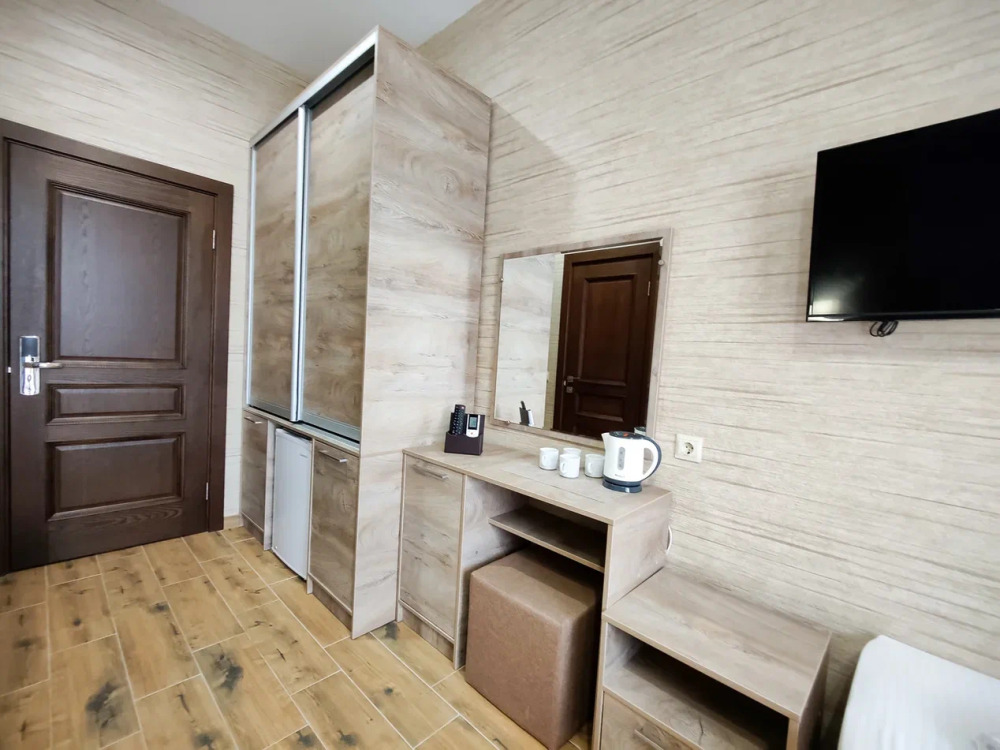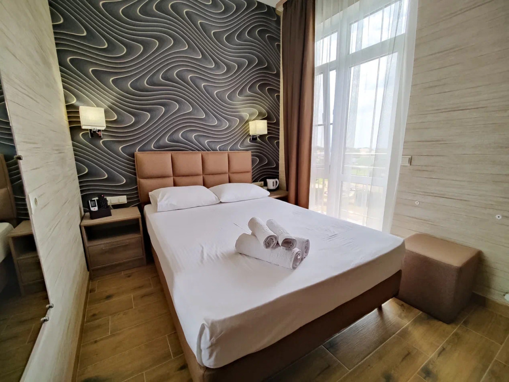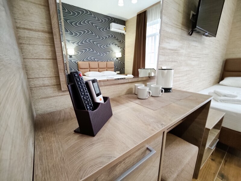 Трехэтажное здание оснащено бесшумным лифтом, архитектура и дизайн территории выполнены в гармоничном стиле. Отель предлагает 34 номера различных категорий: 2-местные полулюксы с двуспальной кроватью, 3-местные полулюксы с двуспальной и односпальной кроватями, 2-комнатные люксы для компаний из 5-7 человек. Каждый номер имеет балкон и оборудован кондиционером, телевизором, холодильником, вместительными шкафами. Предоставляется бесплатный Wi-Fi, на дверях установлены электронные замки. Уборка с заменой постельного белья производится каждые 3 дня. По Вашему желанию в 3-местный полулюкс есть возможность добавить дополнительное место. Стоимость дополнительного места - 500 рублей в сутки. Также есть возможность предоставления детской кроватки бесплатно.