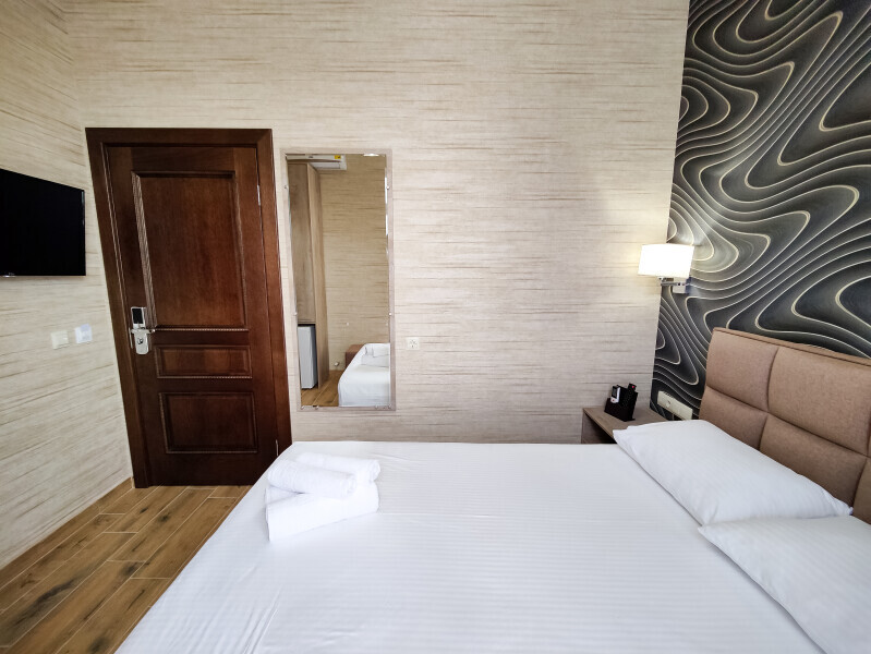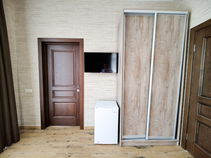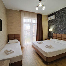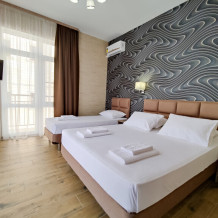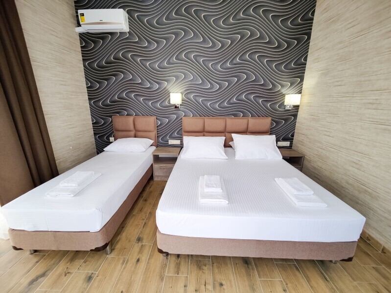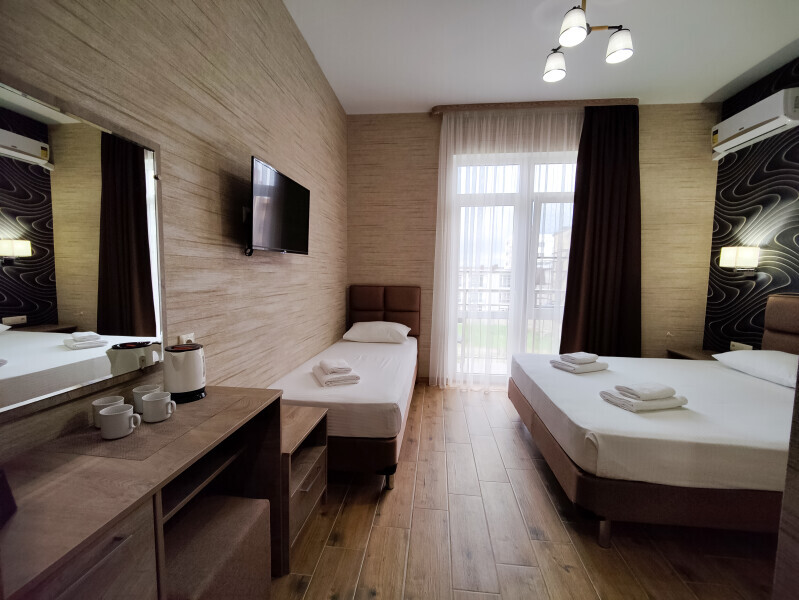 Трехместный полулюкс – превосходный вариант для семей с детьми или дружной компании. Номер оборудован холодильником, телевизором, кондиционером. В каждом номере – балкон. В качестве спальных мест гостям предлагается большая двуспальная и односпальная кровати.