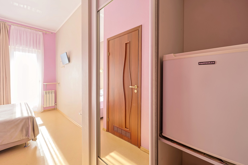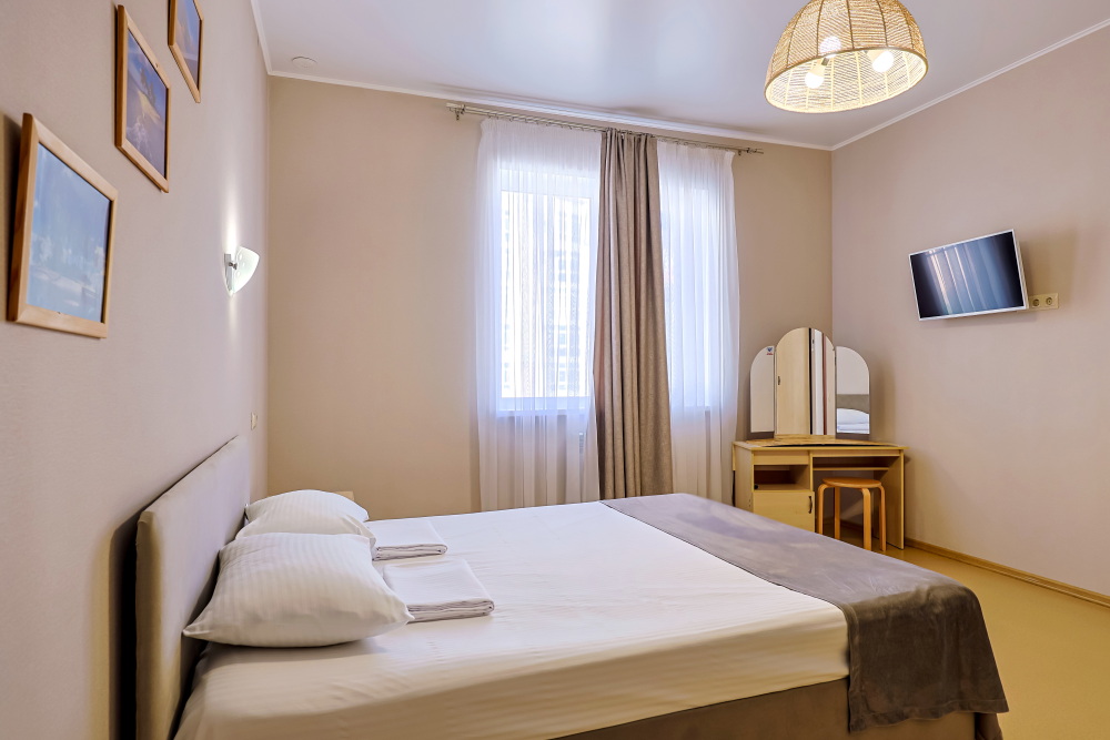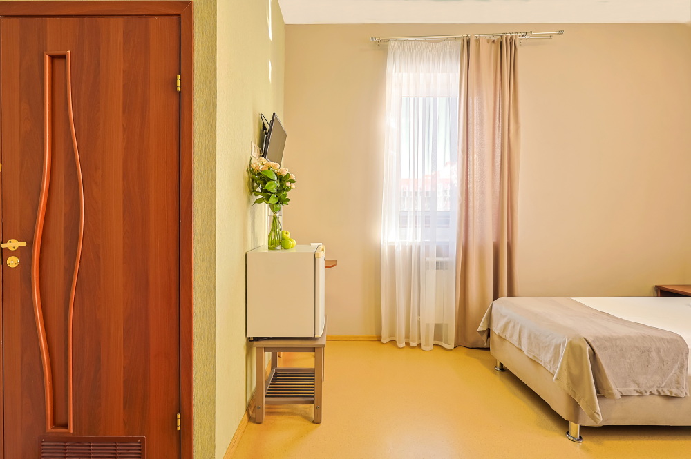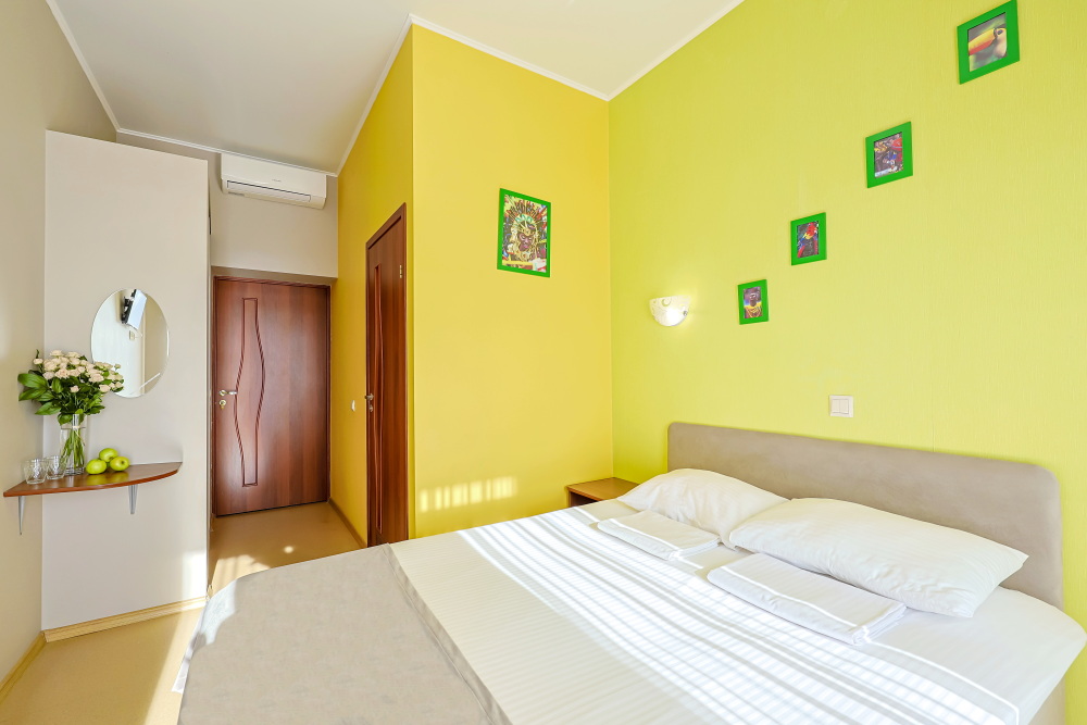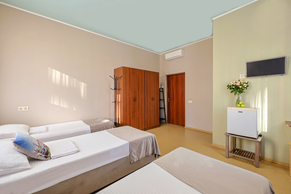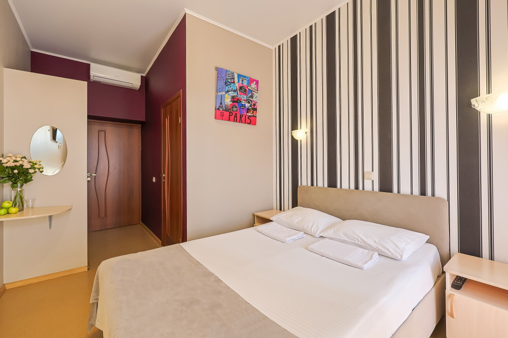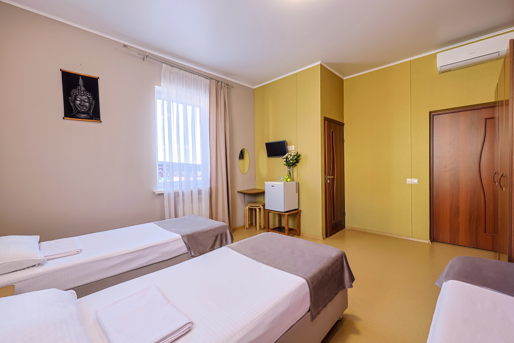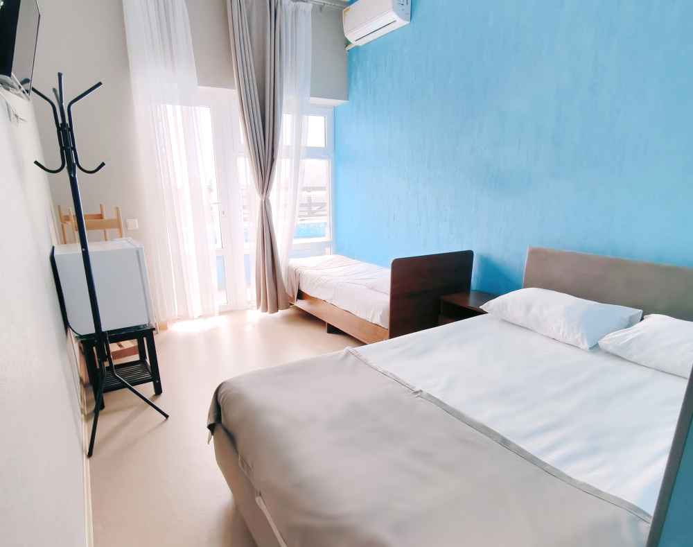 Однокомнатный номер с отдельным входом. Номер оснащен: двуспальная кровать и односпальная кровать, прикроватные тумбочки, шкаф, ТВ, кондиционер, мини-холодильник, бутилированная вода. Ванная комната: душ, раковина, туалет, полотенцесушитель, фен, гигиенические средства, халат, тапочки.