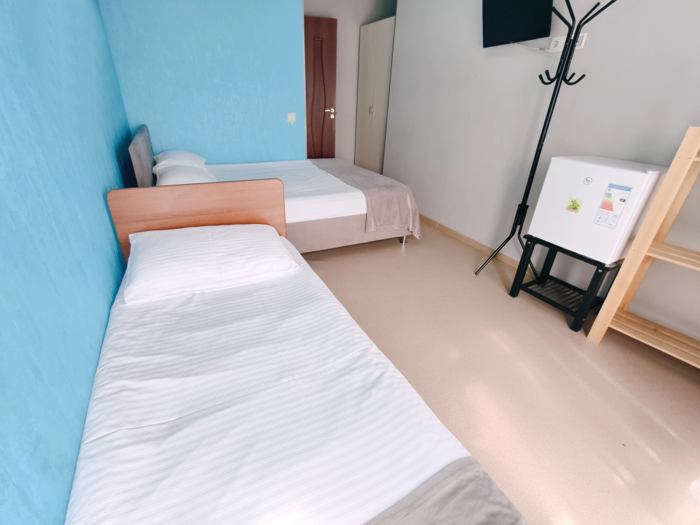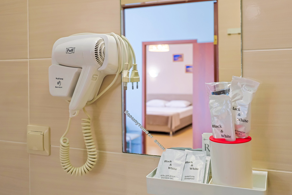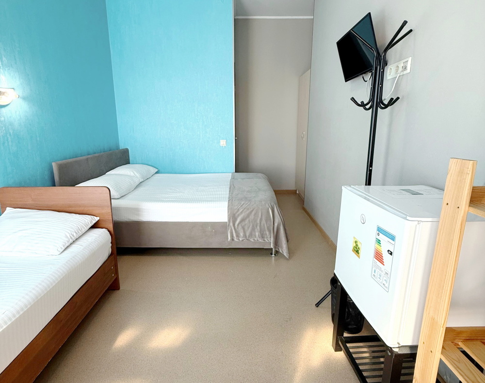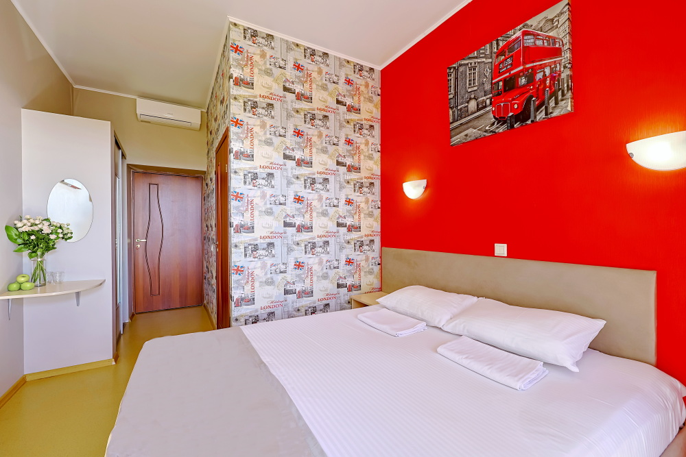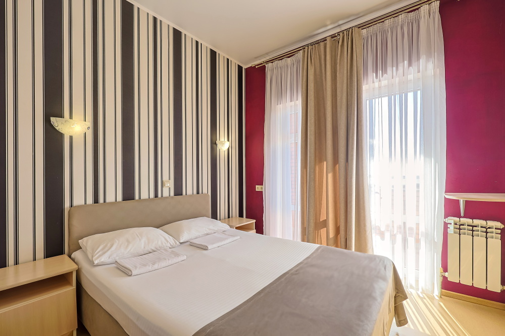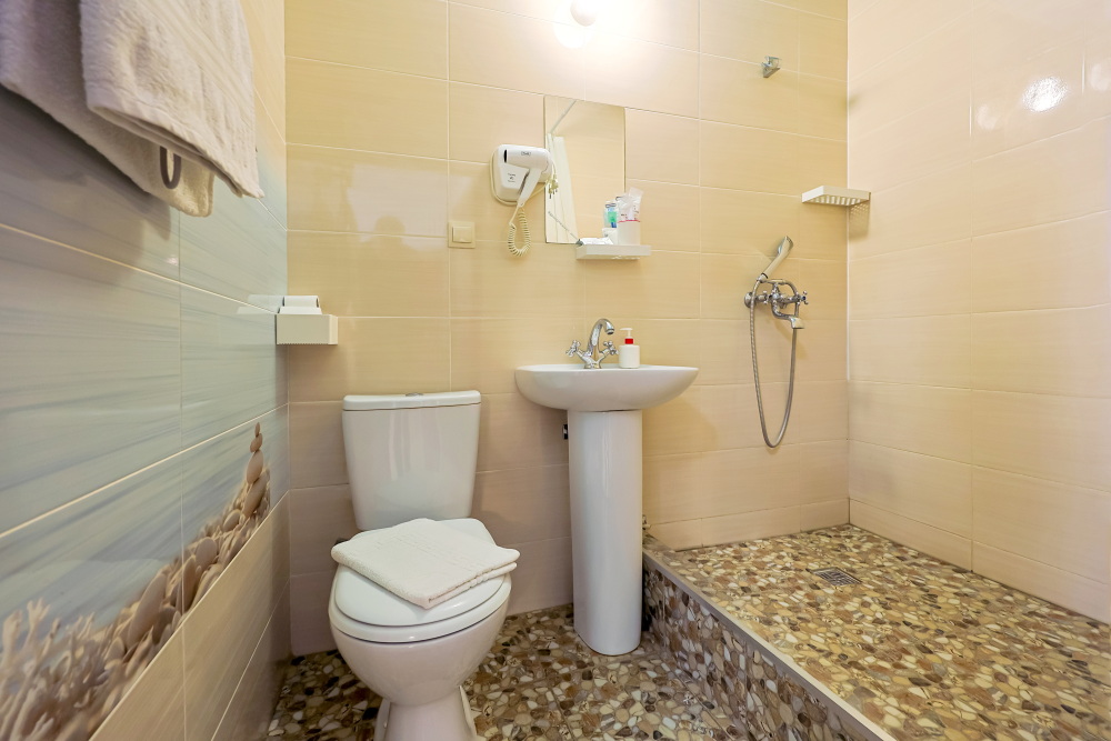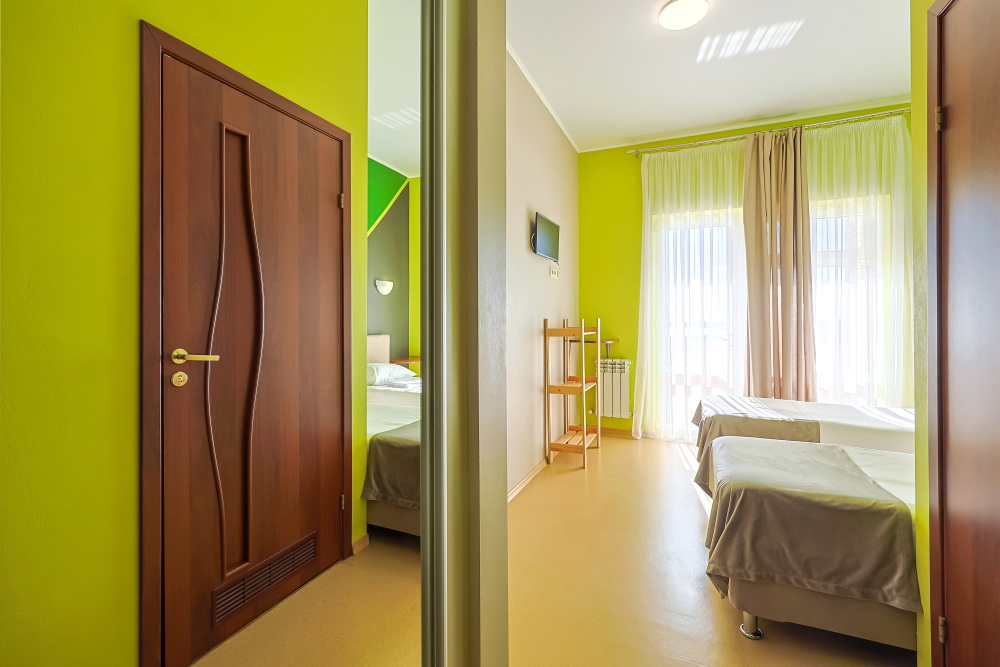 Однокомнатный номер с отдельным входом. Номер оснащен: двуспальная кровать и односпальная кровать, прикроватные тумбочки, шкаф, ТВ, кондиционер, мини-холодильник, бутилированная вода. Ванная комната: душ, раковина, туалет, полотенцесушитель, фен, гигиенические средства, халат, тапочки.