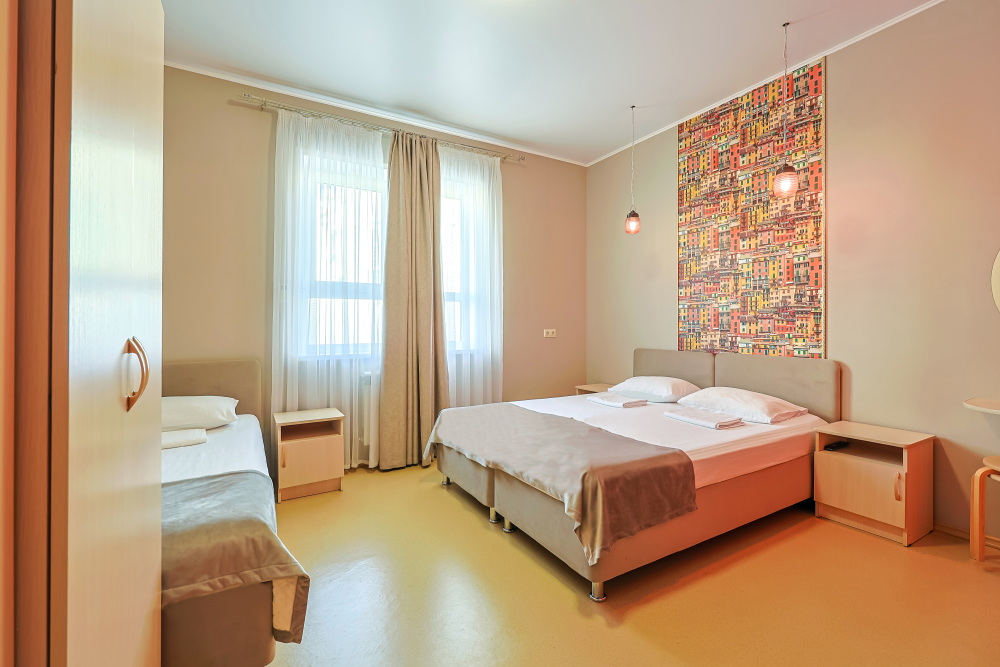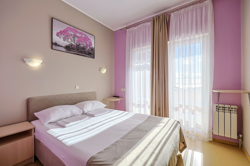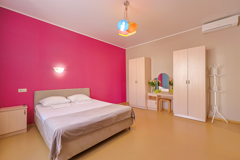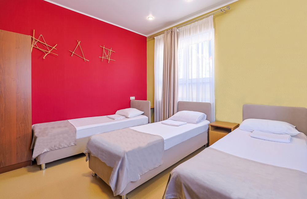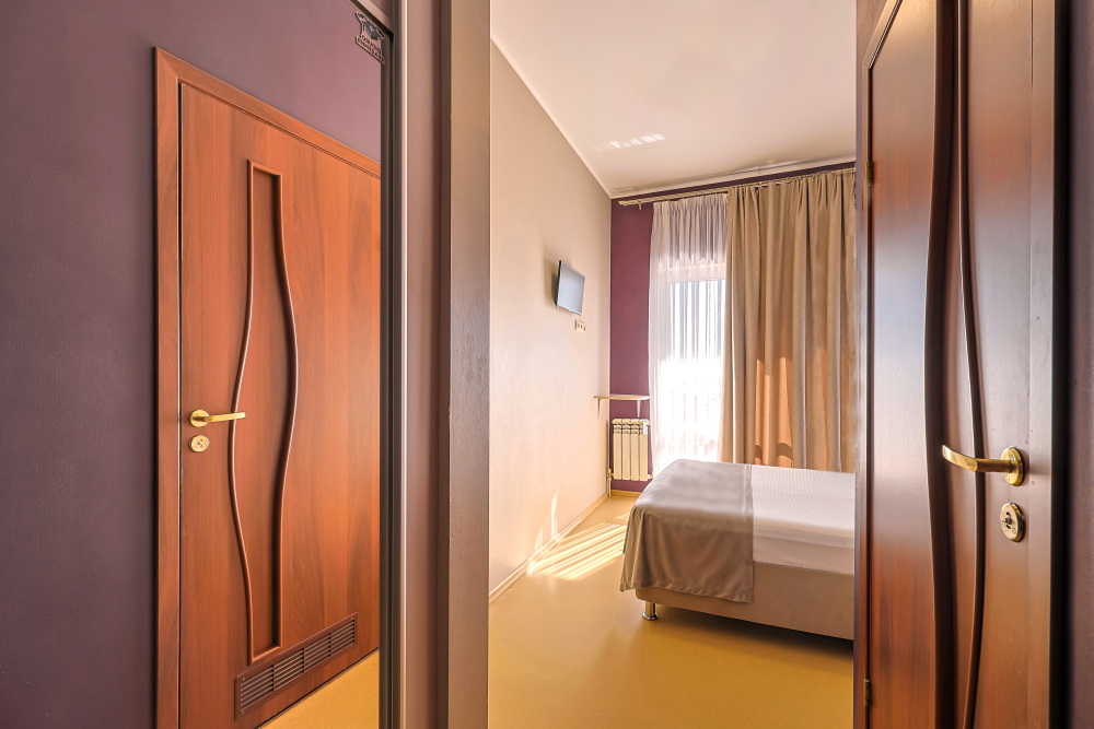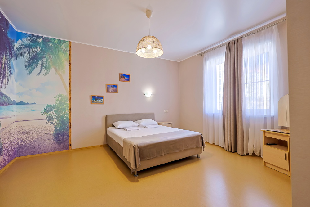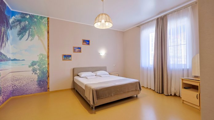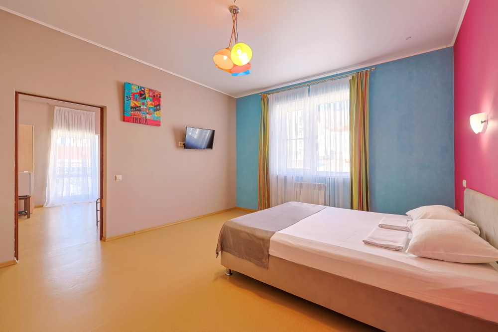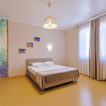 Однокомнатный номер с отдельным входом. Номер оснащен: двуспальная кровать и односпальная кровать, прикроватные тумбочки, шкаф, ТВ, кондиционер, мини-холодильник, бутилированная вода. Ванная комната: душ, раковина, туалет, полотенцесушитель, фен, гигиенические средства, халат, тапочки.