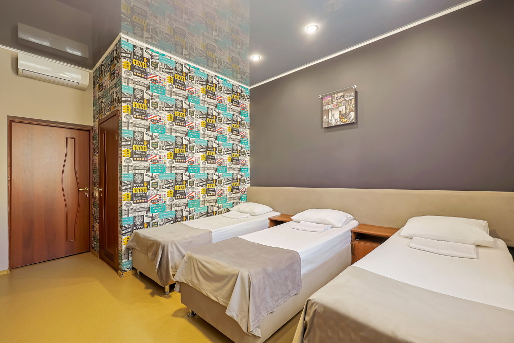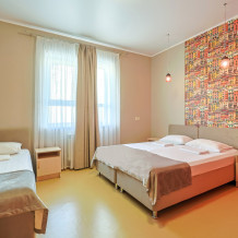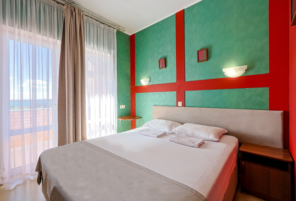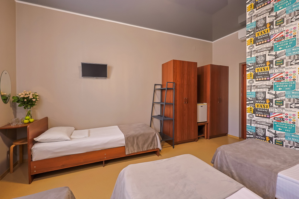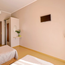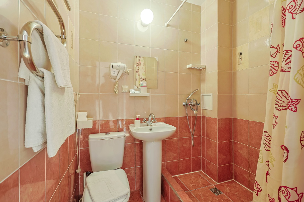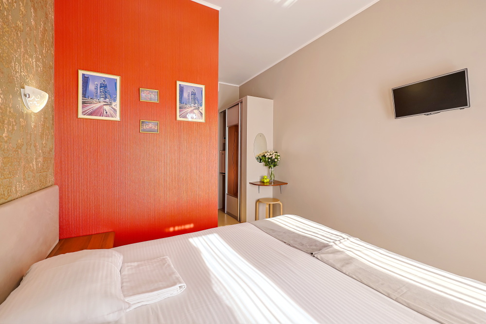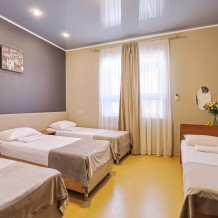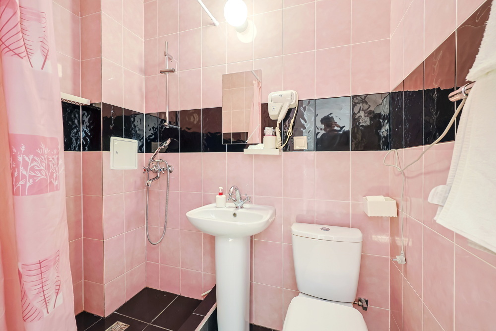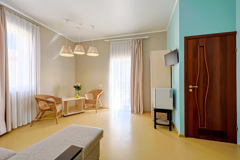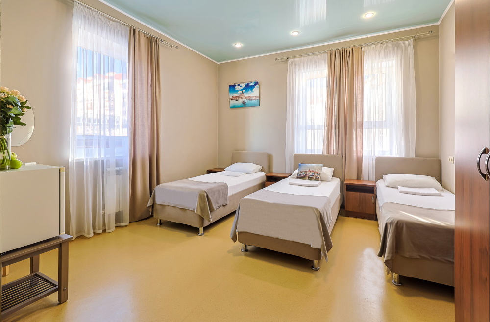 Однокомнатный номер с отдельным входом. Номер оснащен: двуспальная кровать и односпальная кровать, прикроватные тумбочки, шкаф, ТВ, кондиционер, мини-холодильник, бутилированная вода. Ванная комната: душ, раковина, туалет, полотенцесушитель, фен, гигиенические средства, халат, тапочки.