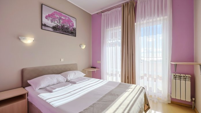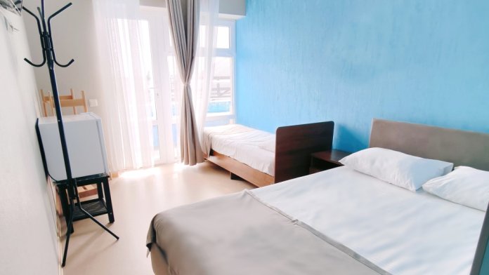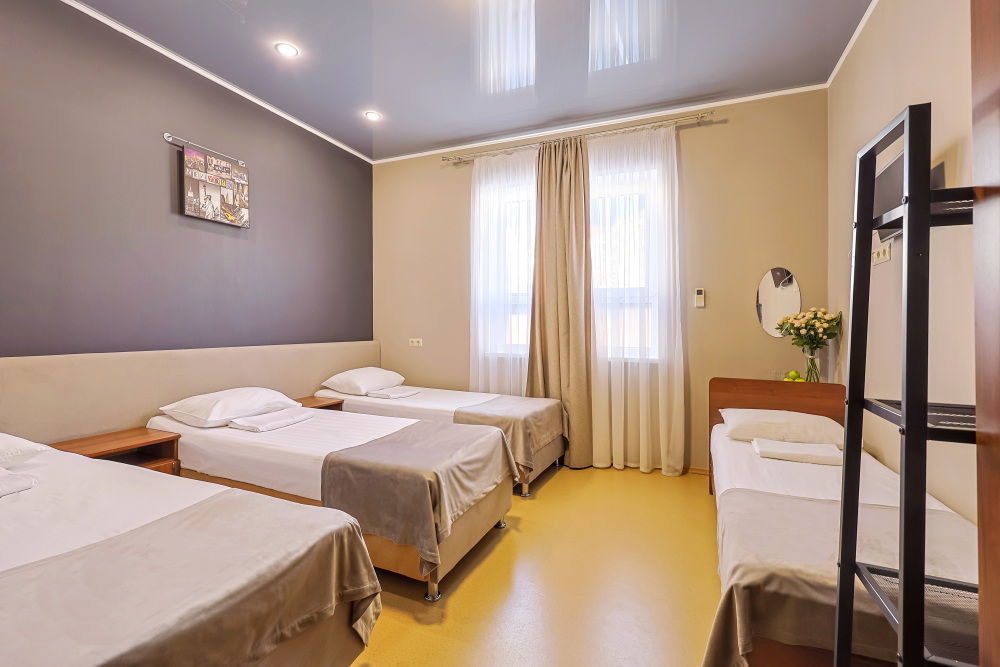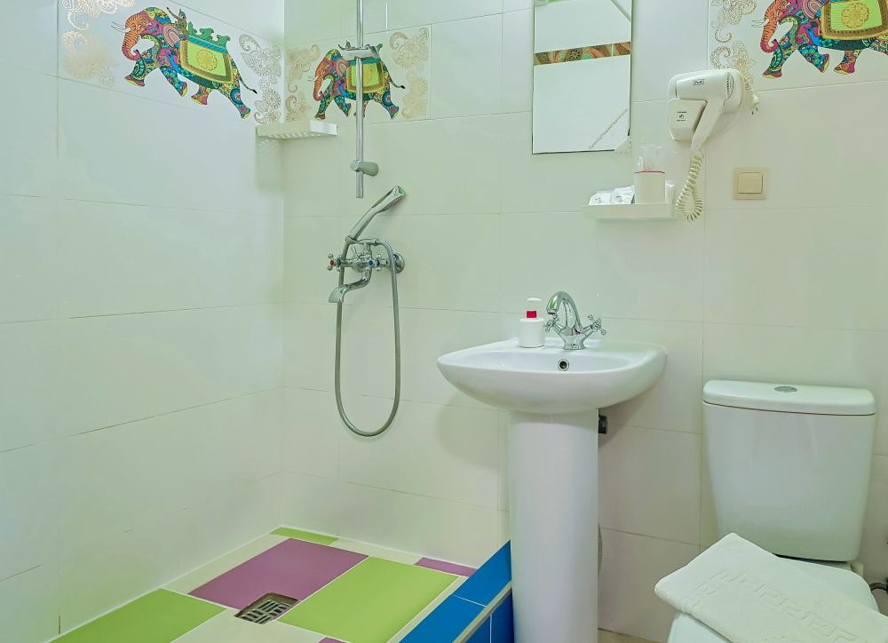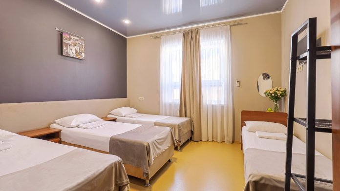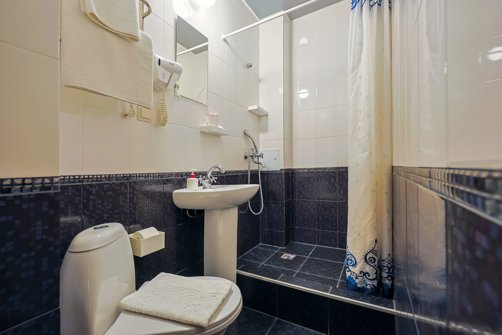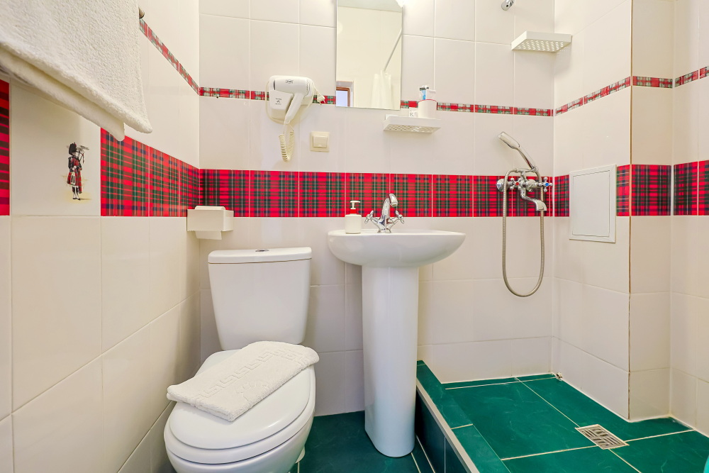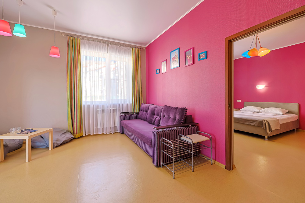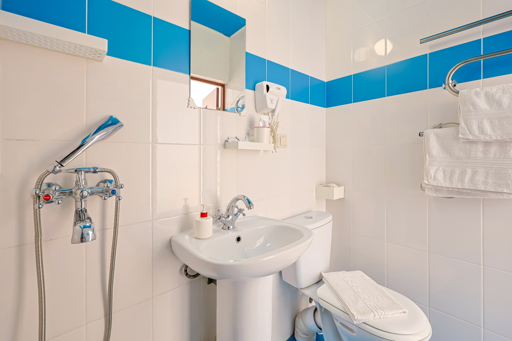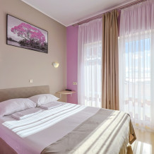 Однокомнатный номер с отдельным входом. Номер оснащен: двуспальная кровать и односпальная кровать, прикроватные тумбочки, шкаф, ТВ, кондиционер, мини-холодильник, бутилированная вода. Ванная комната: душ, раковина, туалет, полотенцесушитель, фен, гигиенические средства, халат, тапочки.
