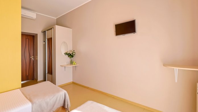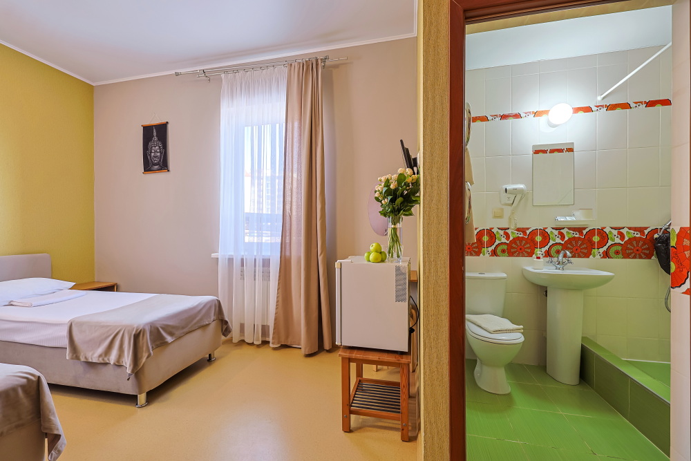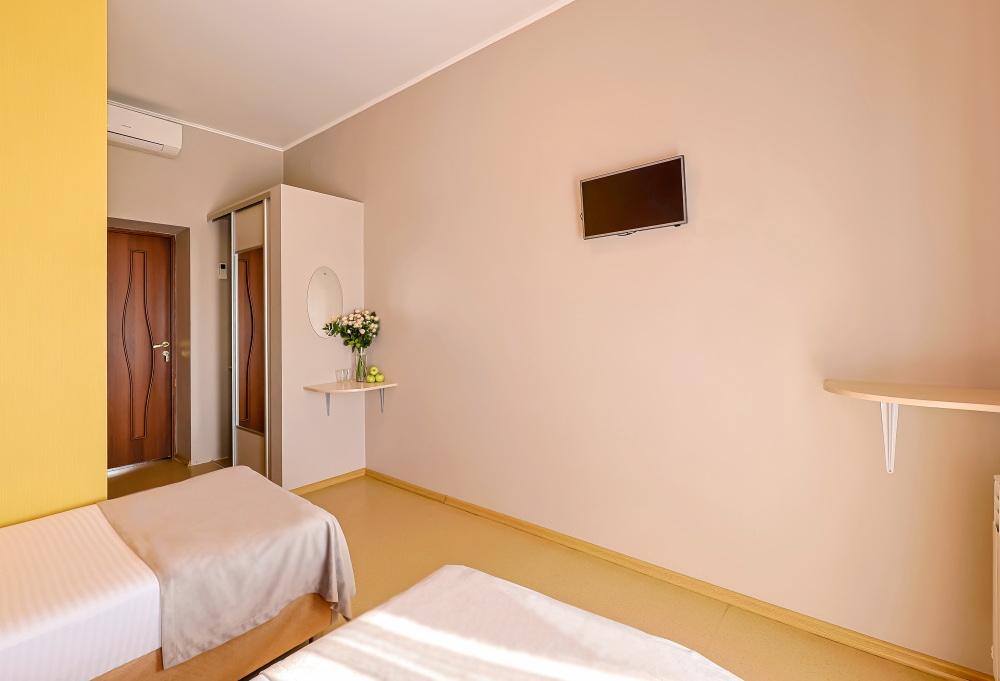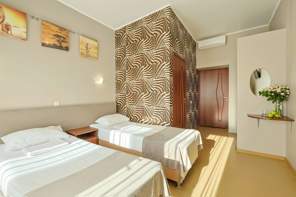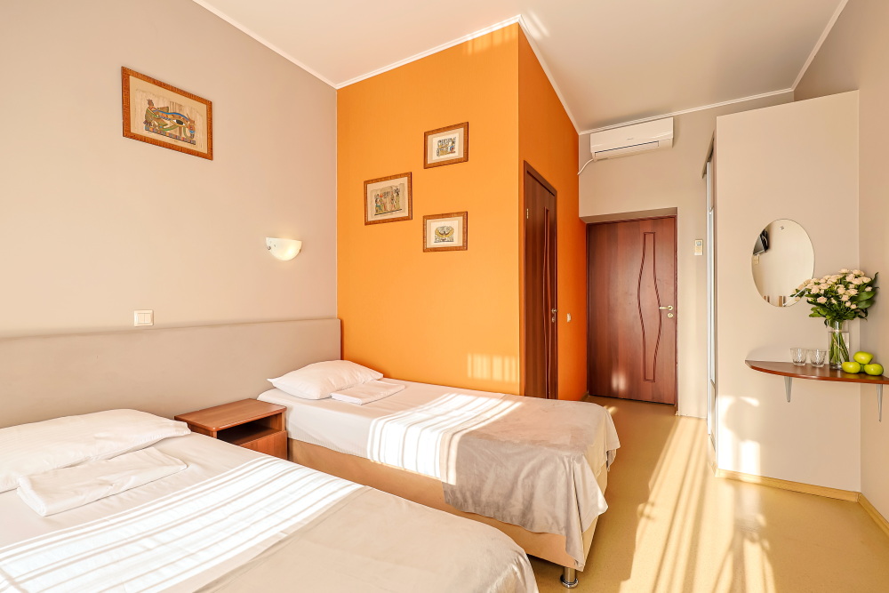 Номер оснащен: две односпальные кровати, прикроватные тумбочки, шкаф, ТВ, кондиционер, мини-холодильник, бутилированная вода. Ванная комната: душ, раковина, туалет, полотенцесушитель, фен, гигиенические принадлежности, халат, тапочки.