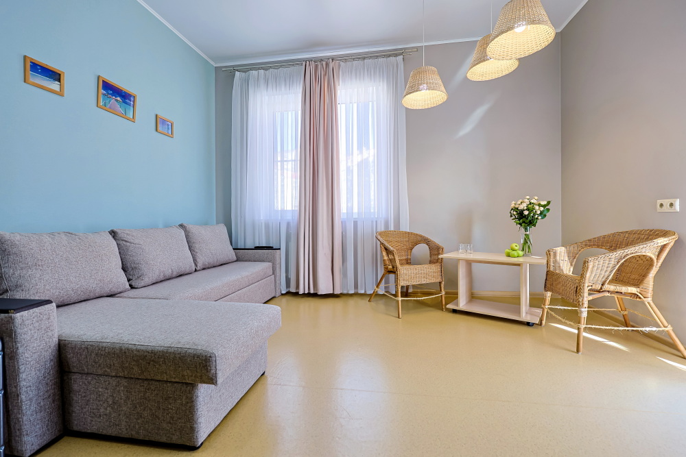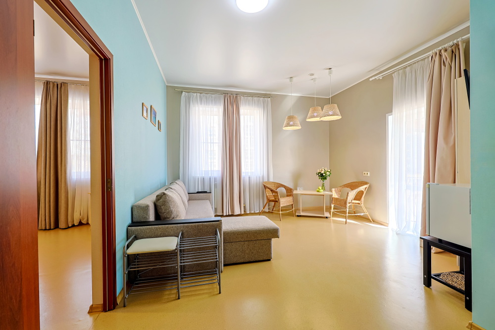 Тип кровати: двуспальная кровать + односпальный диван + 2 односпальные кровати или 2 двуспальные кровати + односпальный диван. Гостиная: двуспальный диван, шкаф, вешалка, ТВ, кондиционер, мини-холодильник, бутилированная вода. Спальня: двуспальная кровать, шкаф, туалетный столик, кондиционер, ТВ. Ванная комната: душ, раковина, туалет, полотенцесушитель, фен, гигиенические принадлежности, халат, тапочки. В номере есть небольшой французский балкон.