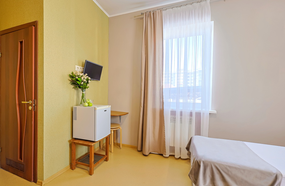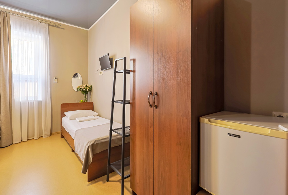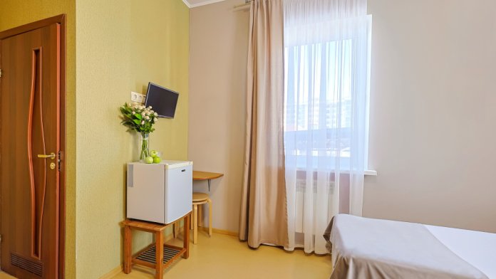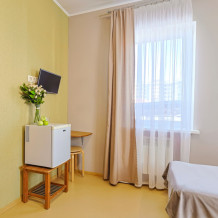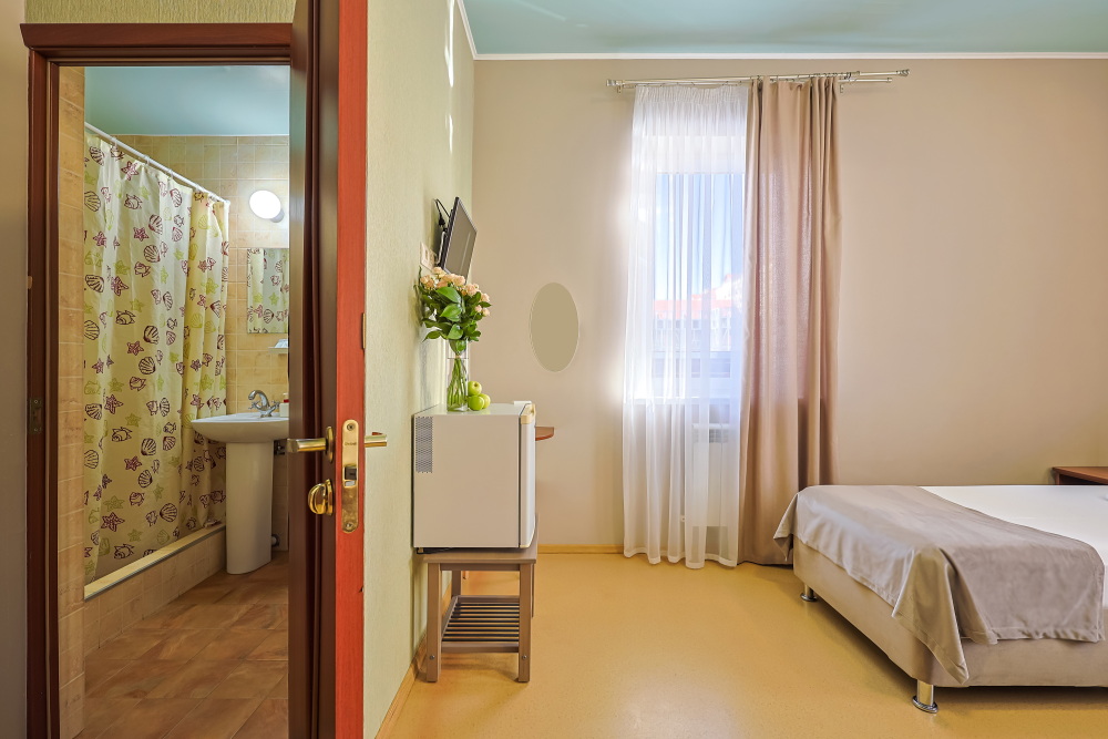 Номер оснащен: односпальная кровать, прикроватные тумбочки, шкаф, ТВ, кондиционер, мини-холодильник, бутилированная вода. Ванная комната: душ, раковина, туалет, полотенцесушитель, фен, гигиенические принадлежности, халат, тапочки.