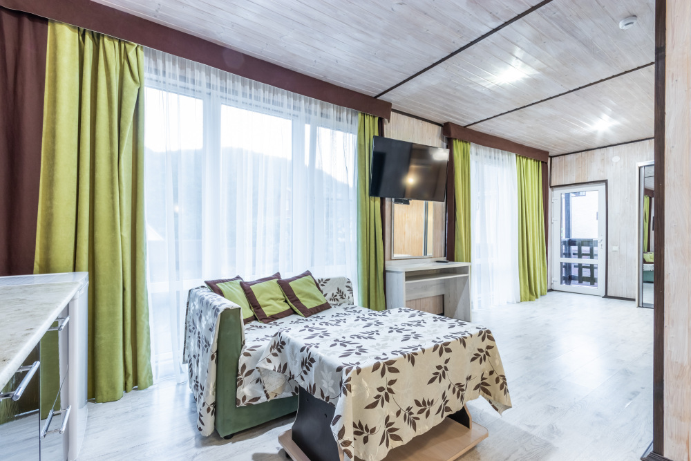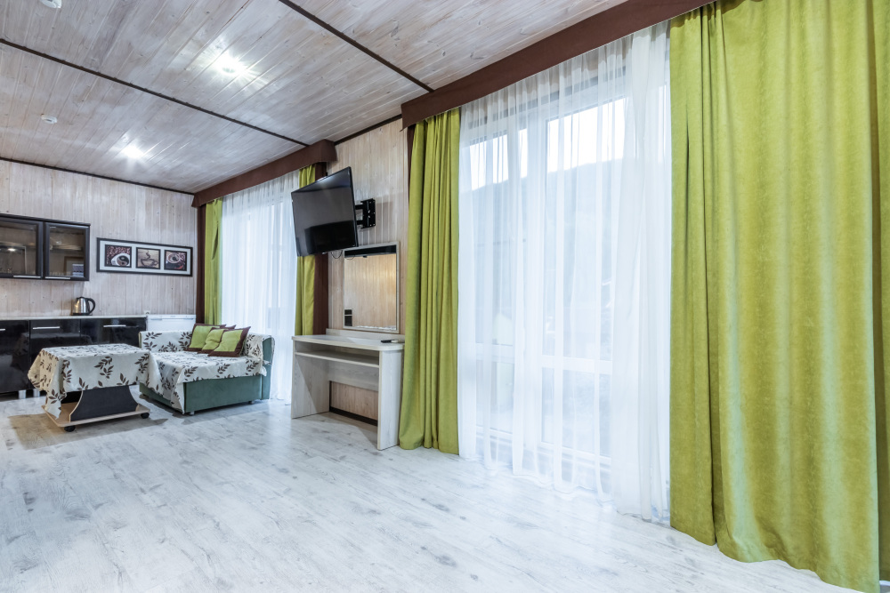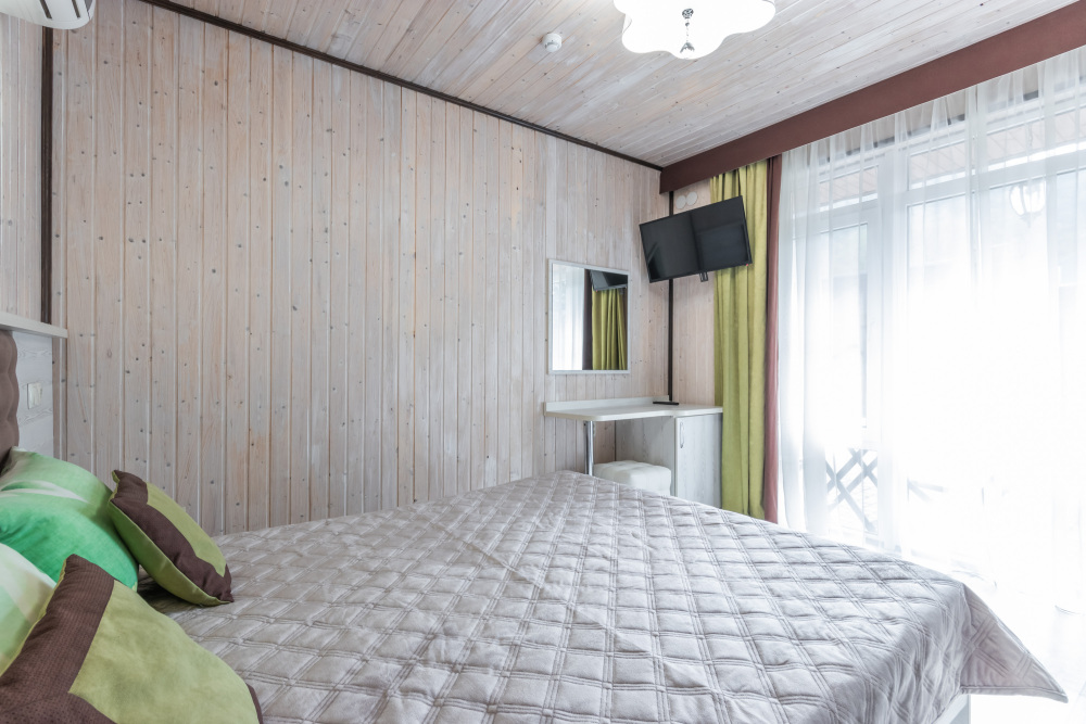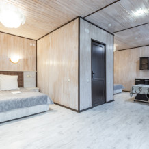 Также на базе отдыха имеются номера категории Люкс, сделанные по евростандарту. Комфортные кровати, большие плазменные телевизоры, сплит-системы, холодильники также в каждом номере. Душ и туалет в номере. Номера 2-3-местные, а также один большой номер люкс на 5-6 человек с собственной кухней и ванной, с восхитительным видом из окна на горы.