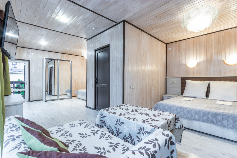 В номере: Две двуспальные кровати, две односпальные кровати, зеркало, шкаф, тумбочки, два ТВ, кондиционер, холодильник, совмещенный душ, туалет, полотенца все кроме пляжных, постельное белье, фен. Окна выходят во внутренний двор. Уборка 1 раз в 3 дня. Смена полотенец 1 раз в 3 дня. Смена постельного белья 1 раз в 5 дней.
