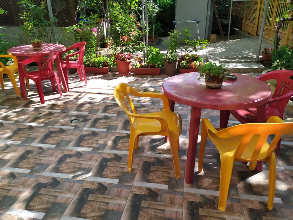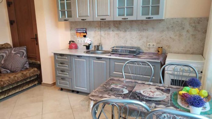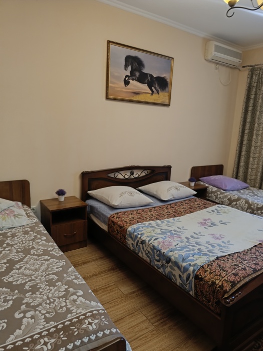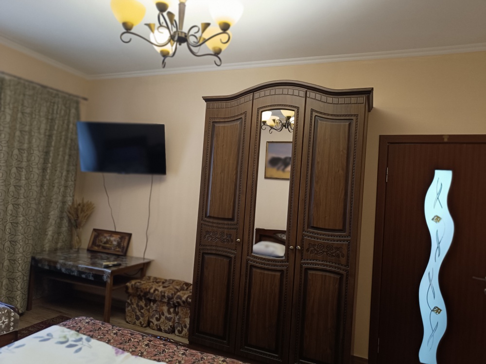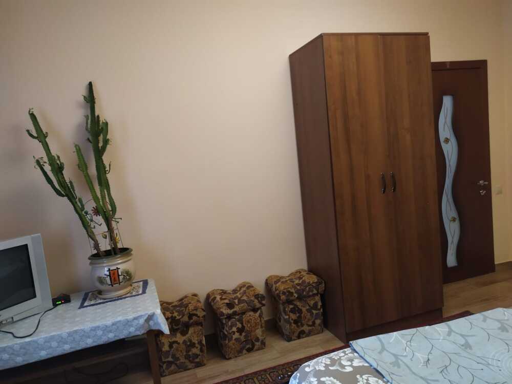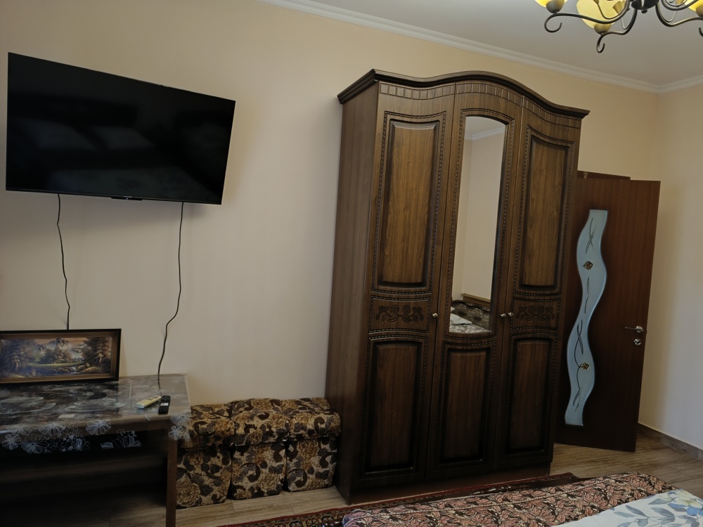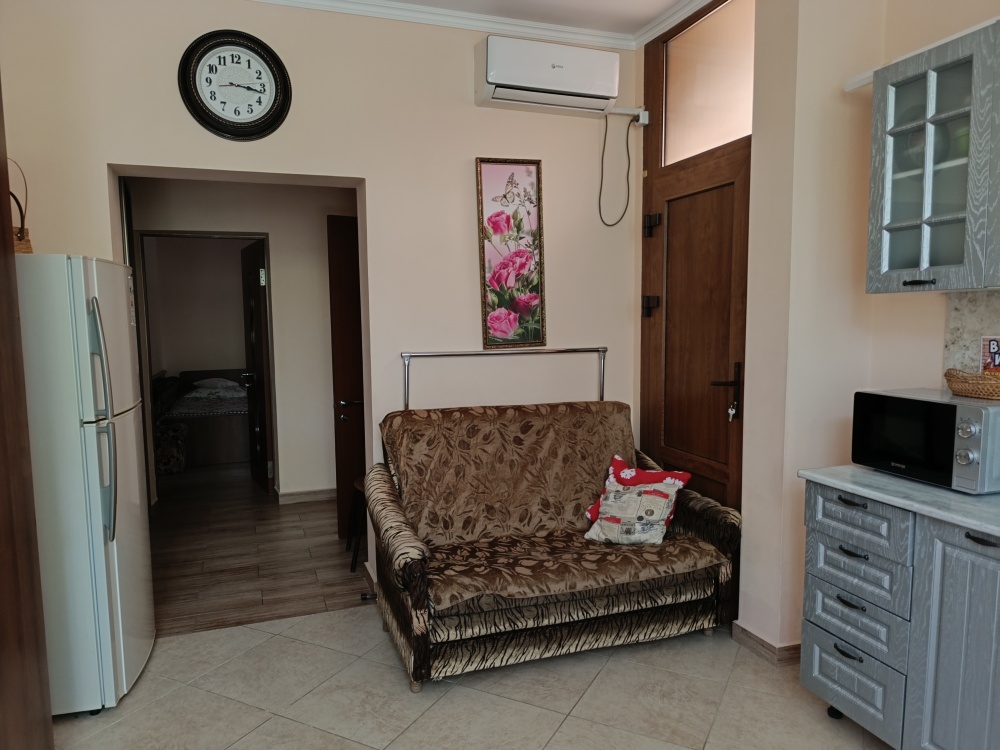 На территории имеется площадка для отдыха с беседкой из живого винограда, парковка, зона барбекю. Домик состоит из спальни, кухни и санузла. Имеется кондиционер, телевизор, холодильник, микроволновка. Все необходимые вещи для проживания имеются (постельное белье, посуда)Домик оборудован собственным навесом столиком для отдыха. Имеется видеонаблюдением и Wi-Fi. На территории проживает хозяин в отдельном доме. Цены указаны на 4 человек. Берём залог 2000.