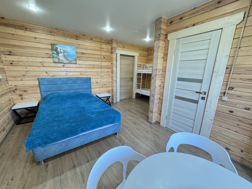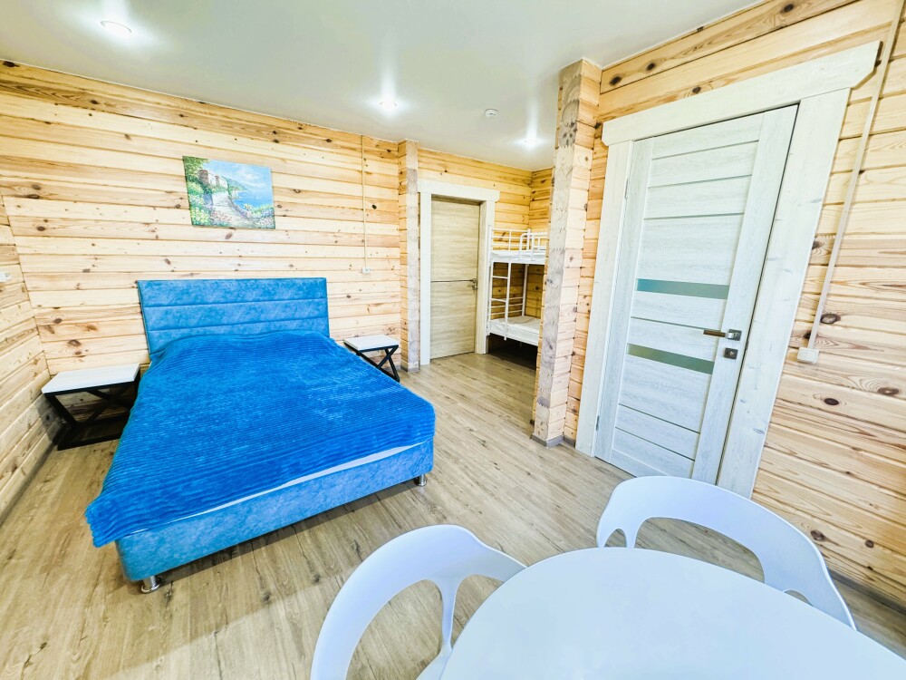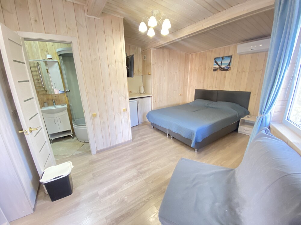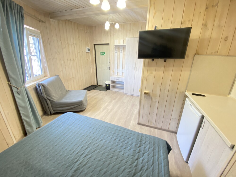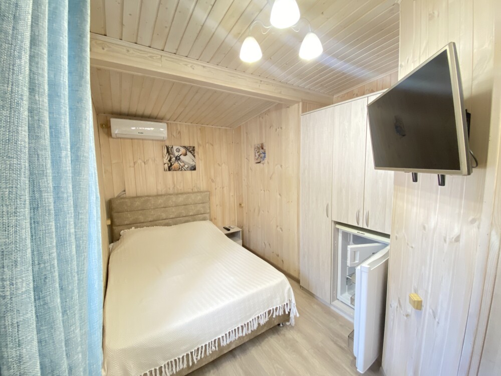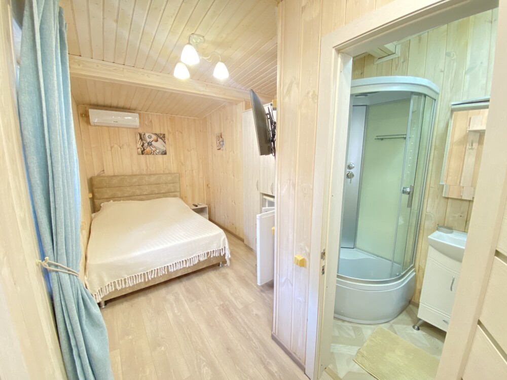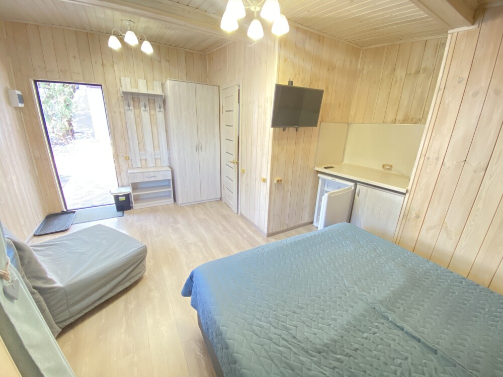 В номере большая двуспальная кровать (можно раздвинуть на 2 отдельные) + кресло-кровать. холодильник, сплит, телевизор. Рядом, за дверью, столики под столетним можжевельником, зона отдыха, общая кухня.