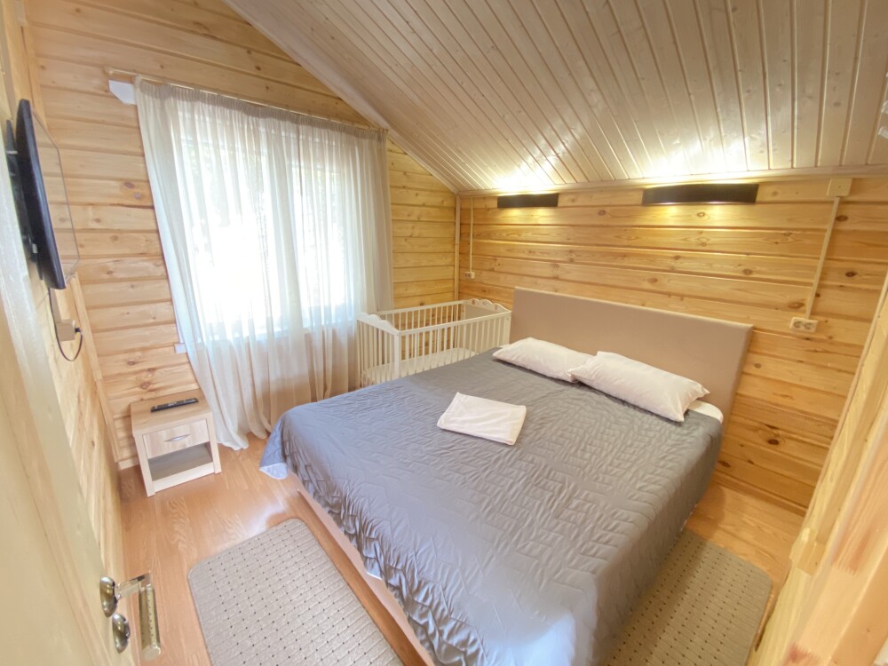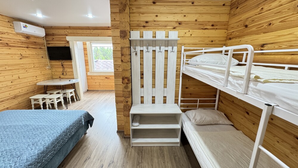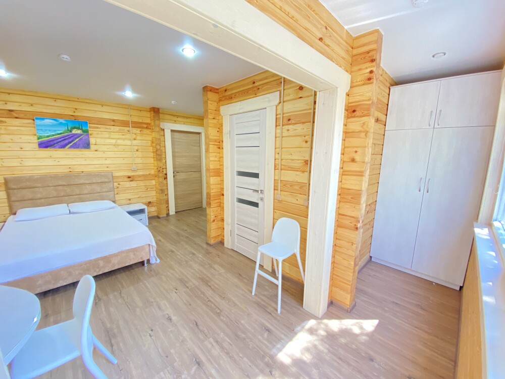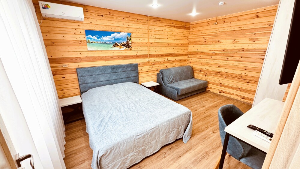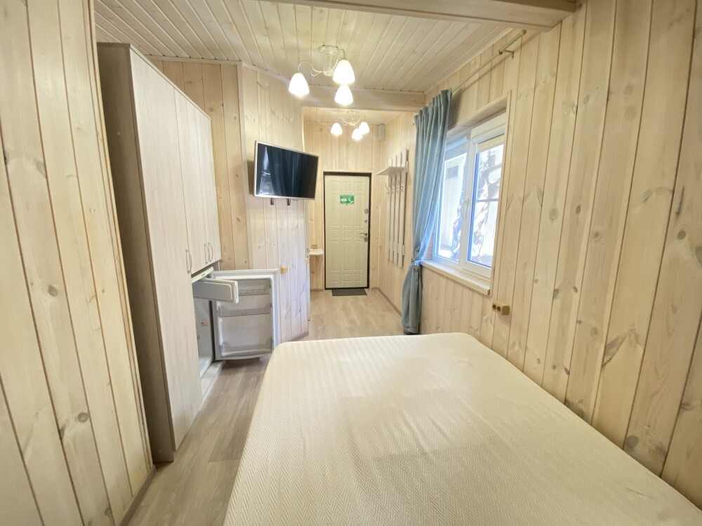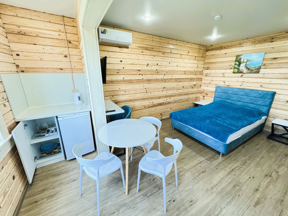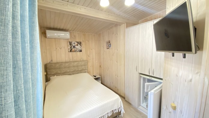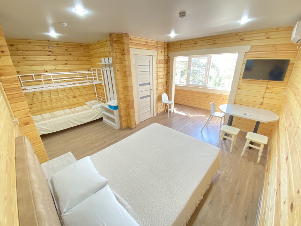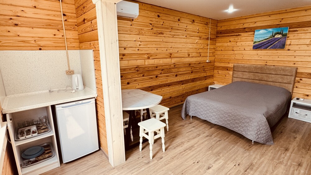 В номере большая двуспальная кровать (можно раздвинуть на 2 отдельные) + кресло-кровать. холодильник, сплит, телевизор. Рядом, за дверью, столики под столетним можжевельником, зона отдыха, общая кухня.