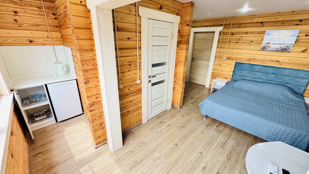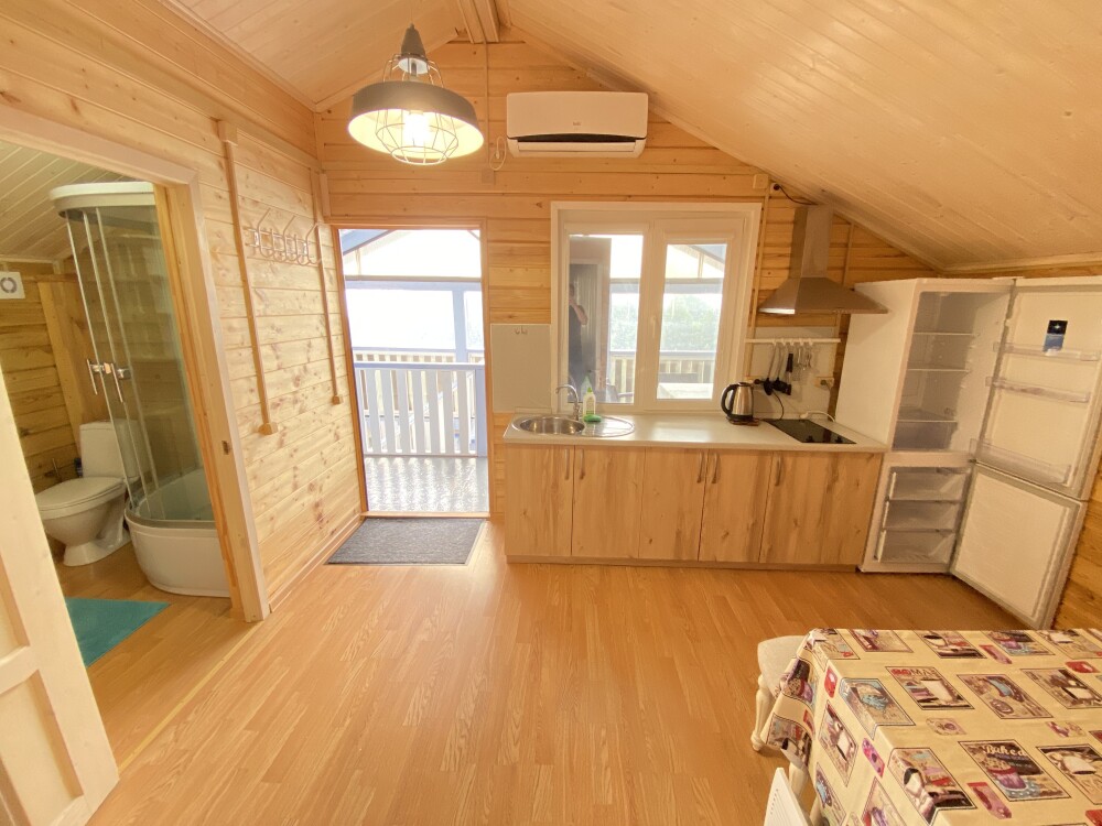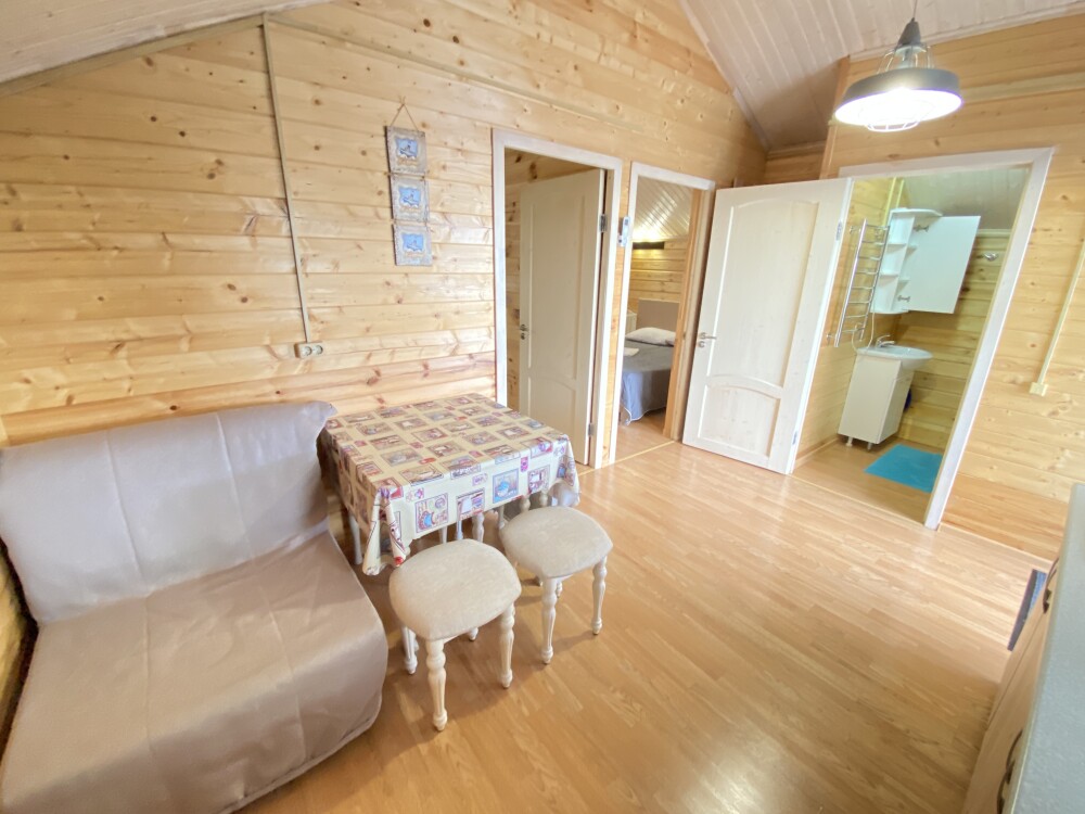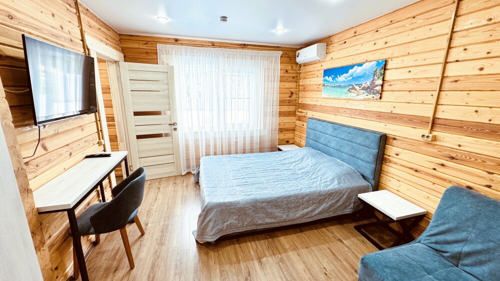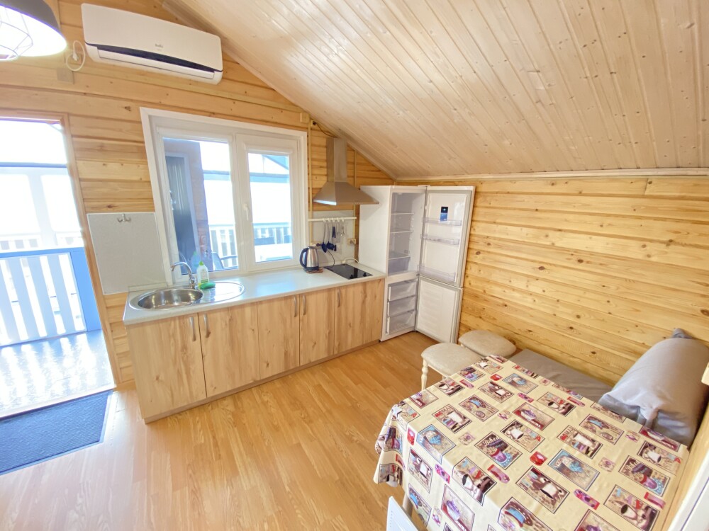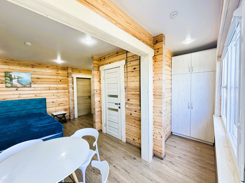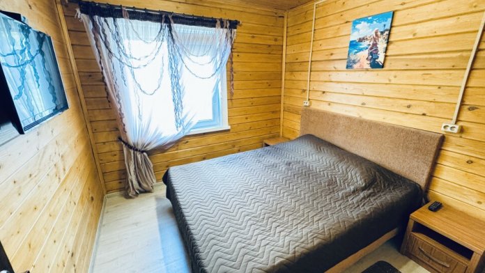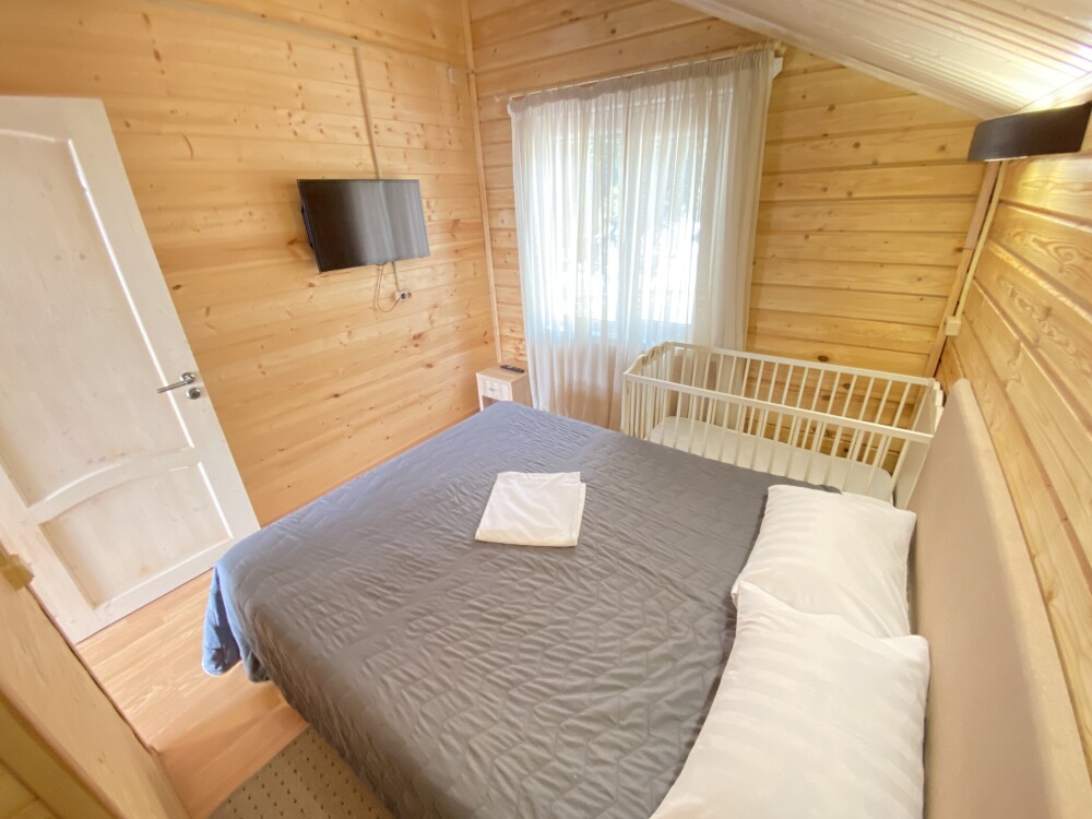 В номере большая двуспальная кровать (можно раздвинуть на 2 отдельные) + кресло-кровать. холодильник, сплит, телевизор. Рядом, за дверью, столики под столетним можжевельником, зона отдыха, общая кухня.
