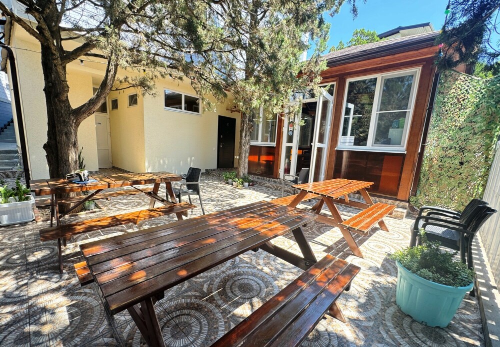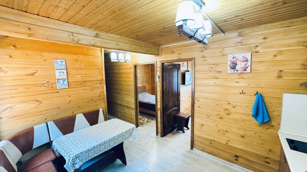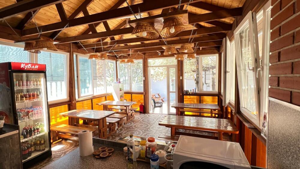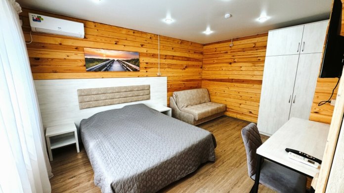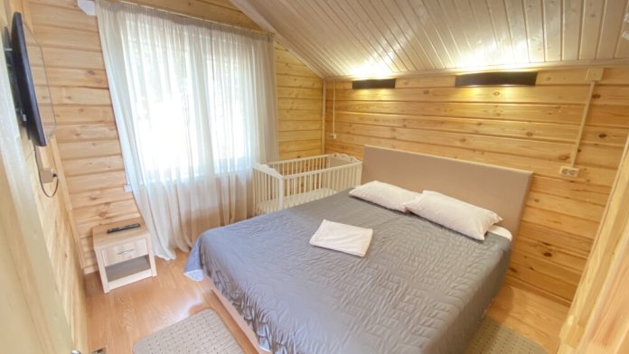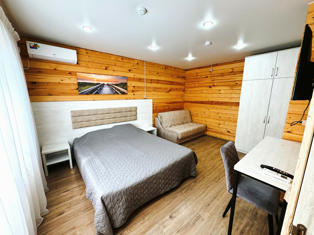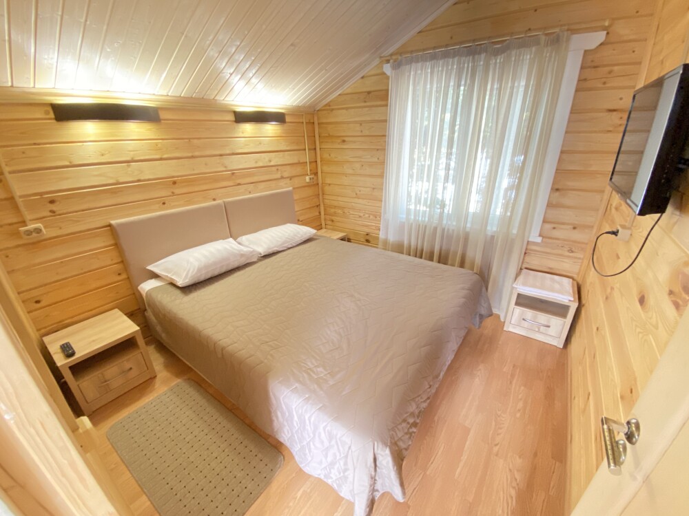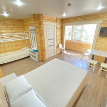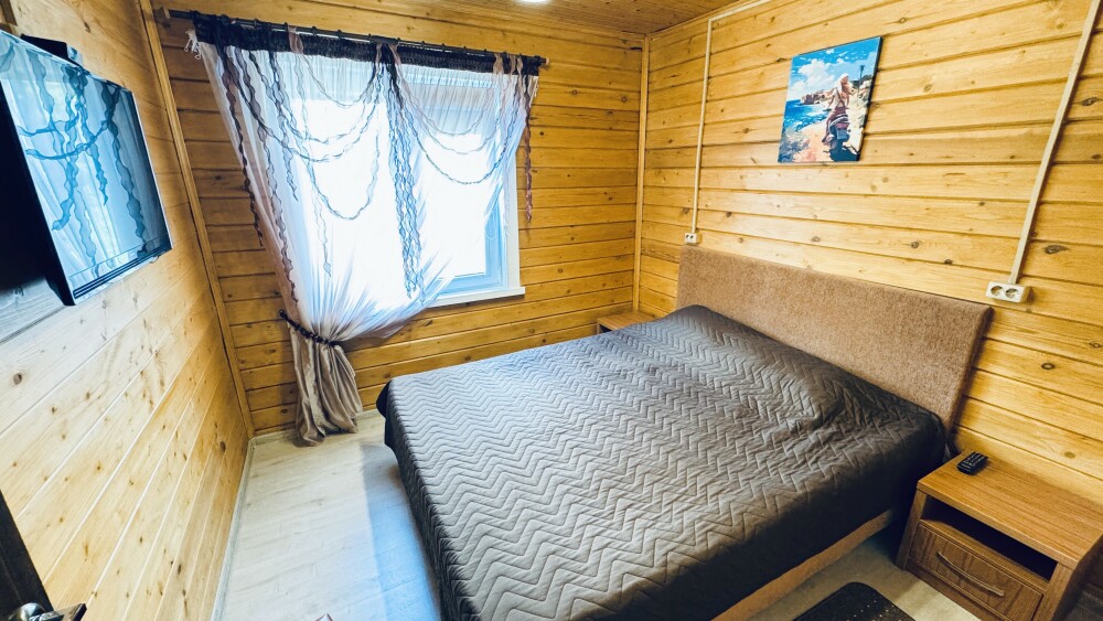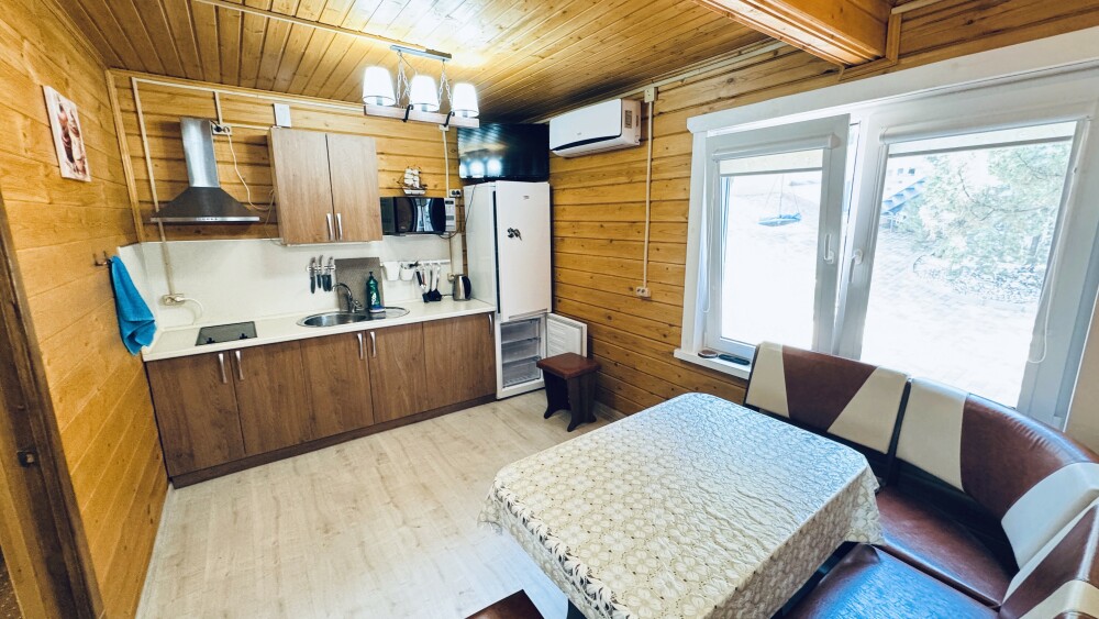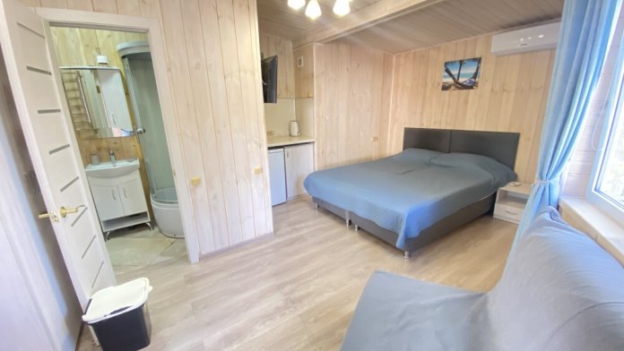 В номере большая двуспальная кровать (можно раздвинуть на 2 отдельные) + кресло-кровать. холодильник, сплит, телевизор. Рядом, за дверью, столики под столетним можжевельником, зона отдыха, общая кухня.