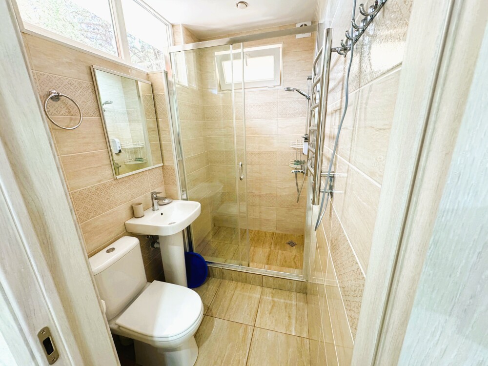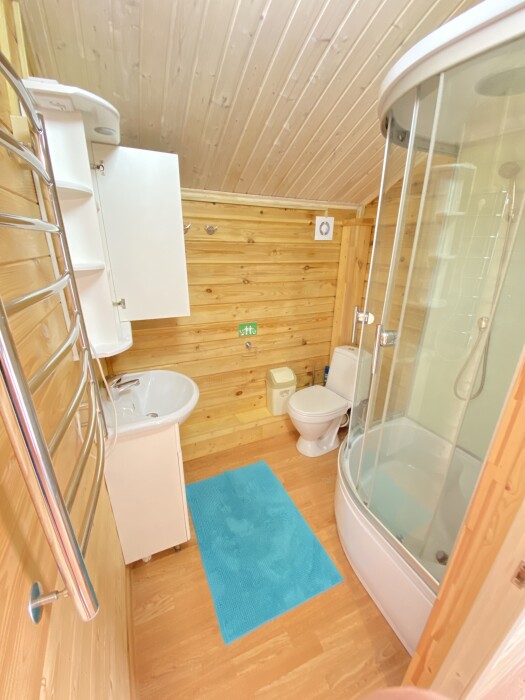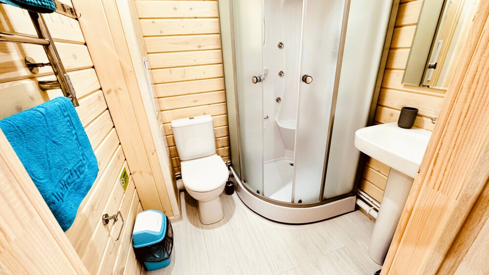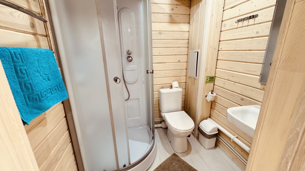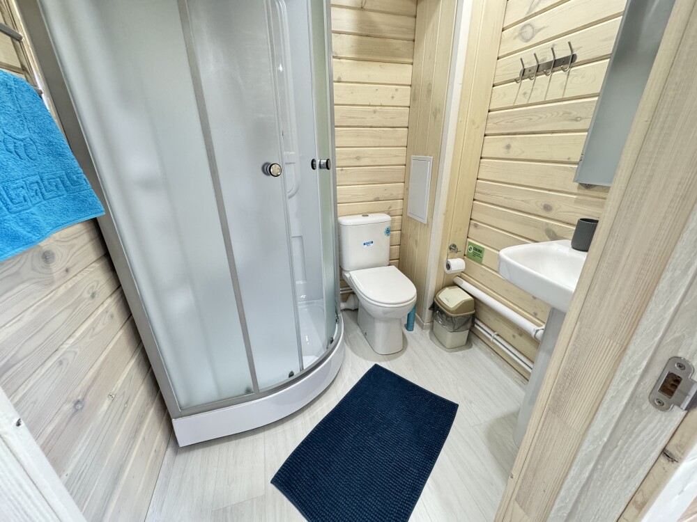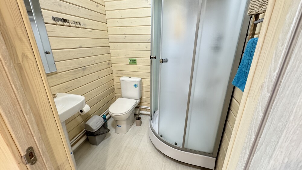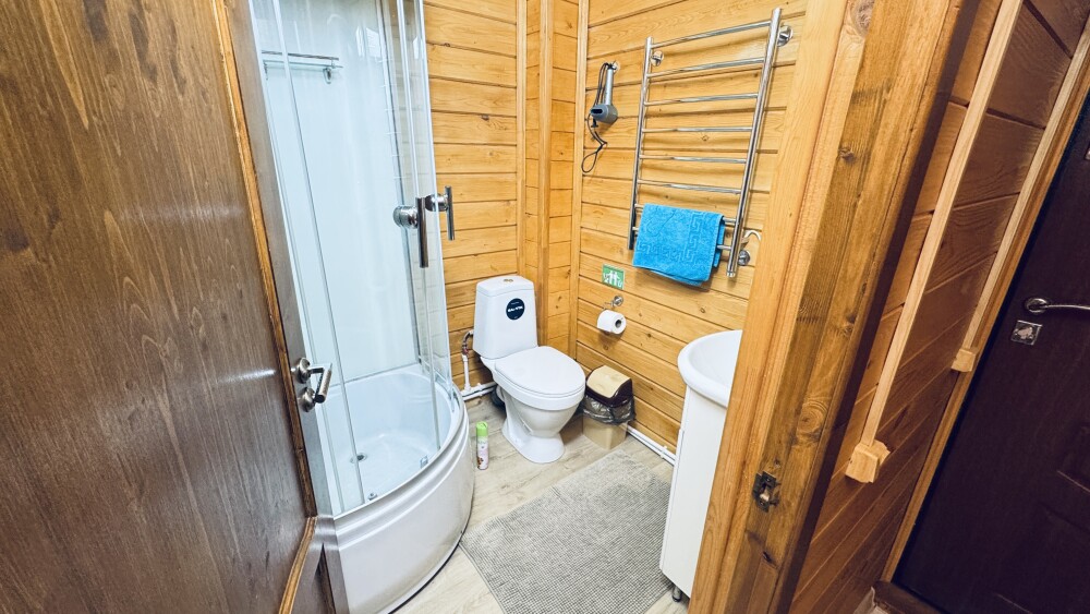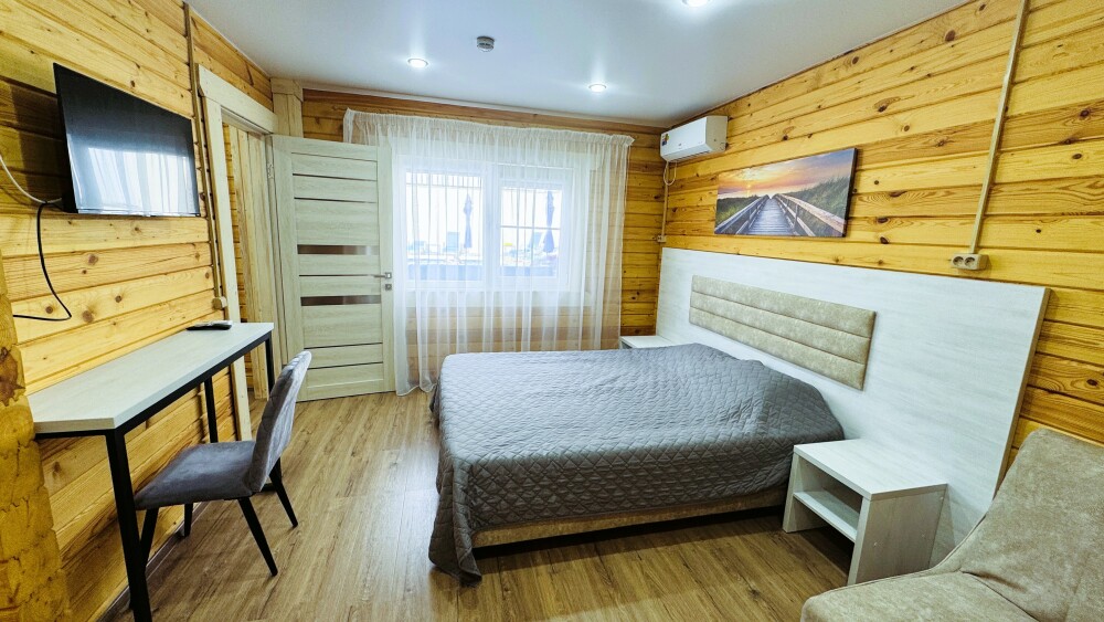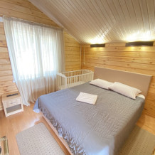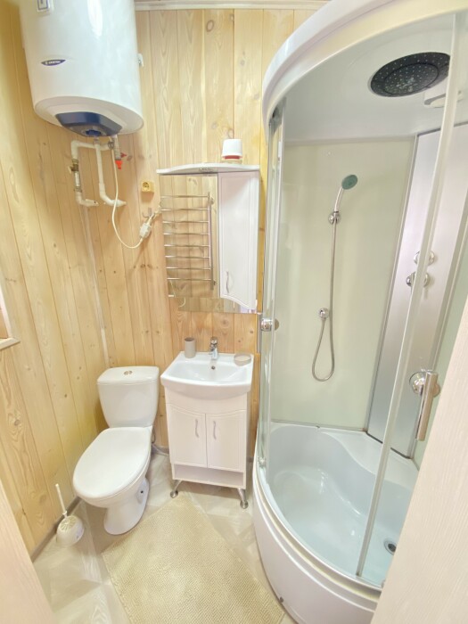 В номере большая двуспальная кровать (можно раздвинуть на 2 отдельные) + кресло-кровать. холодильник, сплит, телевизор. Рядом, за дверью, столики под столетним можжевельником, зона отдыха, общая кухня.