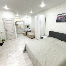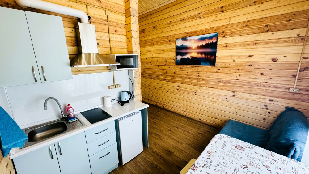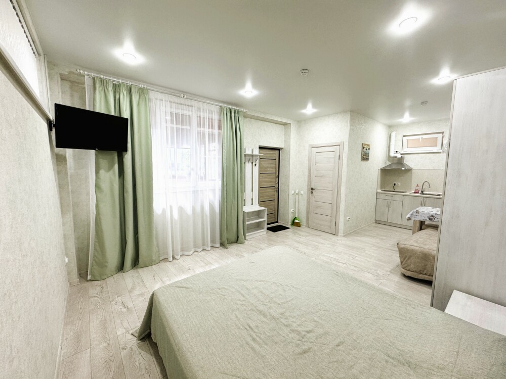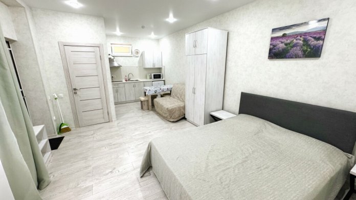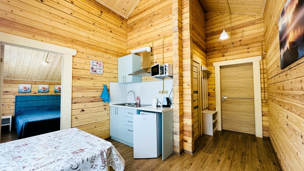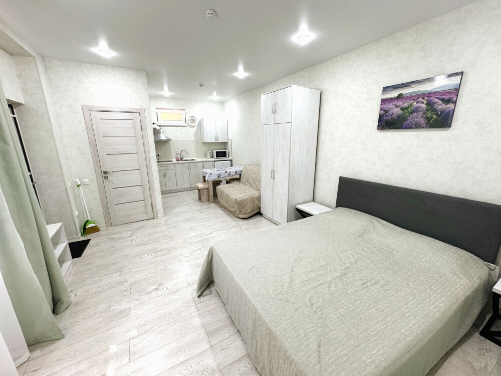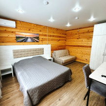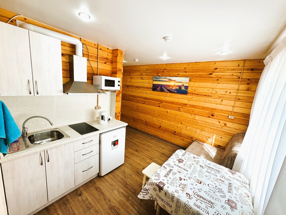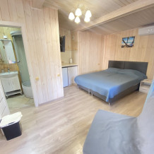 Люкс с собственной кухней. Кухня укомплектована всей необходимой кухонной техникой, посудой. В номере одна большая комната с двуспальной кроватью и ортопедическом диваном кроватью для двоих человек. Вторая комната-кухонная зона с дополнительным местом-креслом кроватью.
