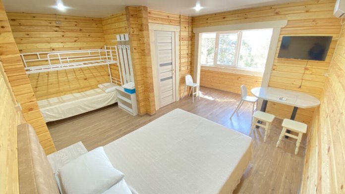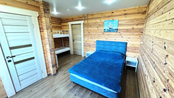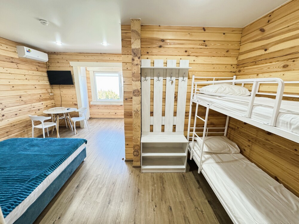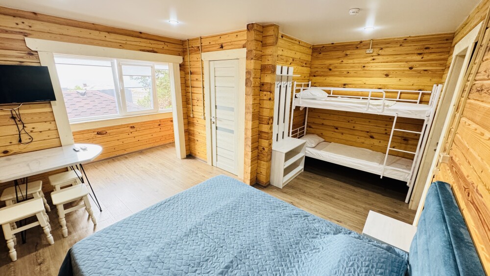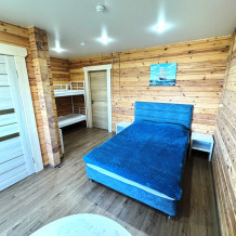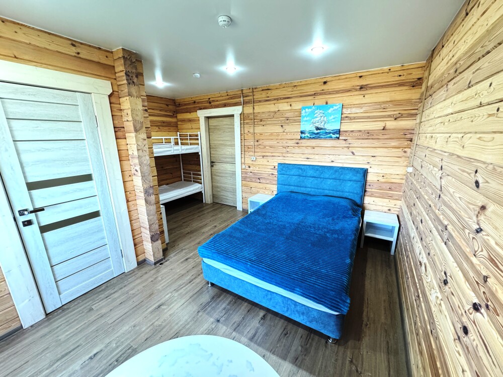 В номере расположена одна большая двуспальная кровать и двухъярусная кровать с двумя спальными местами длиной 200 см. и шириной 80 см.