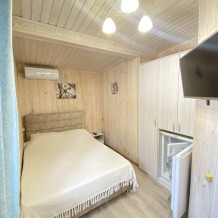 Небольшой, но очень уютный номер для двоих с отдельным входом, в домике под столетним можжевельником. В номере имеются все удобства: большая двуспальная кровать, отдельная уборная с душевой кабинкой, телевизор и сплит-система, чайник.