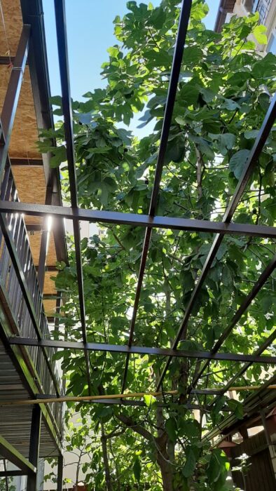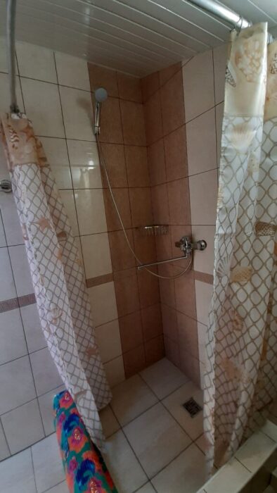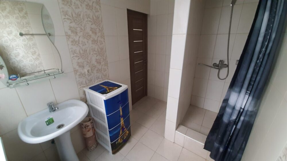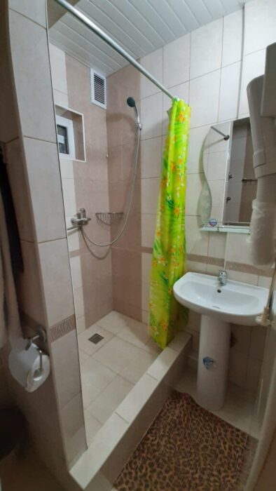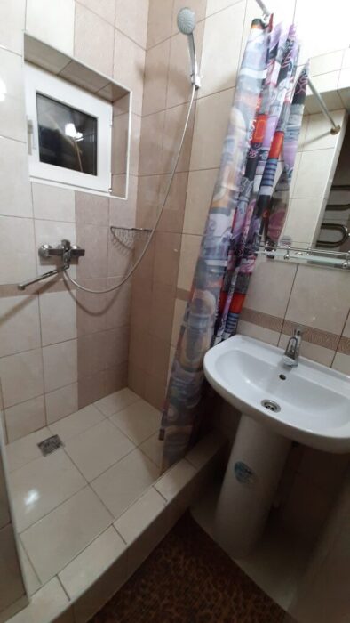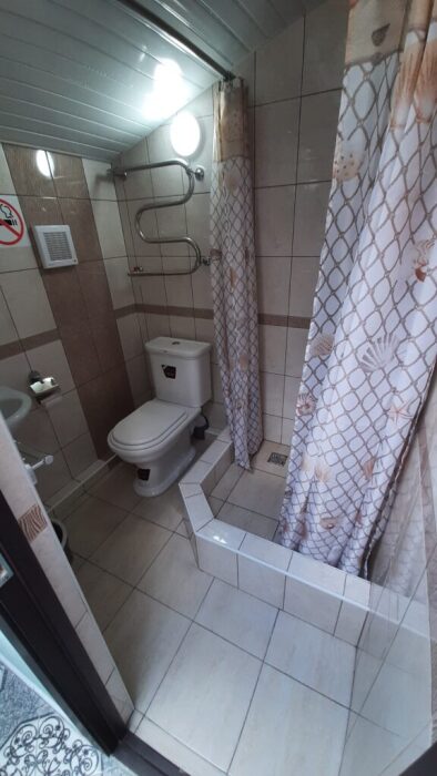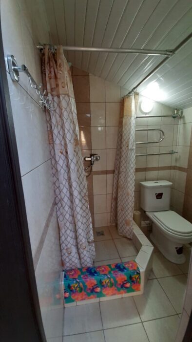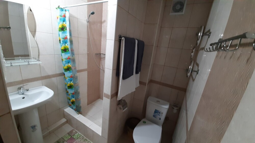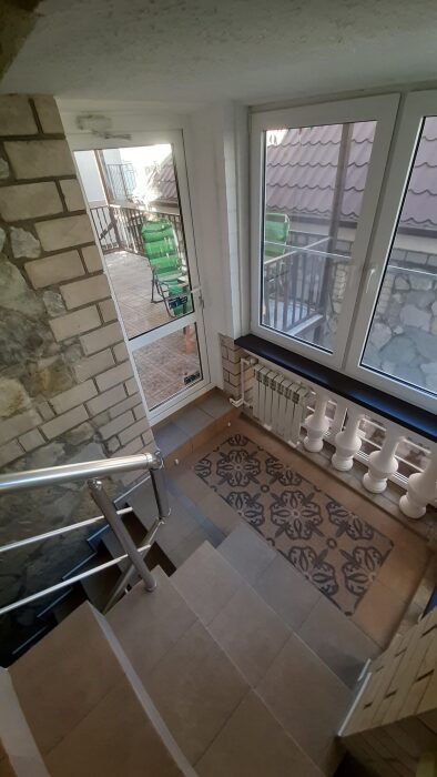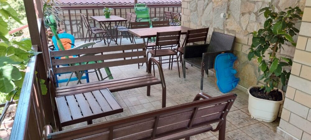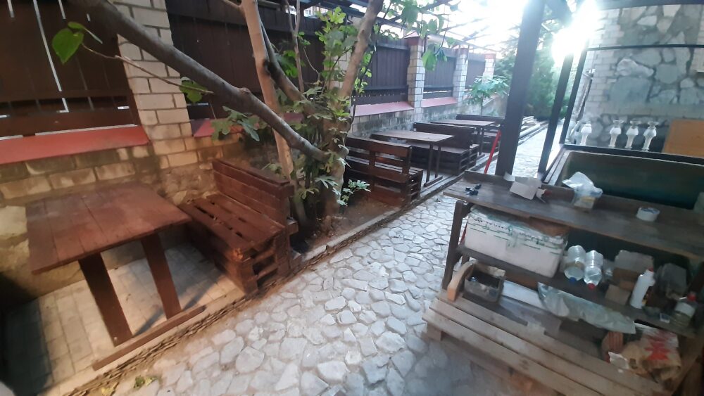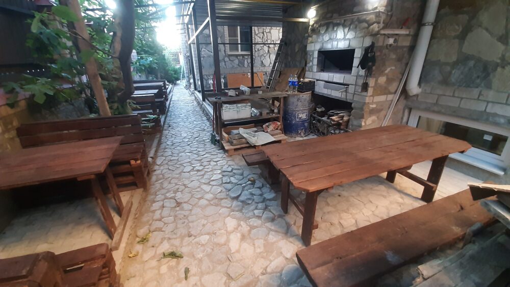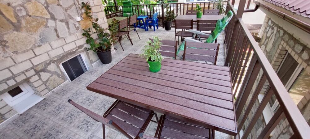 На террасе можно попить чай или кофе, или поработать на компьютере, ведь здесь ловит Wi-Fi, задушевно поговорить так же не возбраняется. Дворик гостевого дома наполнен зелеными туями, хвоей, сибирской сосной и можжевельником, оборудован трендовыми столиками и сиденьями из поддонов, собраны собственными руками и отполированы от заноз и заусениц. Капитальный закрытый каменный мангал сохранит тепло от углей и позволит аппетитно приготовить мясо на сетке или на шампурах. Каменная брусчатка на полу, столики и лавочки из дерева. Тень от большого дерева инжира создают непринужденную обстановку для посиделок с компанией друзей.
