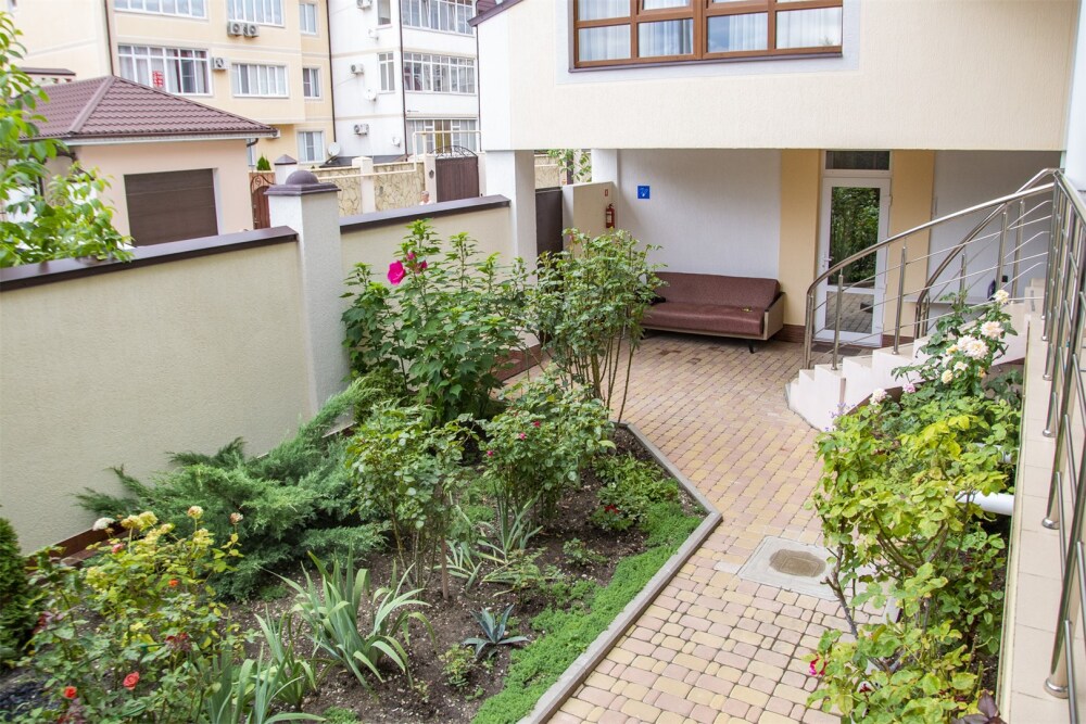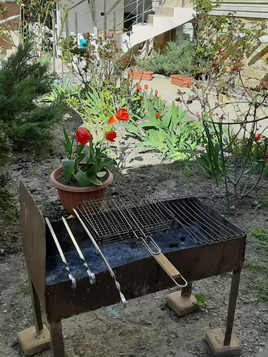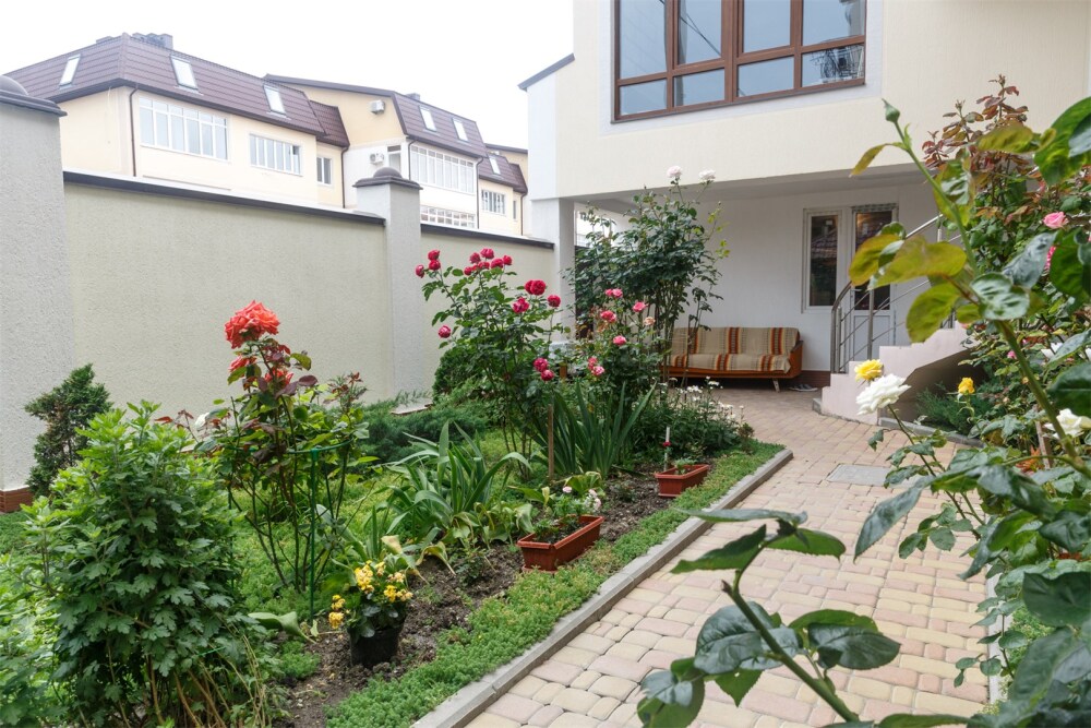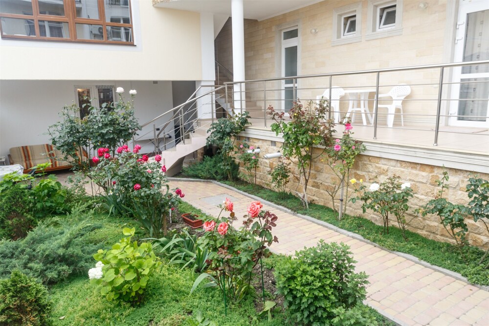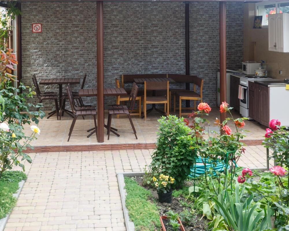 На территории для гостей работает бесплатный Wi-Fi. Двор очень зеленый, на территории клумба с цветами, есть газон и экзотические деревья. Для гостей доступна уютная беседка с кухней и мангал для приготовления шашлыка. К услугам гостей принадлежности для барбекю. Автопарковка на придомовой территории.